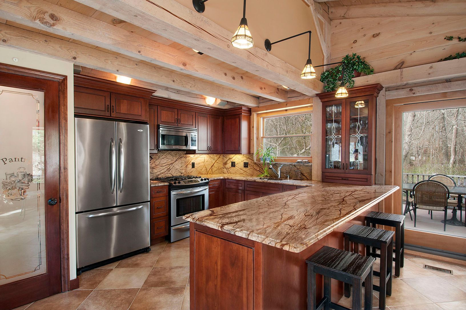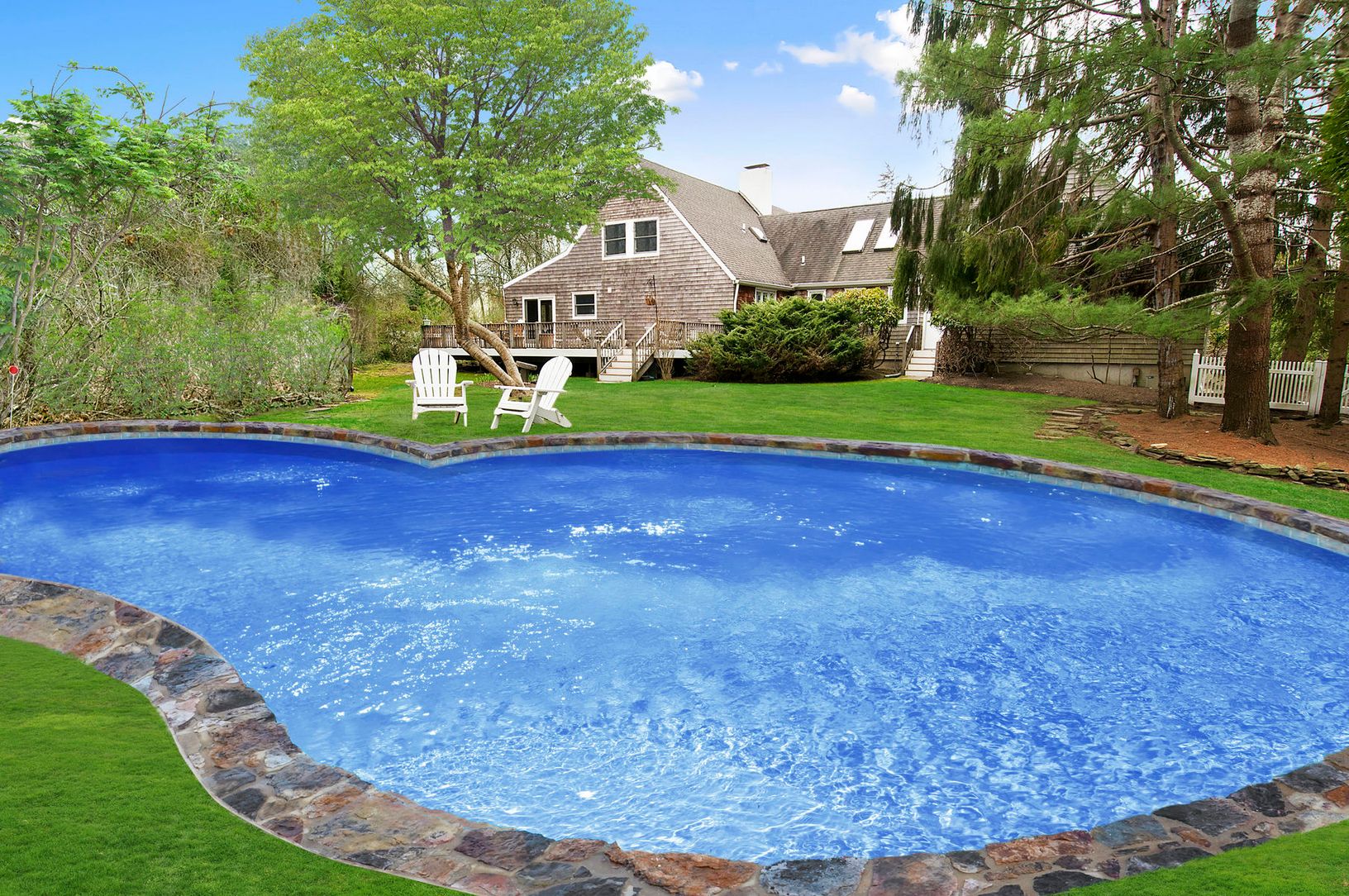 Drive up this attractively landscaped driveway to this beautifully maintained and secluded Post & Beam home. Remodeled in 2008, soaring ceilings, a custom stone fireplace, marble and cherry eat-in kitchen, 4 bedrooms and 4 baths and a private guest wing and extra room. Expansive decking off the kitchen and separate dining area for outdoor entertaining and relaxing. The freeform Gunite heated pool is nestled among towering pines and, if des