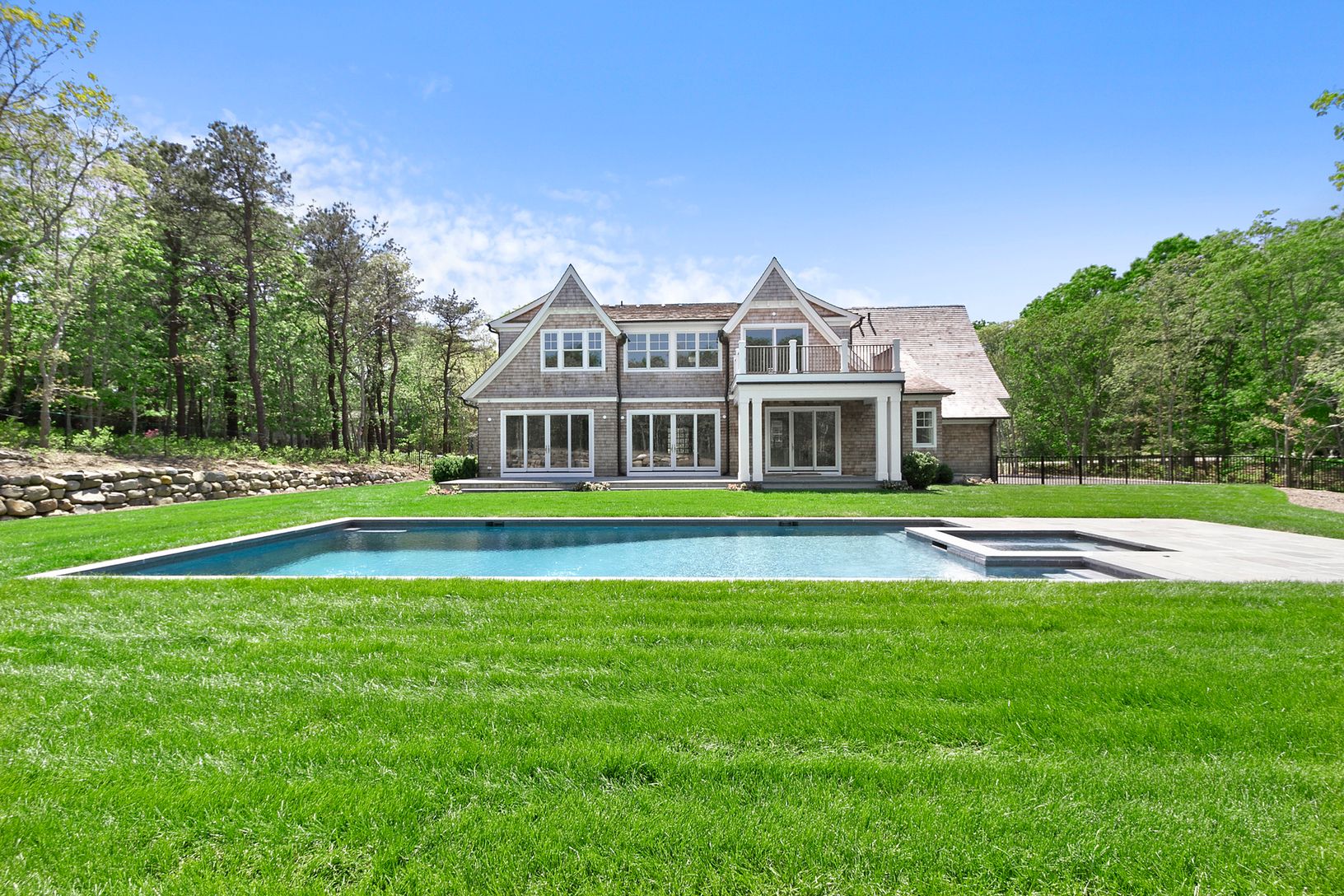 Set on a secluded 1.24 acres in Sagaponack north minutes from Wolffer Estate Vineyard and Sagg Main Beach, this recently constructed 5,000 square foot 6 bedroom, 7.5 bath shingled, custom traditional features a heated gunite pool, house, attached 2-car garage. A bright double-height foyer with raised paneling and glass balustrades leads to a great room and living room with fireplaces and French doors to the rear patio with gas fireplace and t