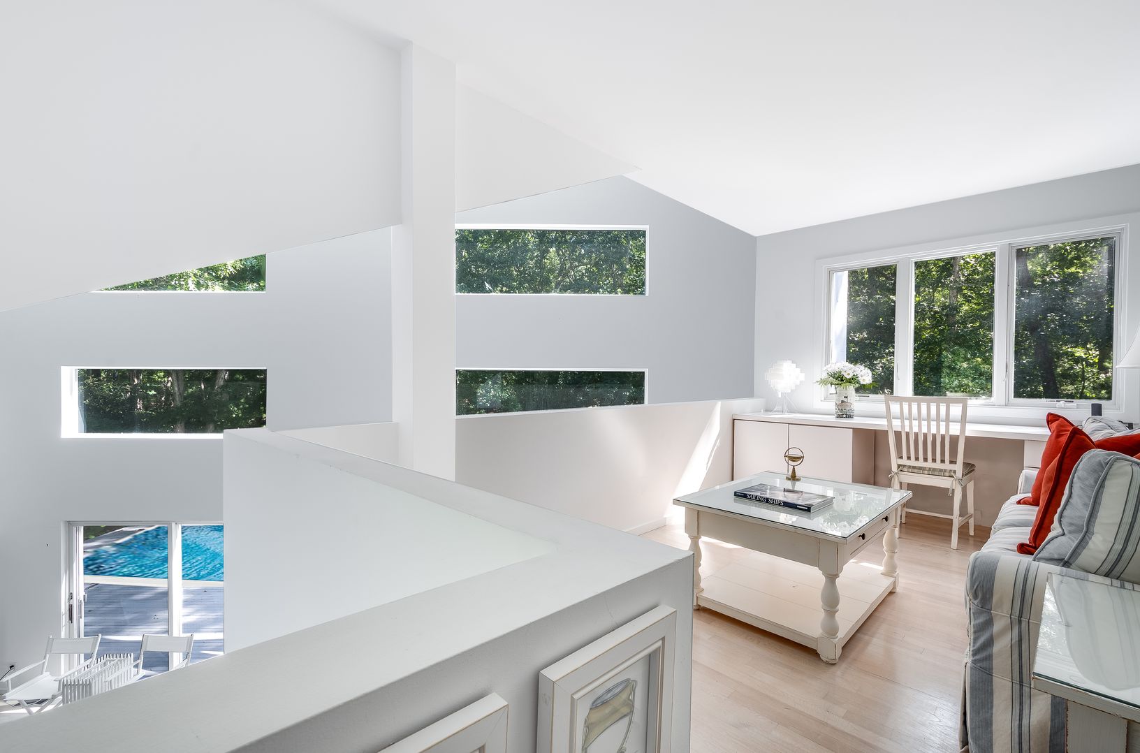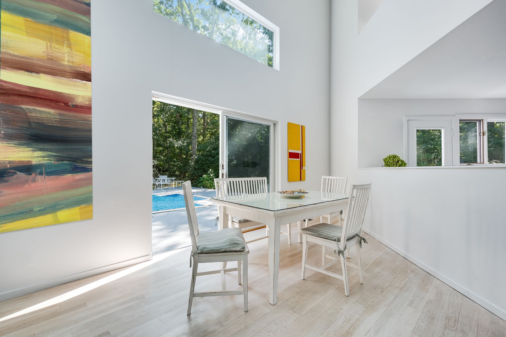 Located just moments away from Three Mile Harbor and Cedar Point Park, this wonderful modern home, set on 1.7 acres, is the perfect Hamptons retreat. The home features 1740 sq ft of living space with an attached 260 sq ft one-car garage. Upon entry, you are welcomed into a brilliant living and dining space with soaring ceilings, a wall of south facing windows and sliders that lead to the back. A wood burning fireplace centers the expansive roo