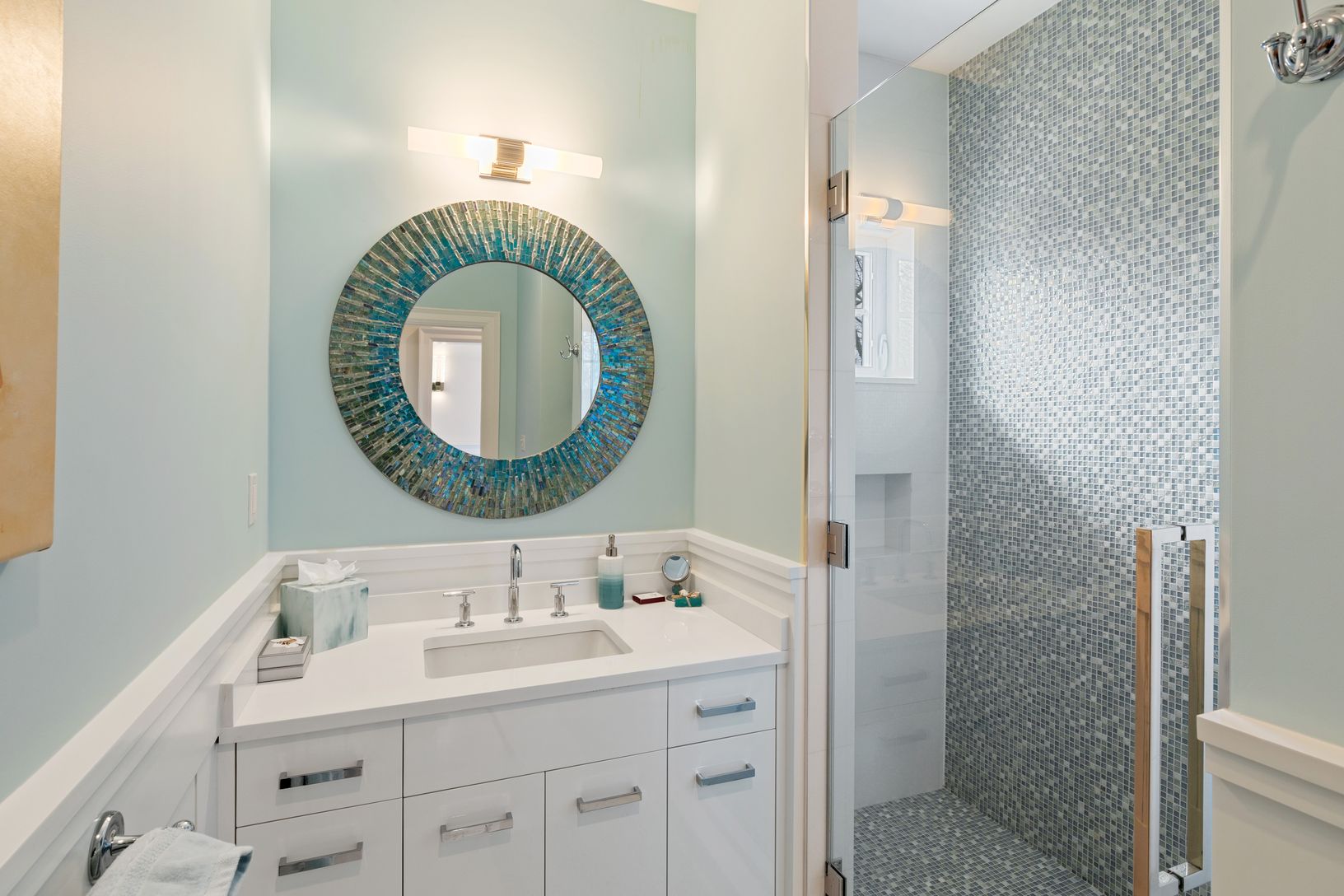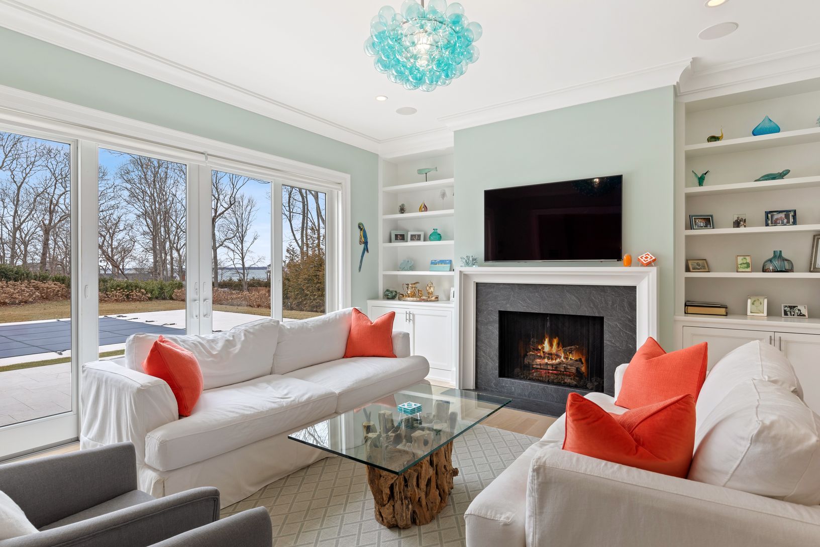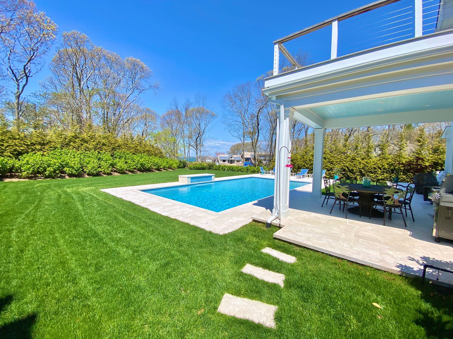 You can enjoy this new Farrell-built, water view five bedroom, five bath home on .45+/- acre in Southampton. Built in 2017, the 3,600+/- sq. ft. home has all you need for the perfect Hamptons summer. Located just half a block to a private bay beach, you can moor your boat a block away. Entertain in the state of the art custom kitchen with lighted cabinets and quartzite counters, on the marble patios, or in the walkout lower level with wet ba