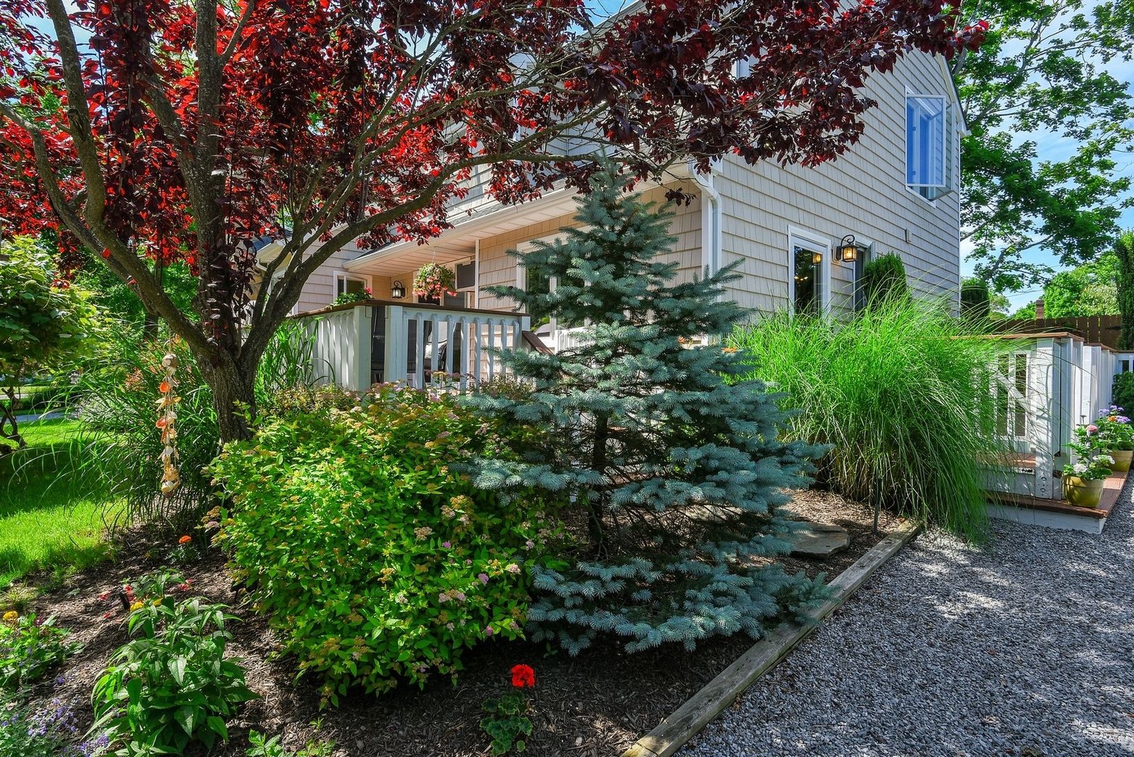 Pristine contemporary home with meticulously maintained park-like grounds on 1.3 acres. This move-in ready 2,200 square foot home is located south of Montauk Highway and features four bedrooms, two baths, kitchen with new stainless steel appliances, hardwood floors throughout, dining room, light-filled living room with vaulted ceilings, two skylights, stone wood-burning fireplace,and loft. There is a detached 1.5 car garage and a two stall bar