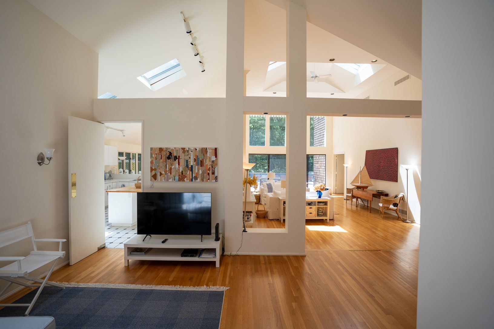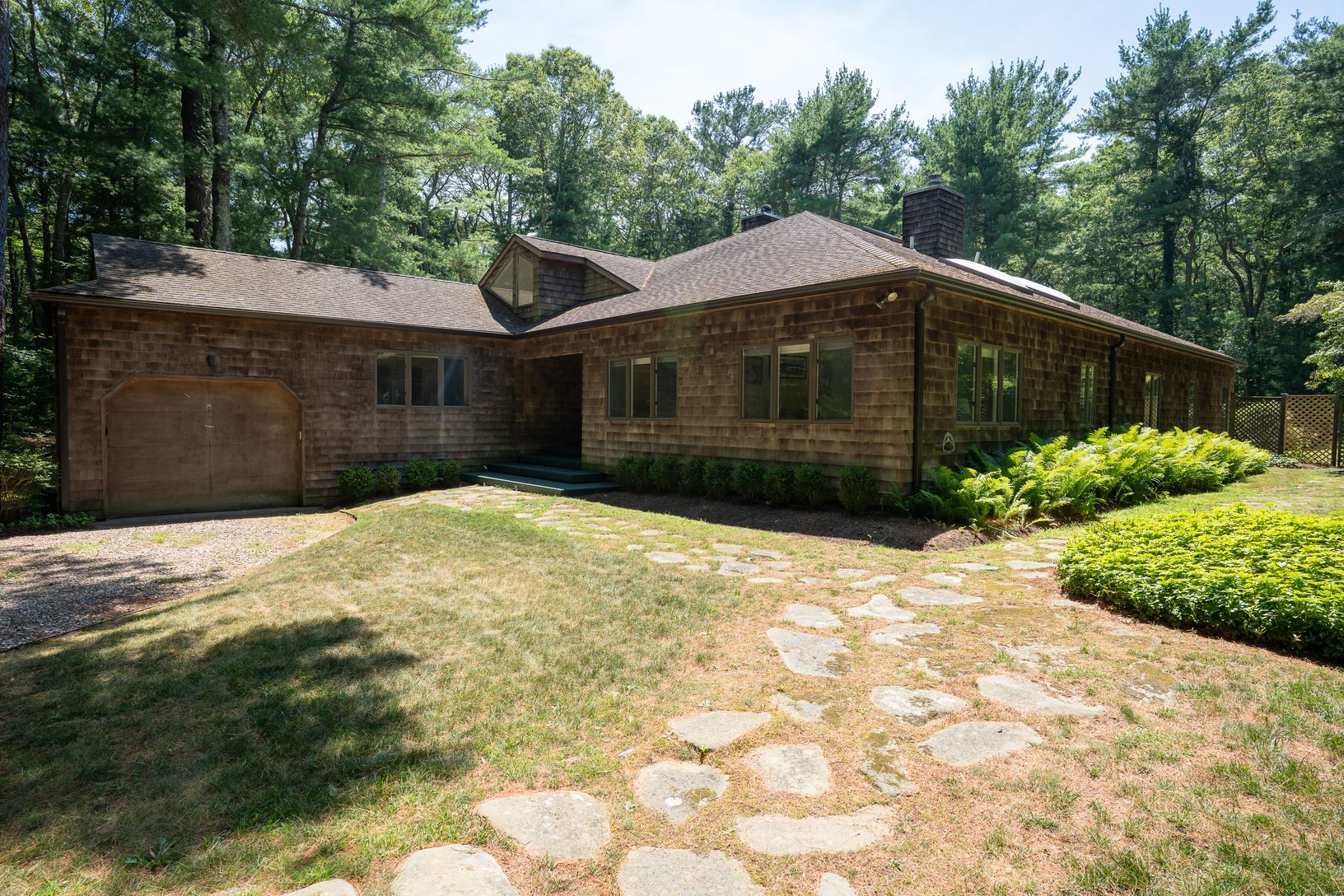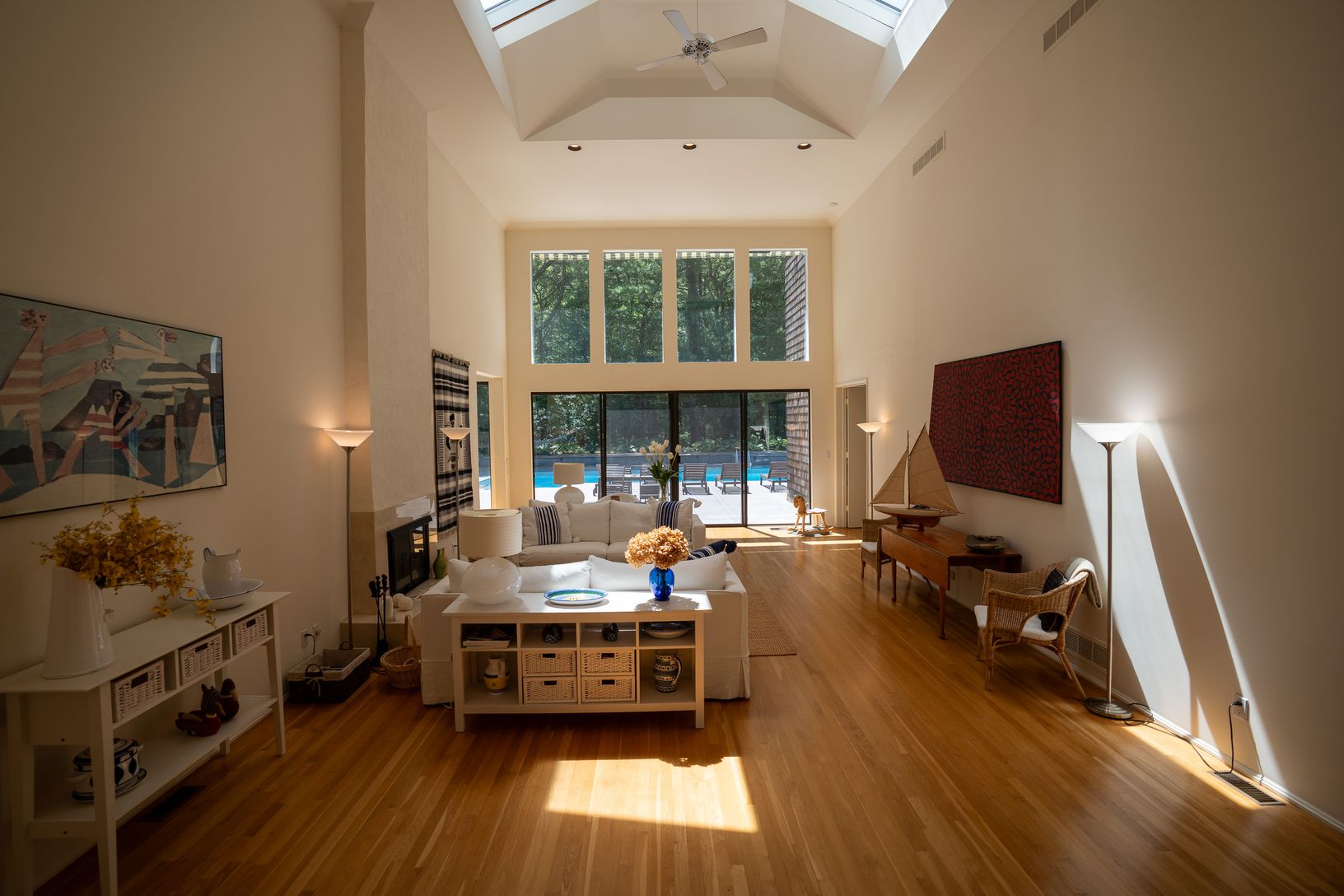 Sun-drenched 4-bedroom, 4-bath contemporary is set on 2 private acres just minutes from East Hampton Village and ocean beaches. The open layout features soaring ceilings, a double-sided fireplace, and an updated kitchen flowing seamlessly into bright living and dining spaces. Outside, expansive new decking surrounds a heated pool and lush gardens, perfect for lounging or entertaining. Nestled on a quiet cul-de-sac.