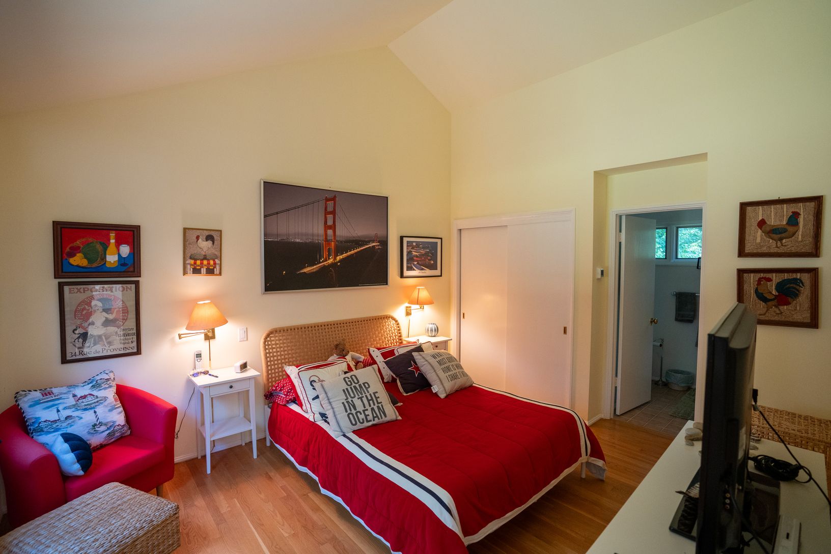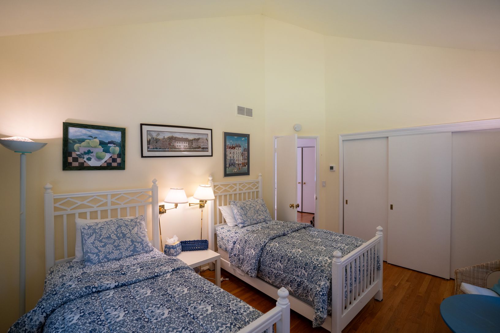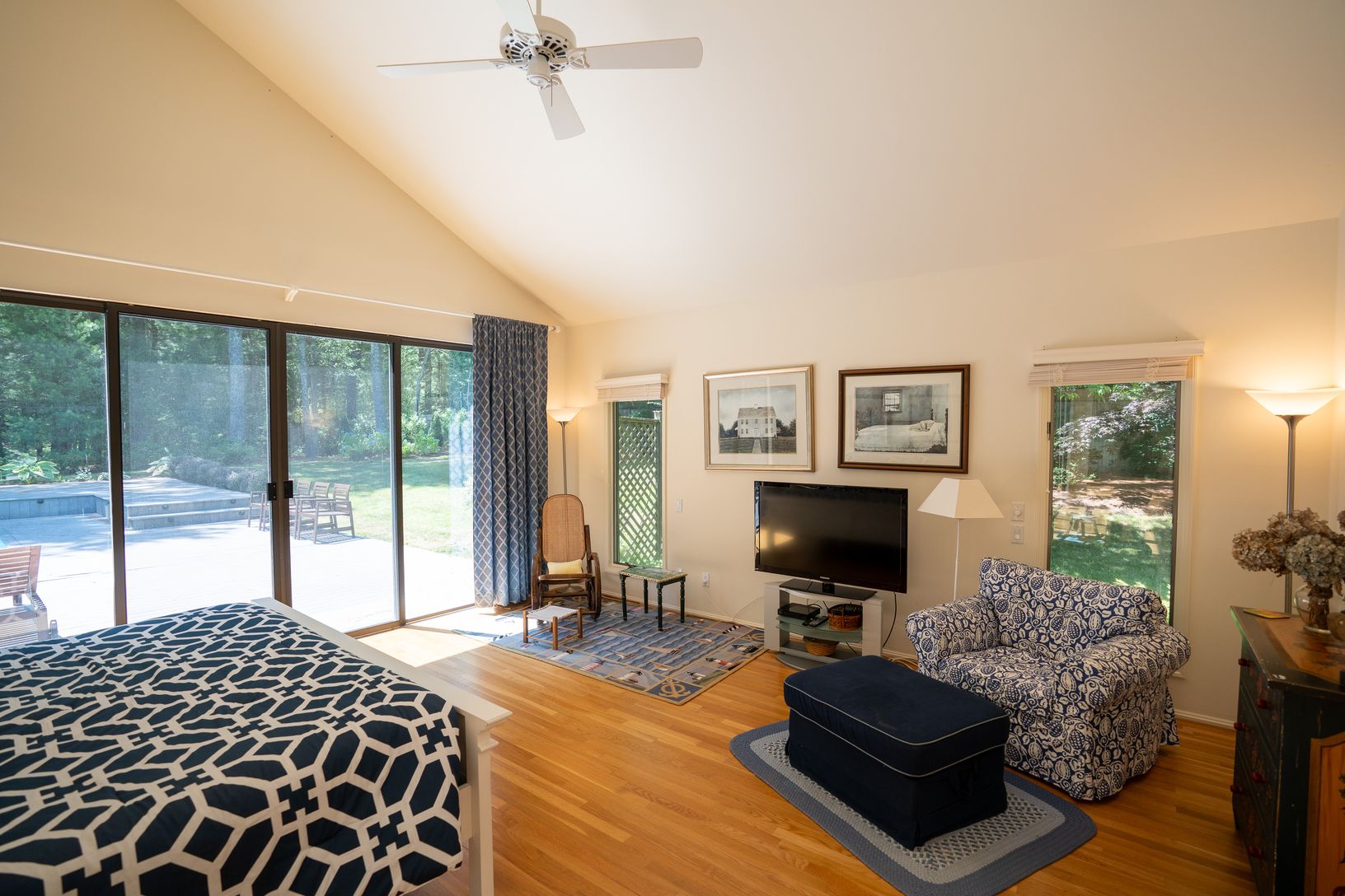 Sun-drenched 4-bedroom, 4-bath contemporary is set on 2 private acres just minutes from East Hampton Village and ocean beaches. The open layout features soaring ceilings, a double-sided fireplace, and an updated kitchen flowing seamlessly into bright living and dining spaces. Outside, expansive new decking surrounds a heated pool and lush gardens, perfect for lounging or entertaining. Nestled on a quiet cul-de-sac.