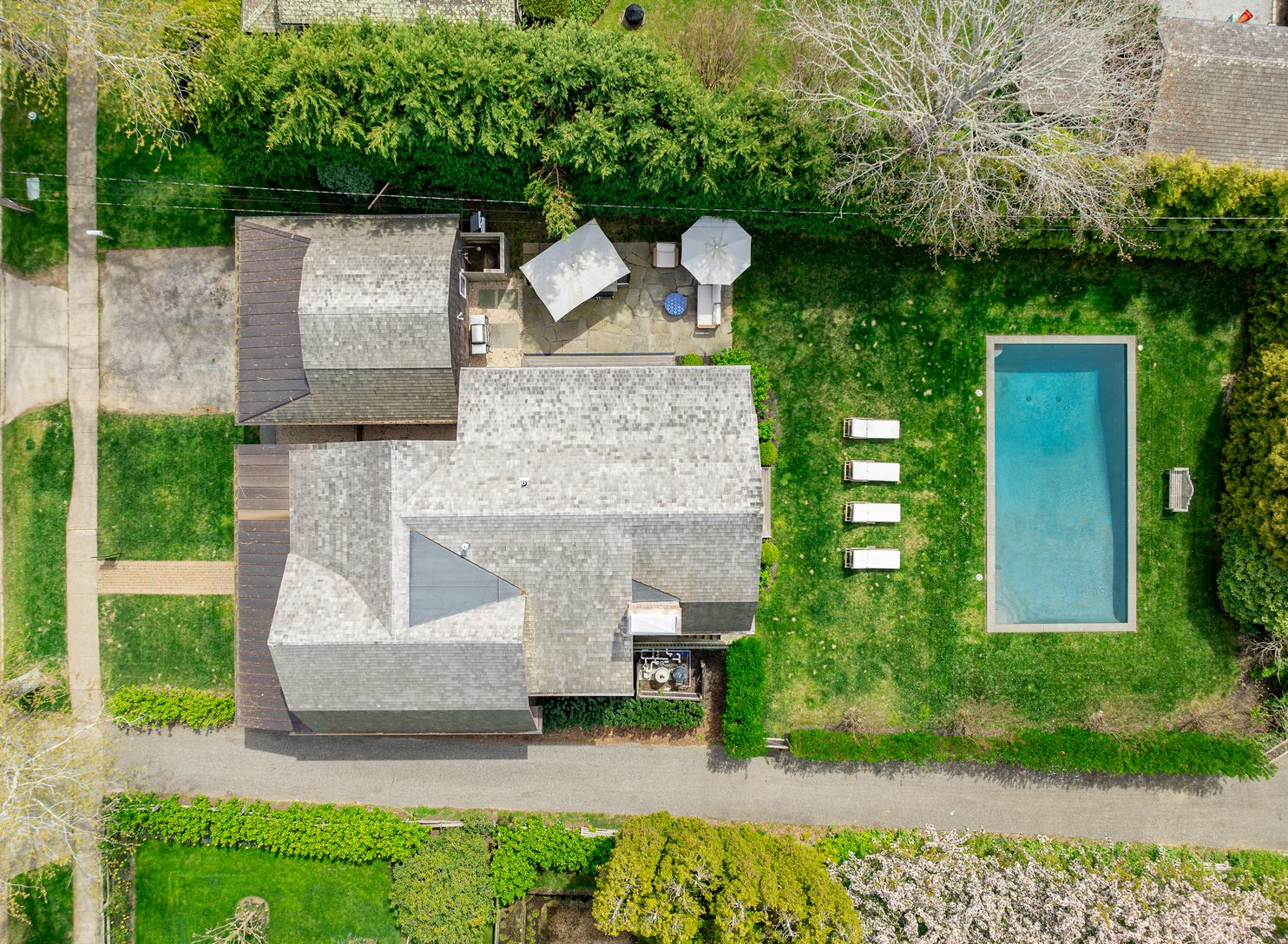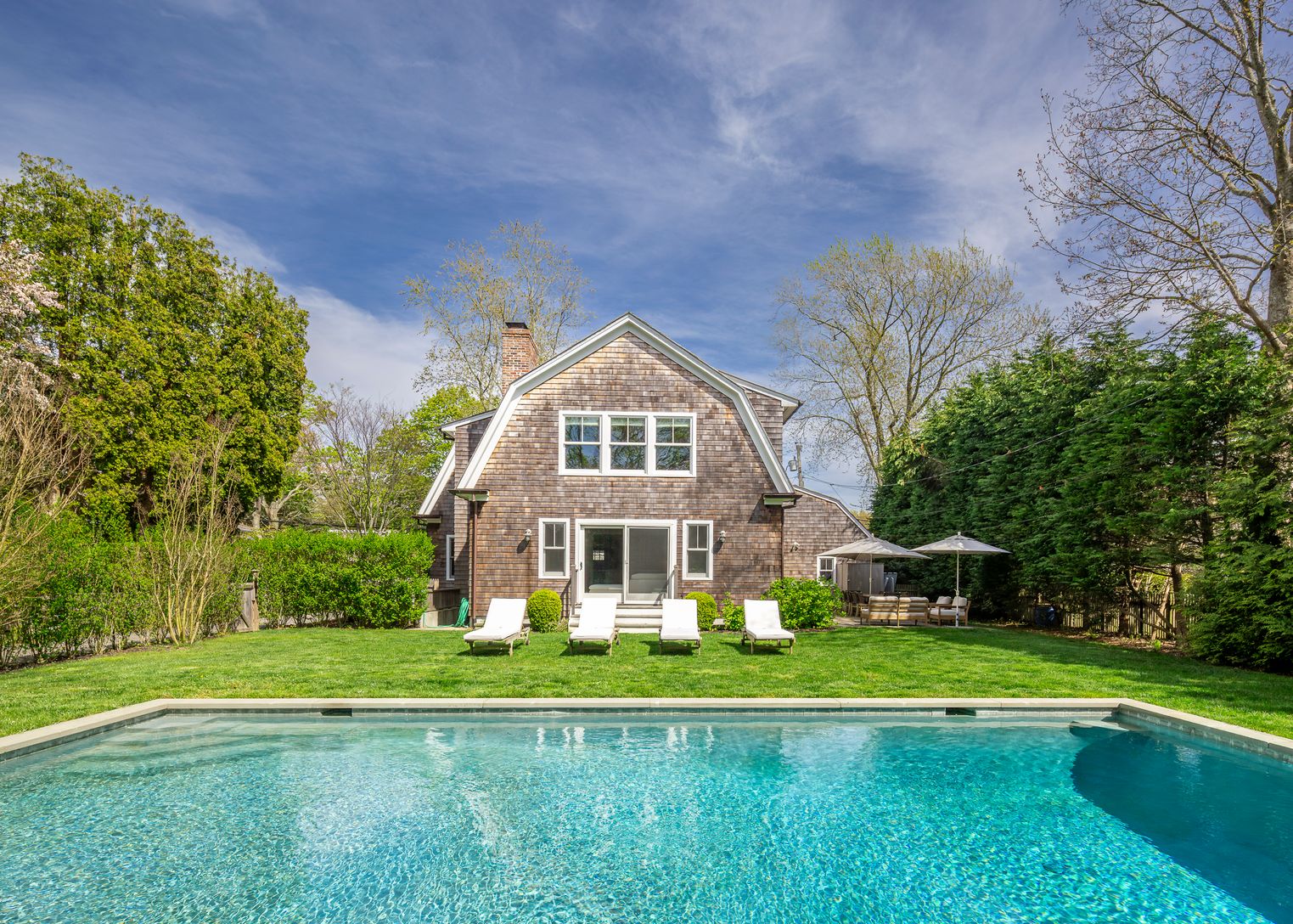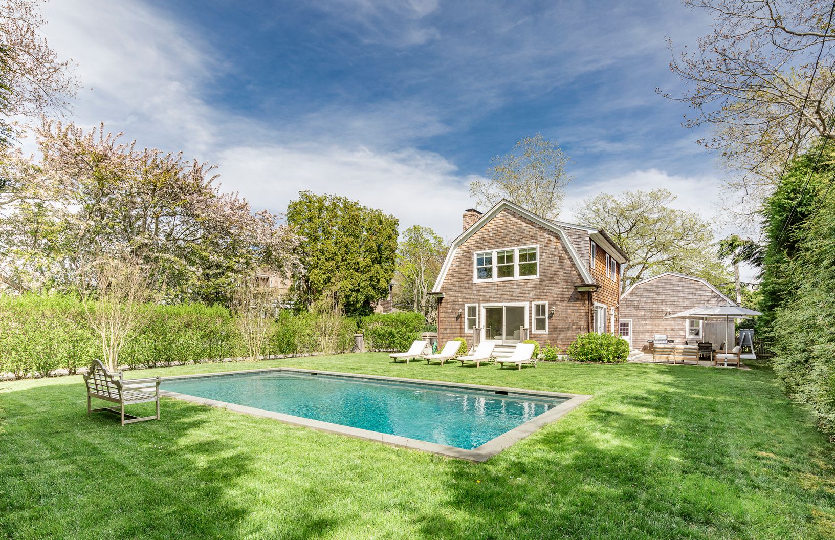 Located on an iconic East Hampton Village lane is this incredible home with 5 en-suite bedrooms, plus 2 half baths. Luxe beach vibe décor surrounds you in comfort and style. Open concept living with first floor living room, dining area, centralized cook's kitchen and an oversized den that leads outdoors to secluded grounds with a heated, gunite pool, large patio and an outdoor shower. Upstairs find a spacious primary bedroom with sitting area