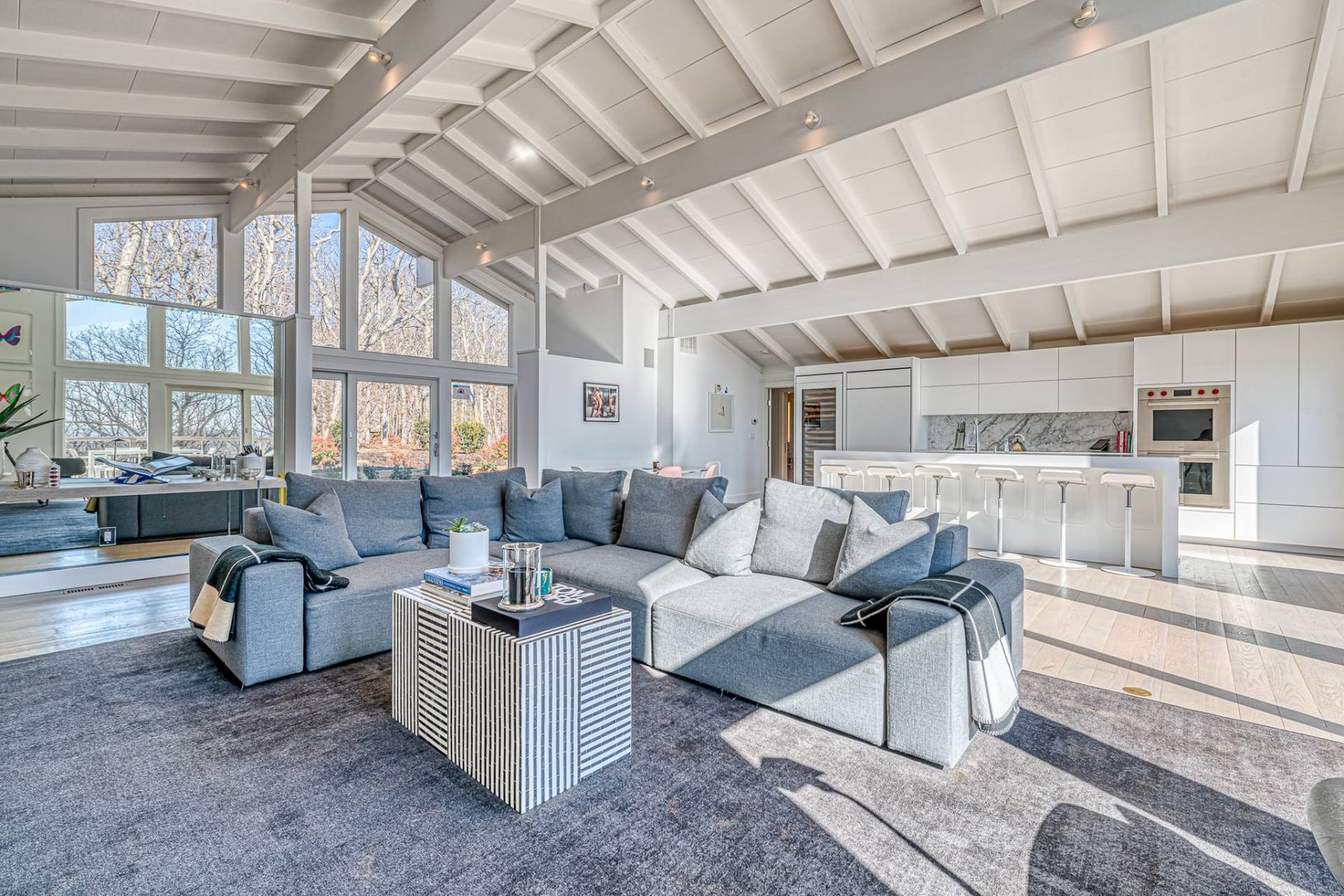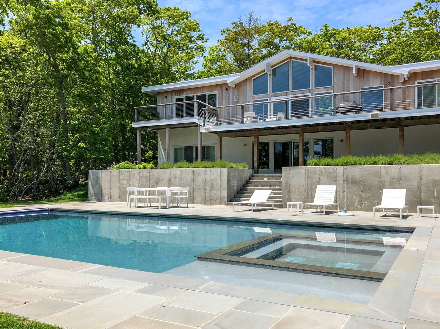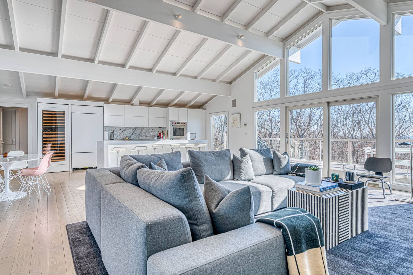 Make memories in this beautifully renovated home in Montauk, surrounded by nature on a just-shy acre with ocean views. Ideal for entertaining indoors or out, the home's bright and stylish open living areas have high cathedral ceilings, windows on two levels and are flooded with natural light. A wall of windows and glass doors frames the views and opens to spacious decking overlooking the pool area, lush green woodland and the ocean. A central