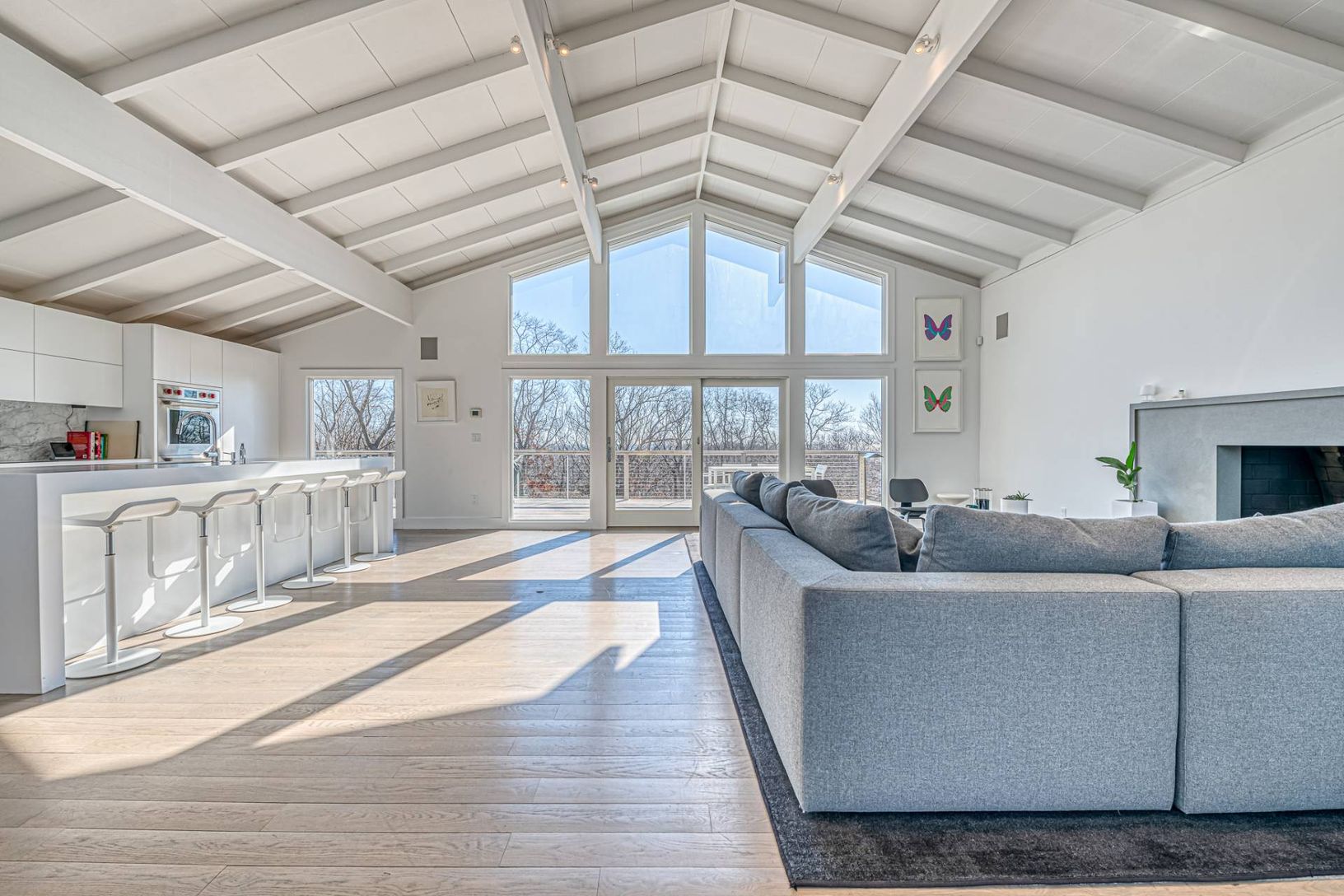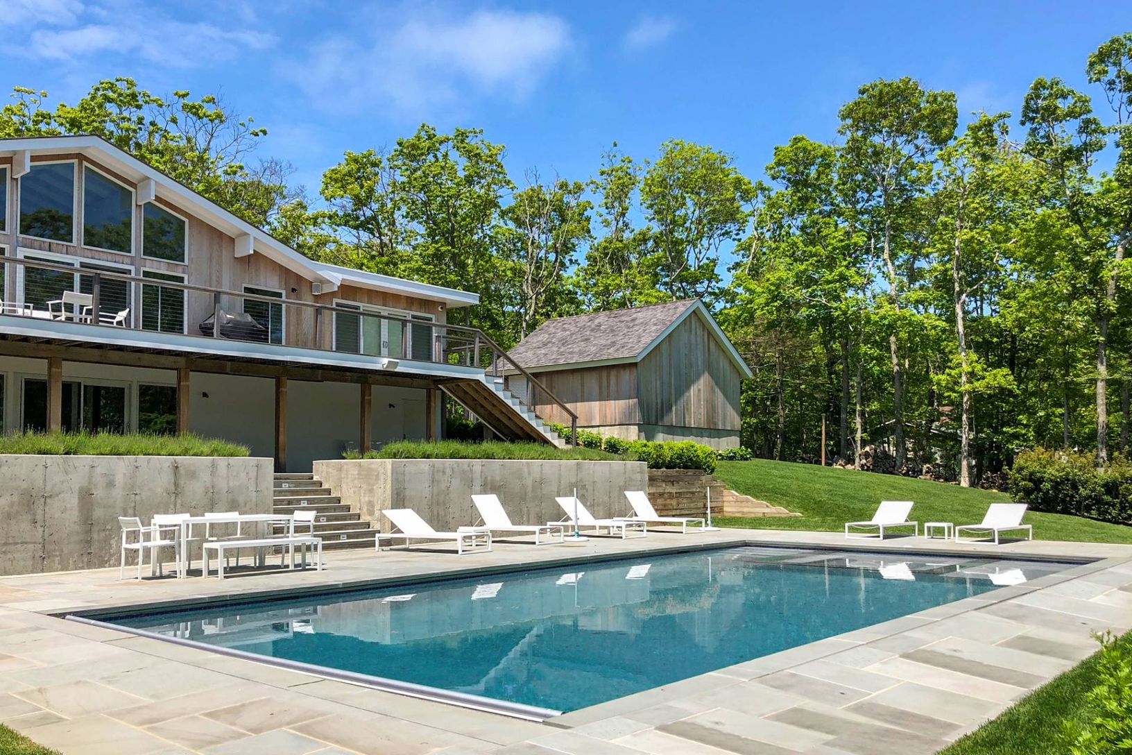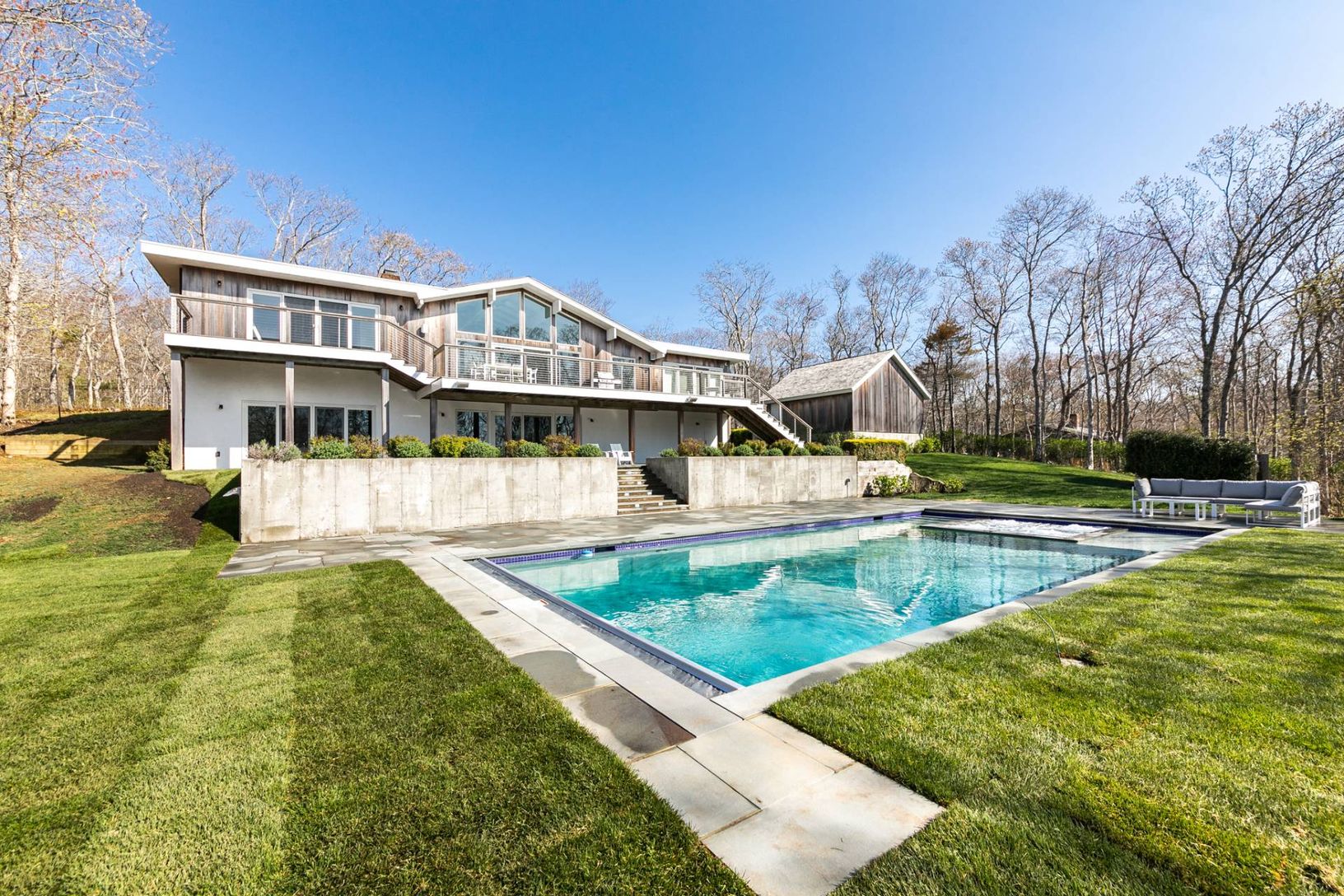 Make memories in this beautifully renovated home in Montauk, surrounded by nature on a just-shy acre with ocean views. Ideal for entertaining indoors or out, the home's bright and stylish open living areas have high cathedral ceilings, windows on two levels and are flooded with natural light. A wall of windows and glass doors frames the views and opens to spacious decking overlooking the pool area, lush green woodland and the ocean. A central