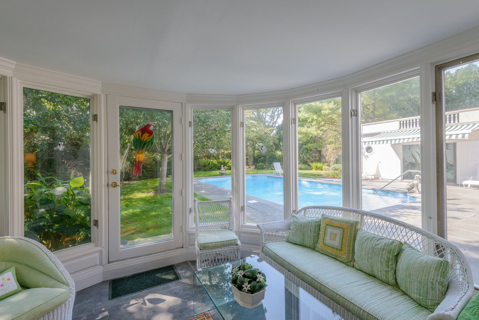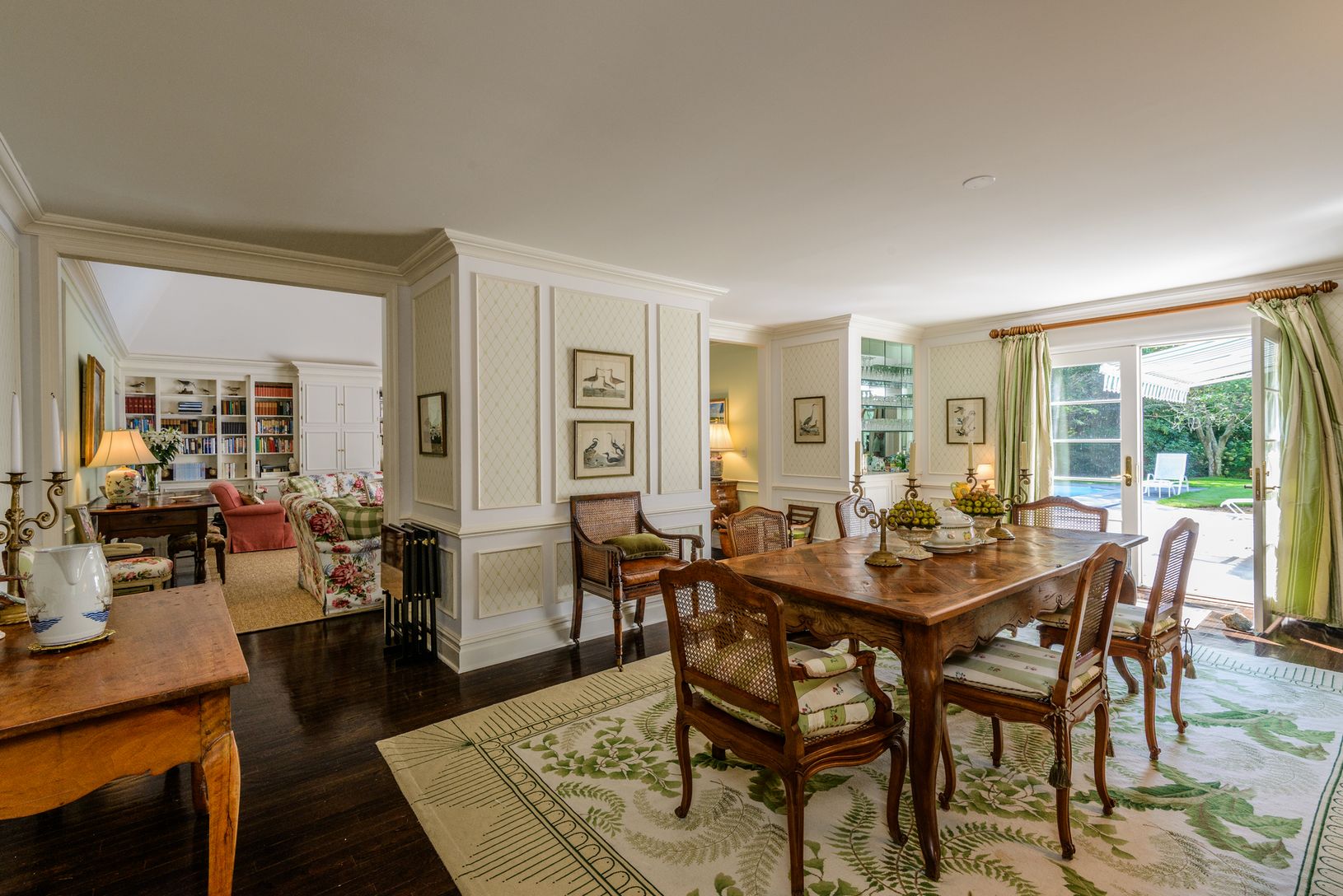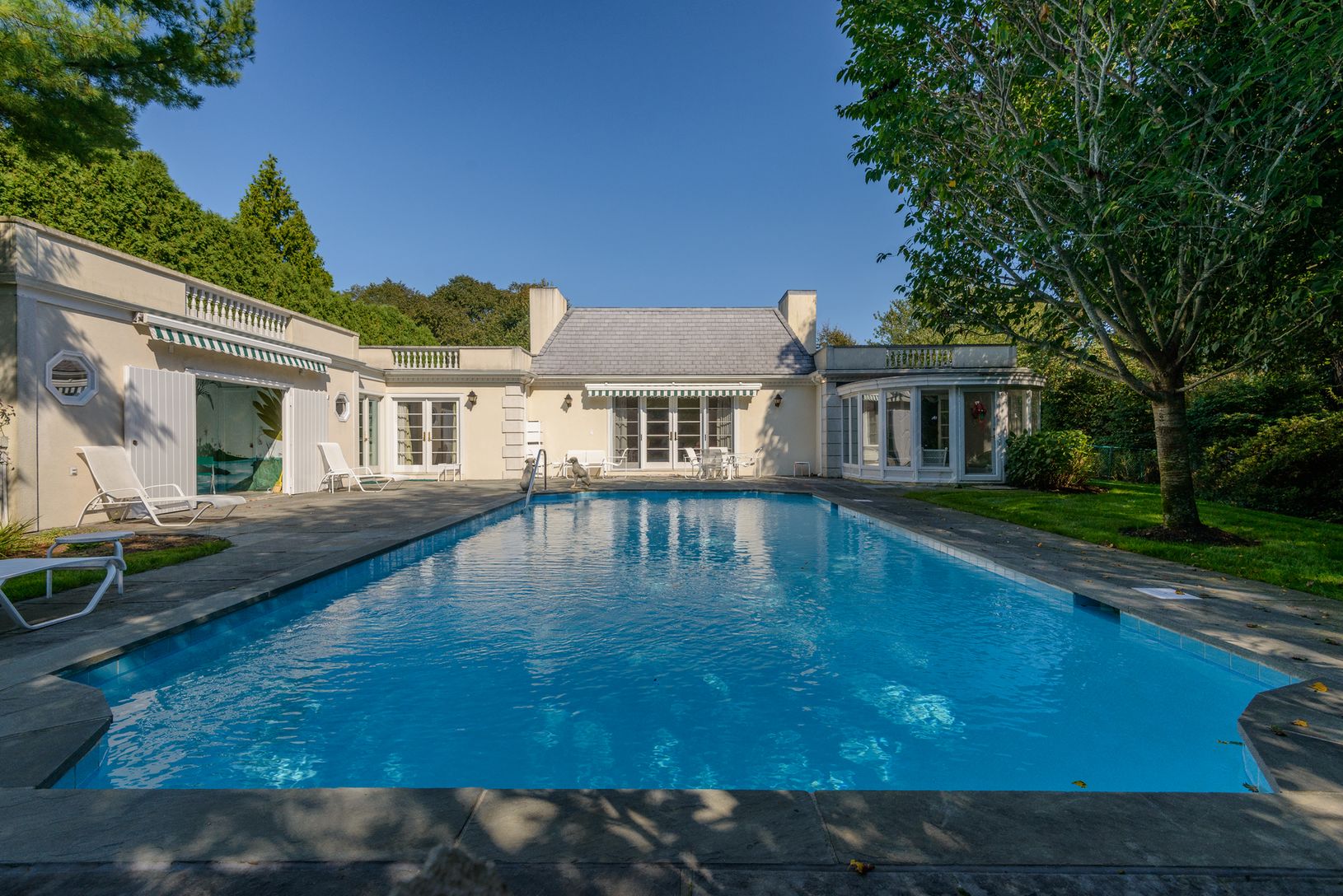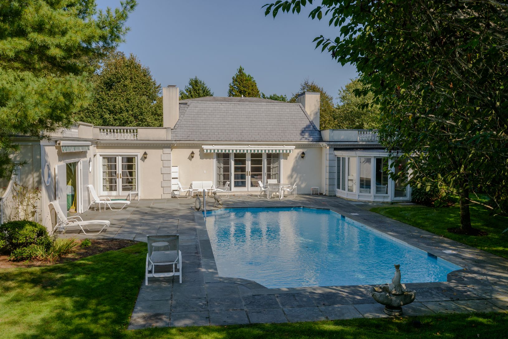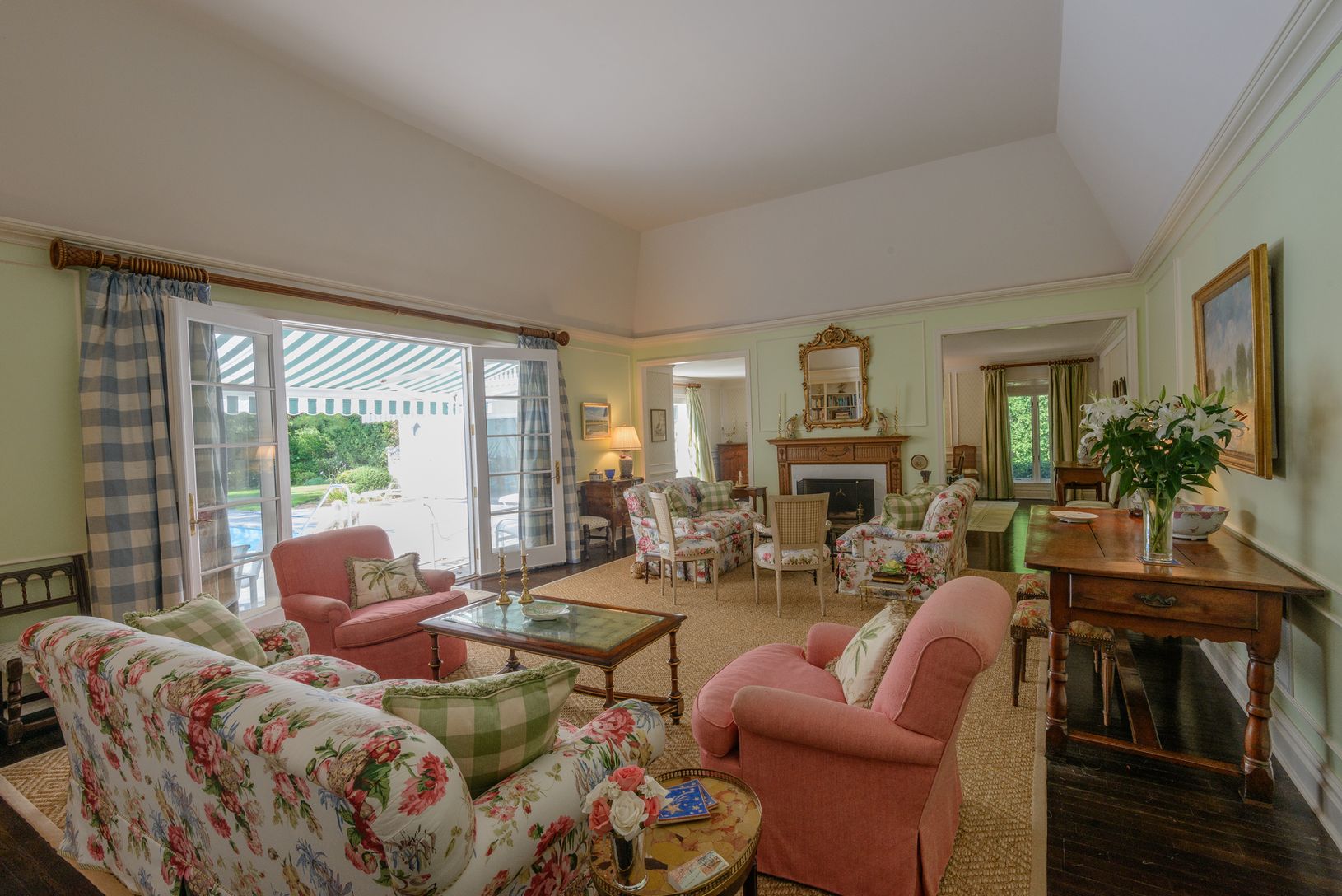 A rare and wonderful opportunity to own a classic French mansard-style home in Southampton's estate section, this half-acre property, tucked away on a cul-de-sac and protected by high hedges, features this stucco-sided home with five bedrooms, five baths, sun-filled patio, heated Gunite pool, cabana, and guest house. Beautifully maintained, with dark hardwood floors, the front entry leads to the tray-ceiling living room with fireplace and dini
