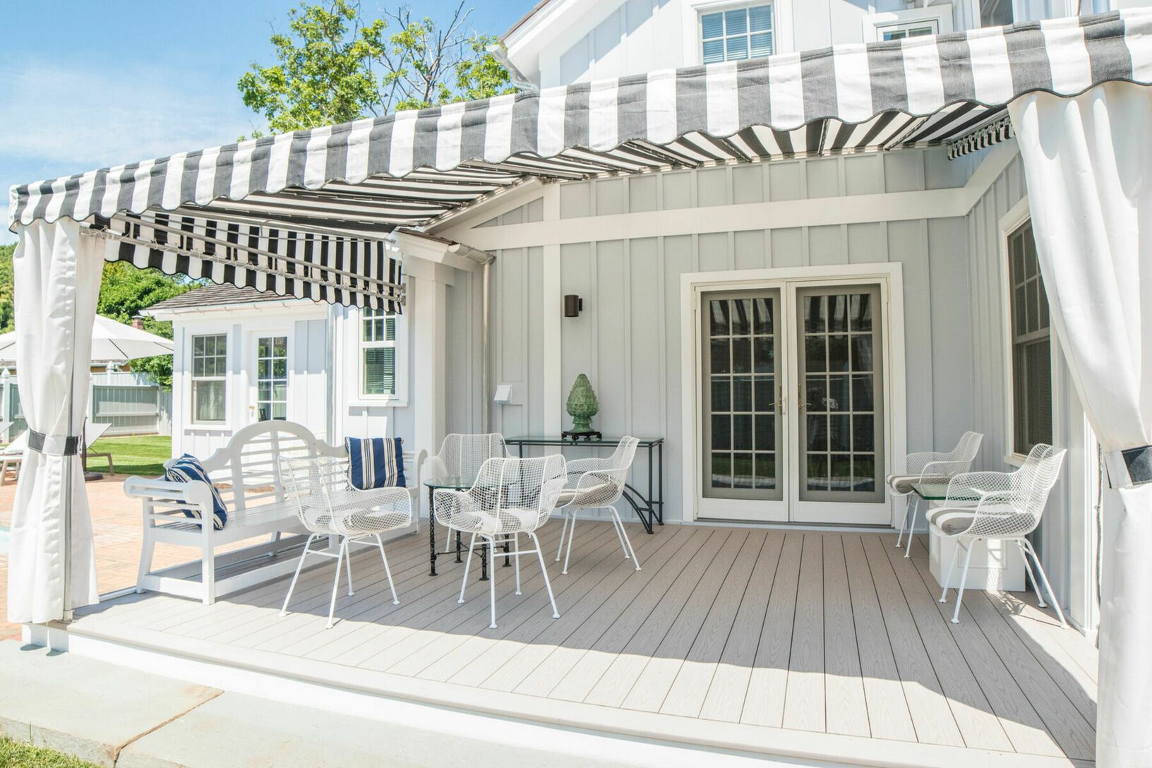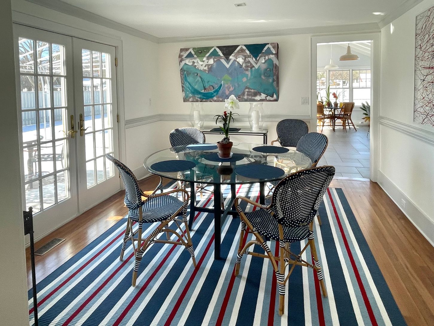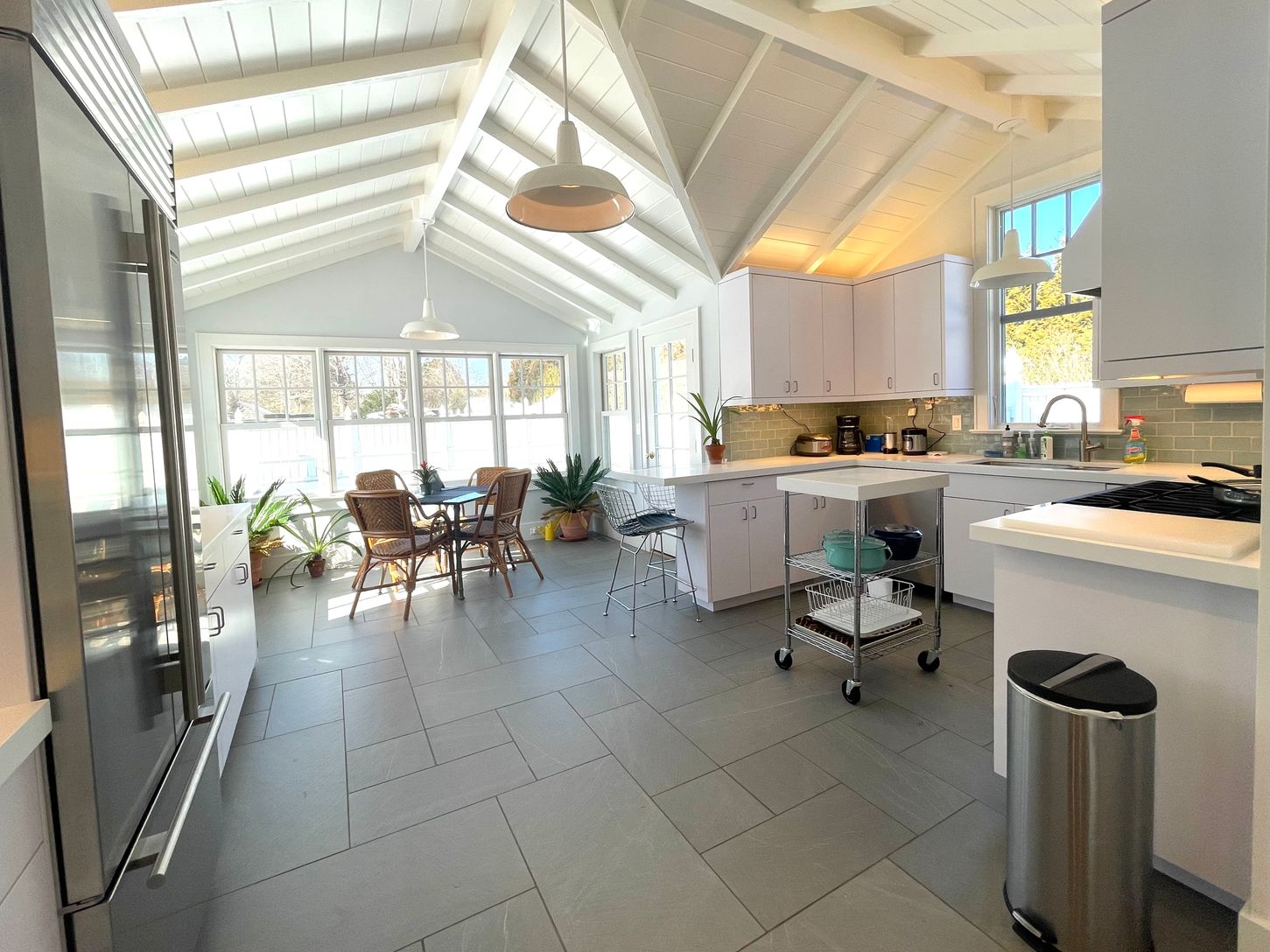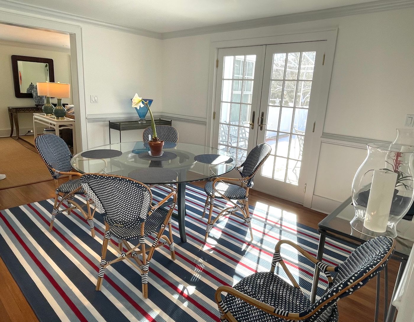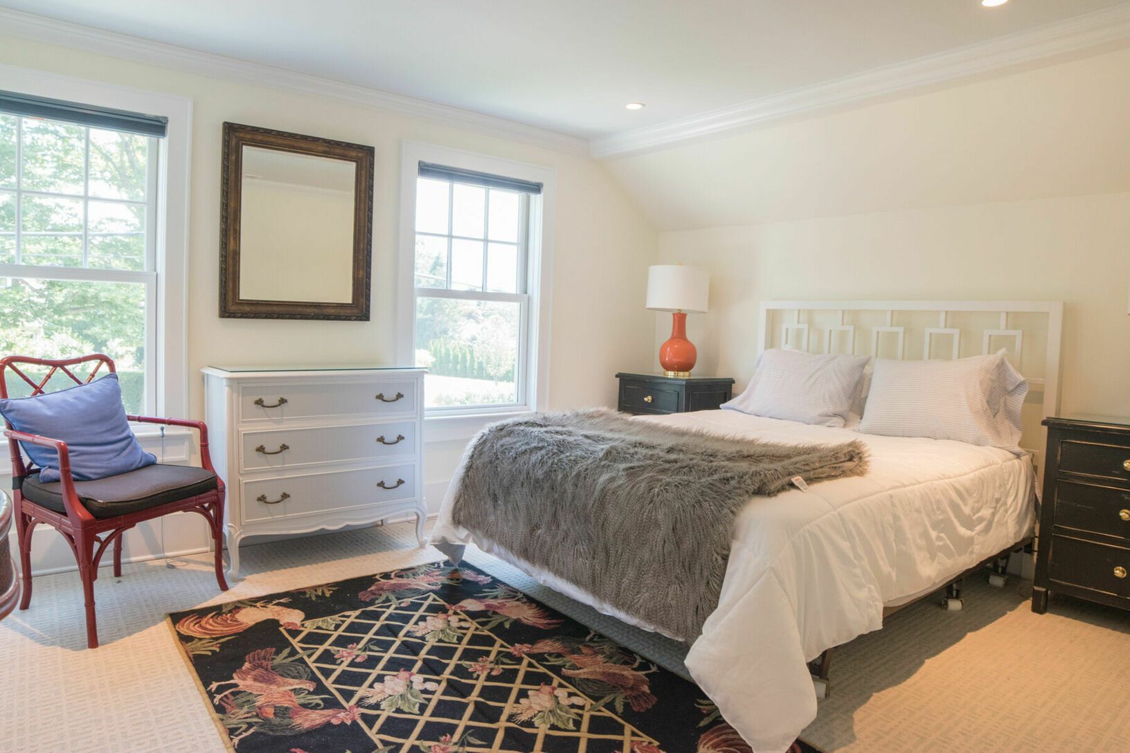 This renovated and tastefully decorated cottage features a formal entry to the living room with separate dining room opening to a canvas covered deck. An elegant eat-in kitchen, a new mudroom and another deck with views of the heated gunite pool. There is also a den with sofa bed for extra guests, bathroom and laundry room. The primary suite boasts a fireplace and new soaking tub full bath. The second floor has three guest bedrooms and a new s