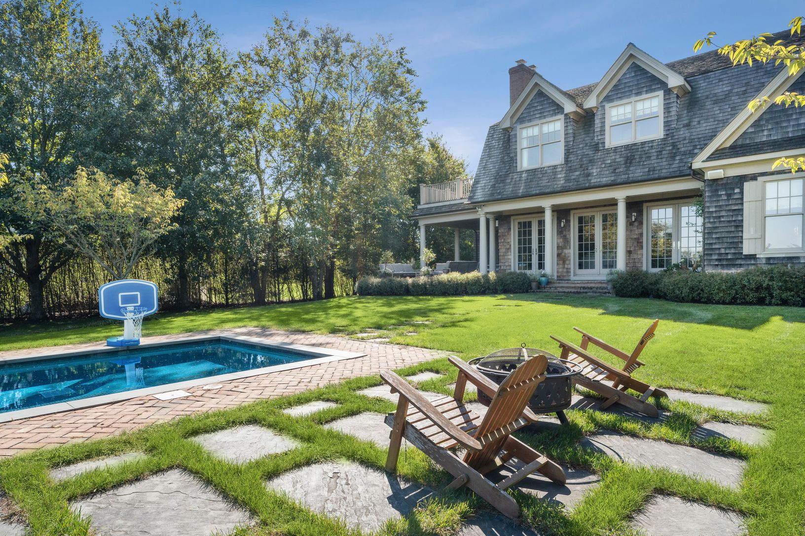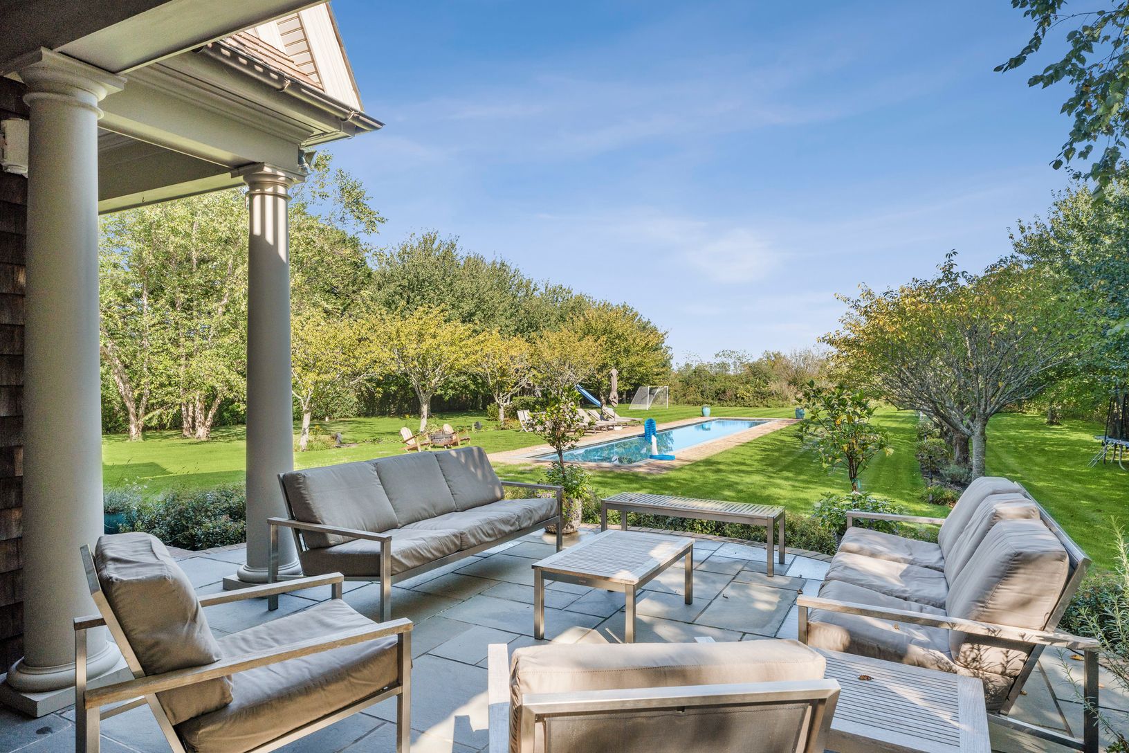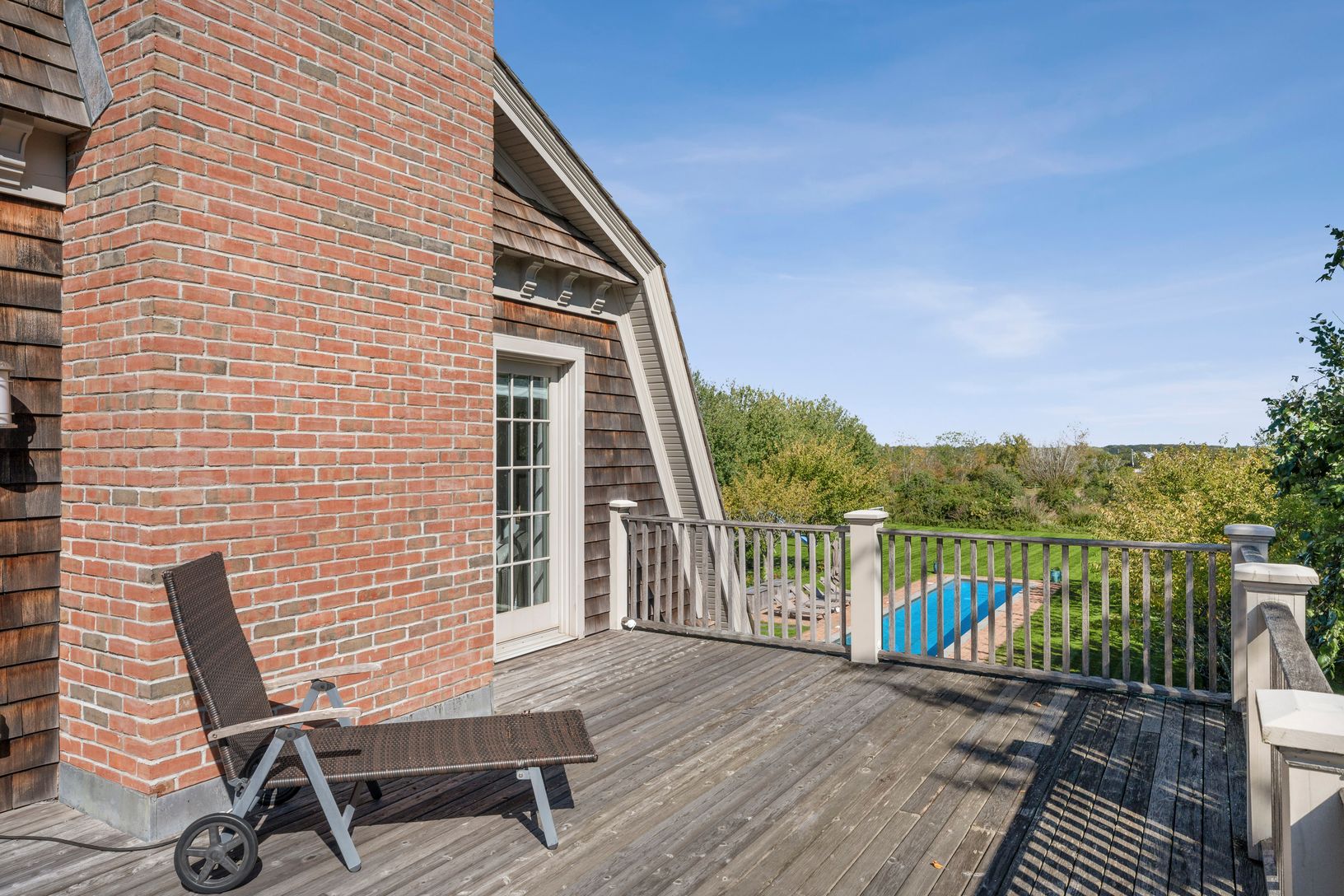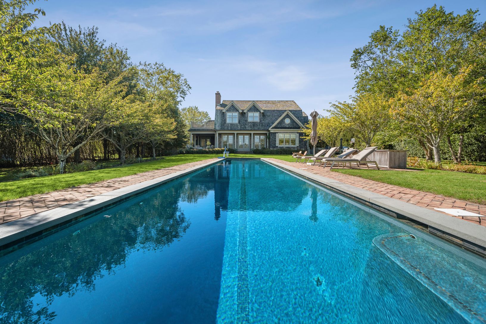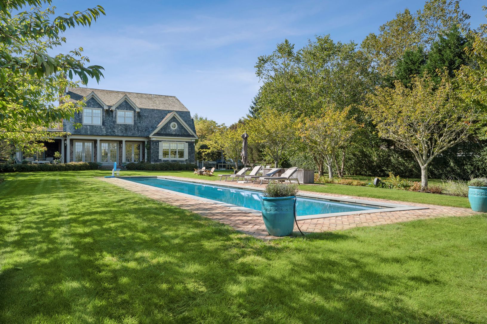 Beautiful custom-built home overlooking 60 +/- acre agricultural reserve on 1.5 acres with an expansive lawn, mature plantings and a heated 11'x70' gunite pool. The home consists of 7 bedrooms including primaries bedrooms both up and down, an eat-in dining area open to a family room with a fireplace, a built-in outdoor BBQ grill and a covered porch. Beautifully finished lower level with a large screen TV, kitchenette, 2 bedrooms, a bathroom, e