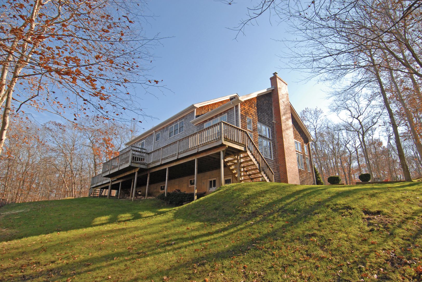 Nestled On 1.7 secluded acres, This 4,000 Sqft Post Modern Home features year-round a glimpse of Gardiners Bay with 2 Master Suites w/private viewing decks, soaring cathedral ceilings with sun-drenched rooms, fireplace & woodstove, Open kitchen with dining area, This house offers, well-appointed cook's kitchen, 4 generous bedrooms and 3 baths. Relax or entertain on the private deck or take a dip in the 20' x 60' heated pool with a lap lan