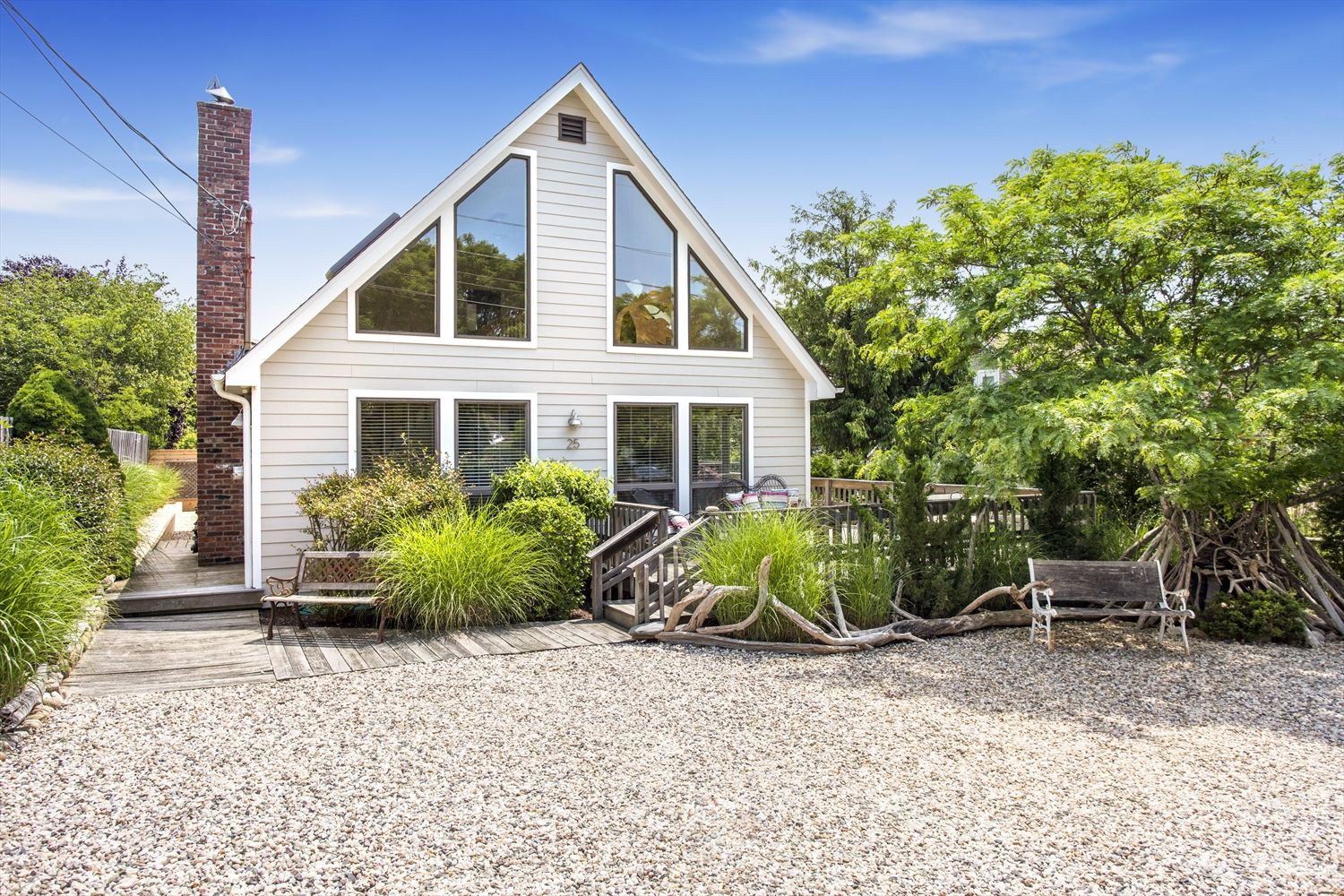 Just listed, and newly updated, this sun drenched A frame home is the ideal year round Beach retreat. Cathedral living areas with wood stove offer an open floor plan that opens to wraparound deck with a lovely frame of indigenous plantings. Two guest bedrooms share a bath on the main floor, and the upper master has its' own bath and loft sitting room. A full basement, backyard decking, and low maintenance make this a superb year round Beach re