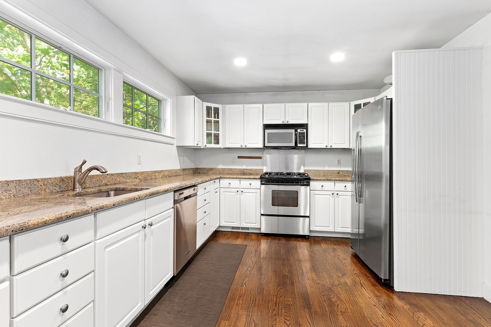 Opportunity Knocks! Sited on 1.3+ acres, this Traditional style home features 3 bedrooms, 2 full and 1 half bathrooms, and an open floor plan including a sun filled living room, dining area with fireplace, sitting area, eat-in kitchen and an attached one car garage. Outside, the heated pool is surrounded by a large deck, which is the perfect place to entertain, and the wrap-around wisteria covered front porch offers tree top views. Renovate to