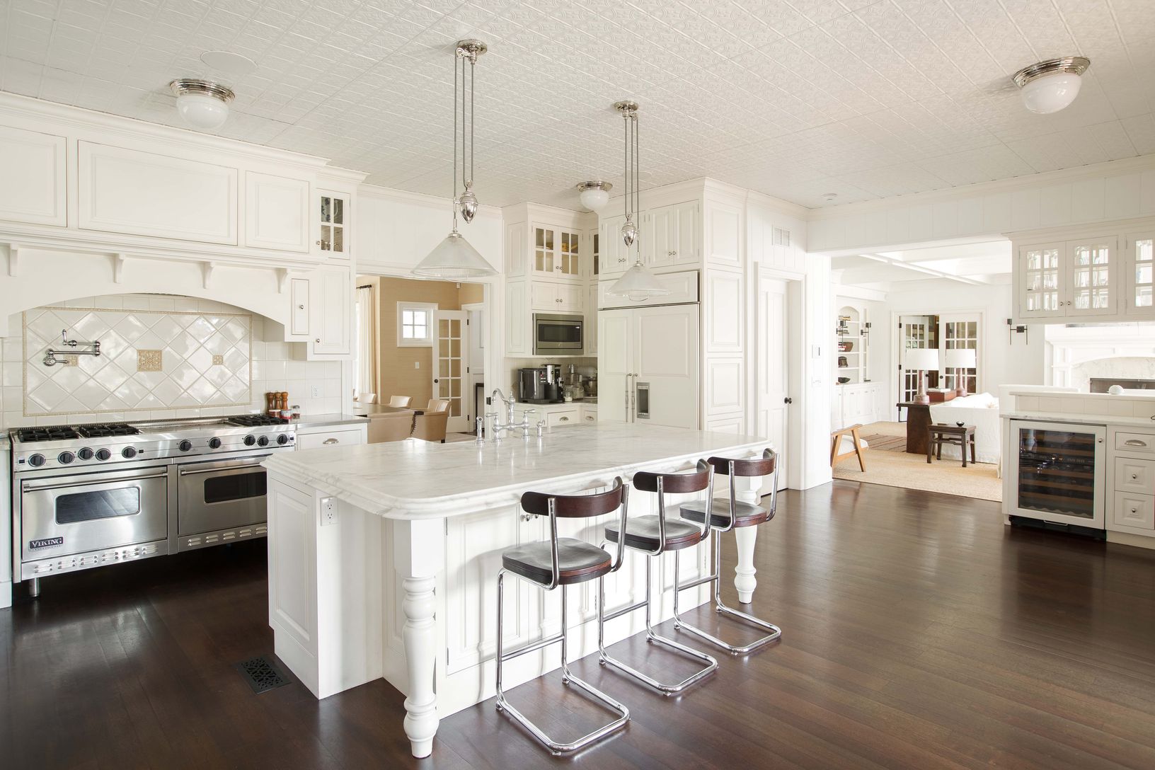 Enter the main floor, welcomed to a massive living space with panoramic views to the garden, stone fireplace and multiple sittings areas which opens to a gourmet chef’s kitchen with double sink, Viking appliances, built in refrigerator, dishwasher and wine fridge. A breakfast nook leads way to the rear enclosed deck offering a lovely al fresco dining feel l