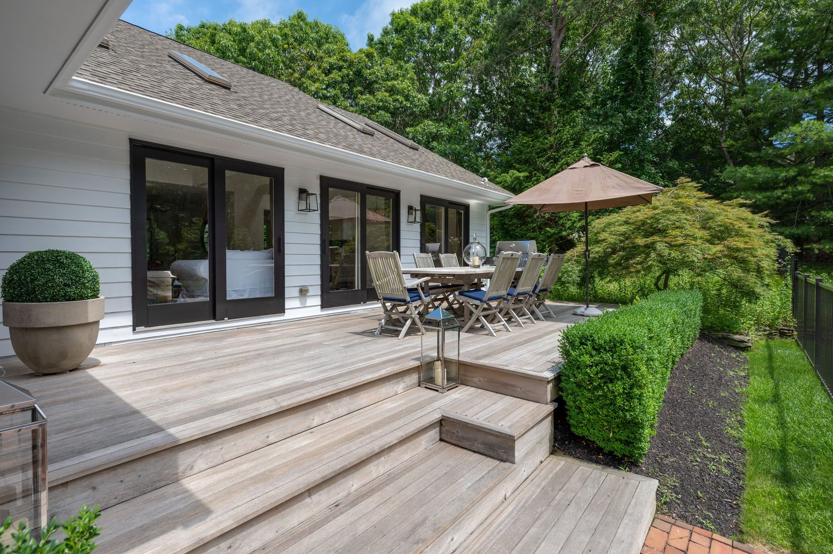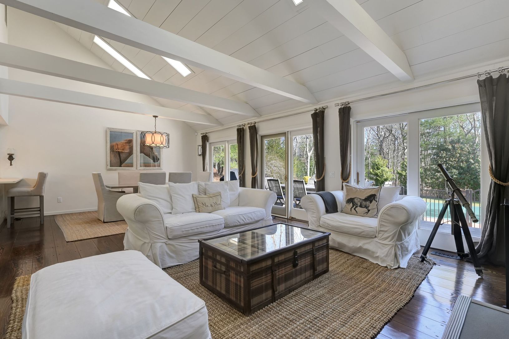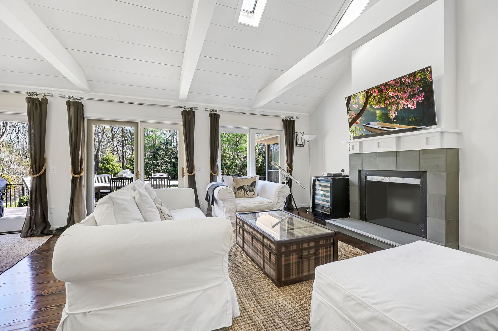 This stunning, like-new 3-4 bedroom/4.5 bath East Hampton beauty has it all. With high-end finishes throughout, the light-filled great room with cathedral ceiling and an open floor plan with a wall of glass - leads to a beautifully landscaped backyard with its oversized deck and heated pool. The chef's kitchen has a custom eat-in area and breakfast bar, seamlessly transitioning to the dining area and living room with a fireplace. The welcoming