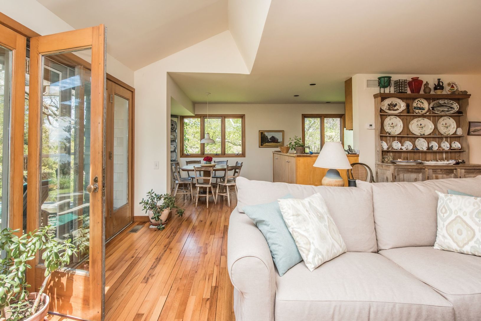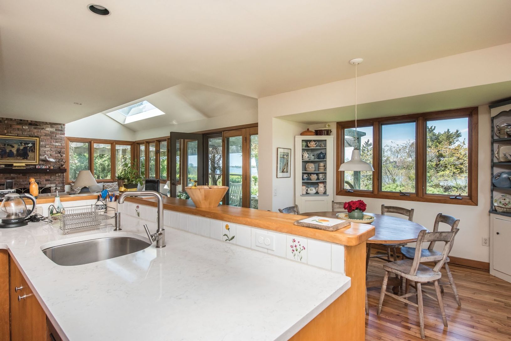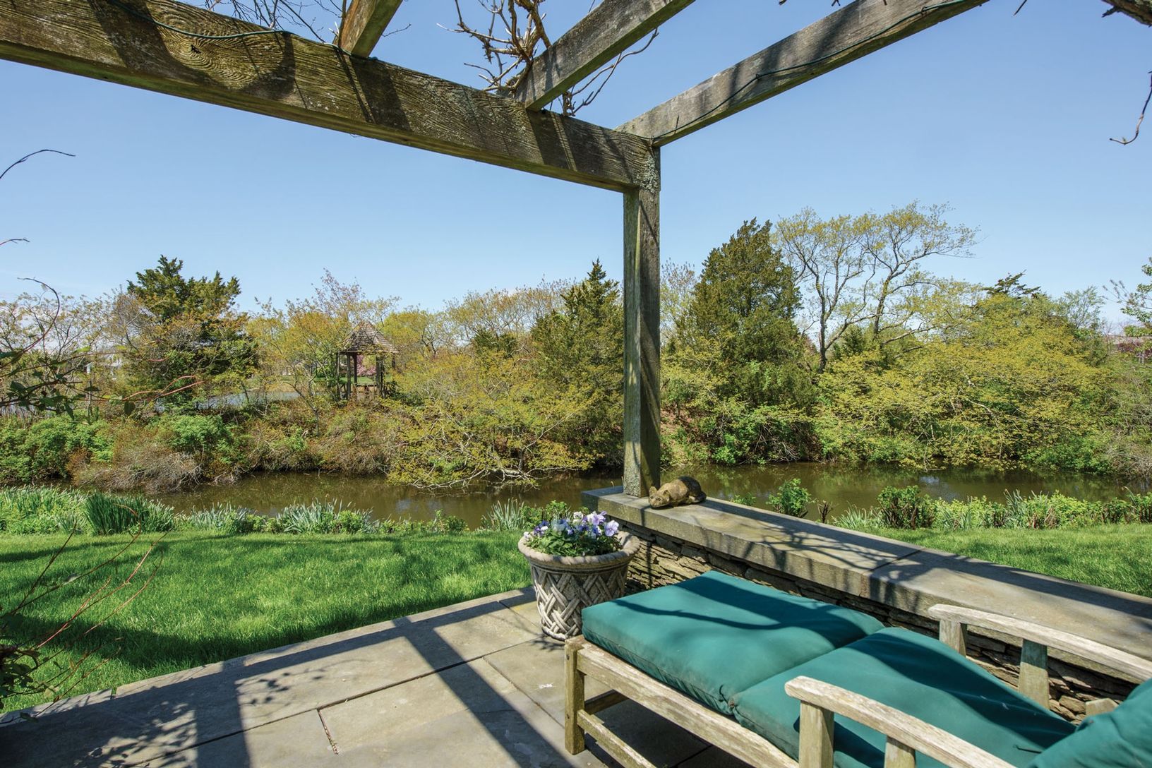 Waterfront, located very far south in Water Mill, this charming home features some of the best sunsets out across Mecox Bay. Use one of the kayaks, sunfish, SUPs, or electric boat with private dock, to enjoy Mecox Bay. The main residence features comfortable entertaining spaces with walls of glass opening to sunset views of a private pond, island, and Mecox Bay beyond, as well as lovely gardens, and heated gunite pool. This main floor also in