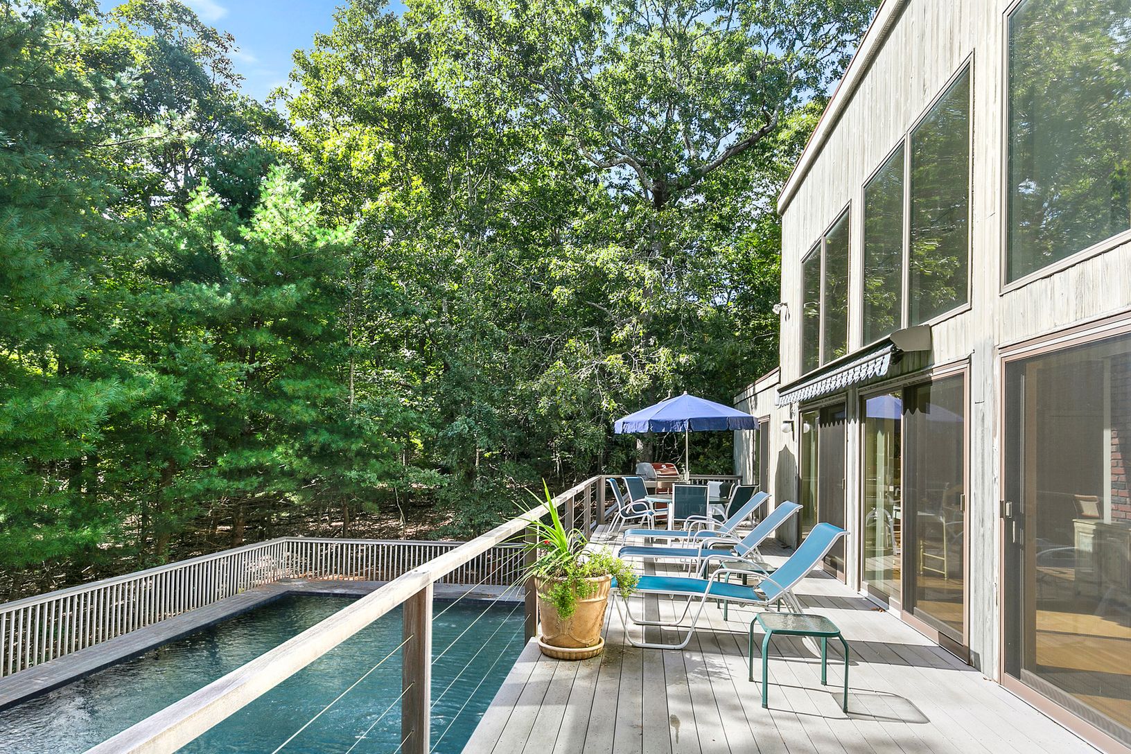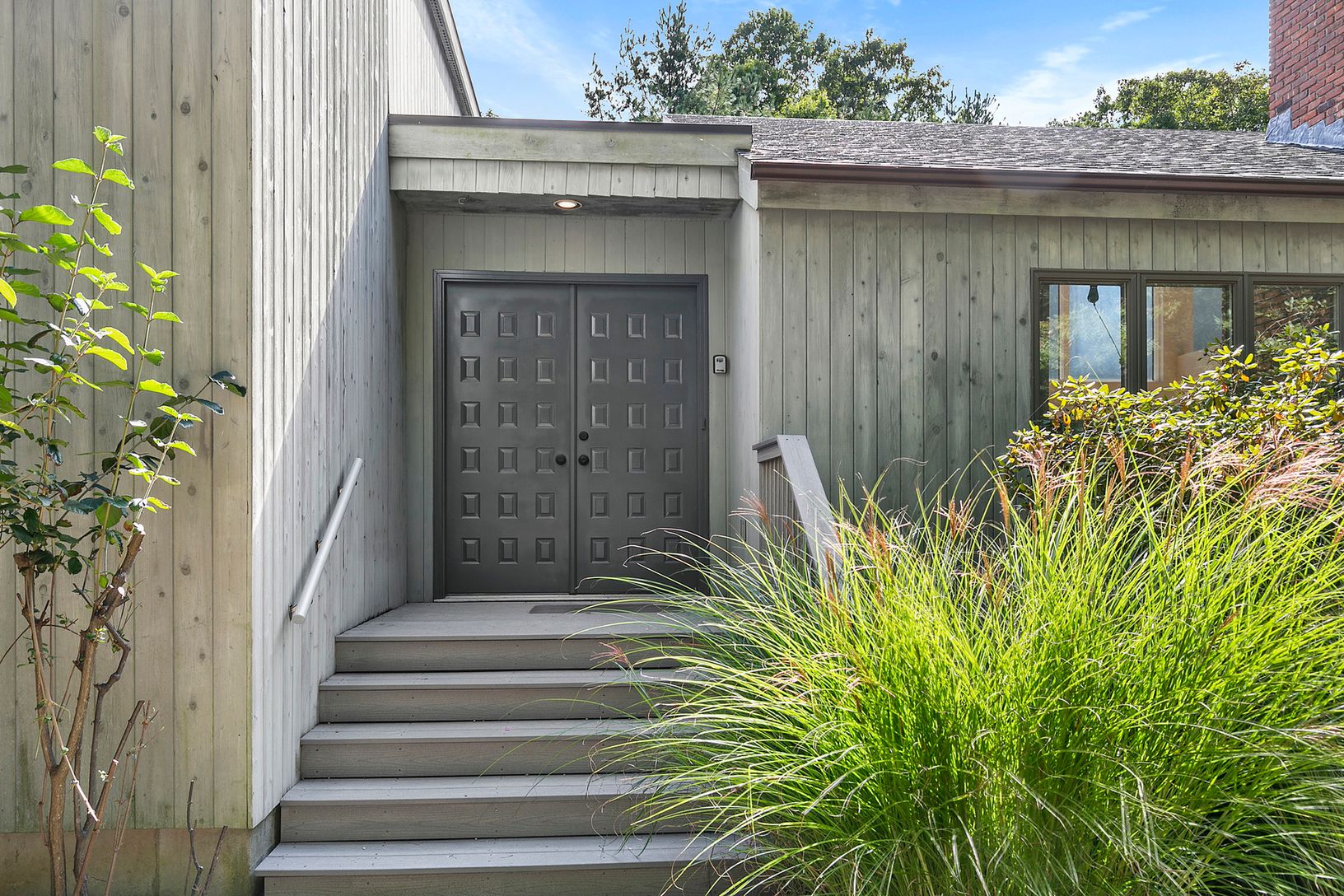 Clean contemporary 1800 Sq Ft one level home sits on 1 private acre with beach access. This home offers a light-filled open and airy floor plan with a walls of glass from floor to vaulted ceiling, allowing for an abundance of natural light. Living room has a brick fireplace to enjoy for cozy winters. Adjoining the living room is an open light -filled dining area with windows to the ceiling and opens into the eat-in kitchen with natural light f