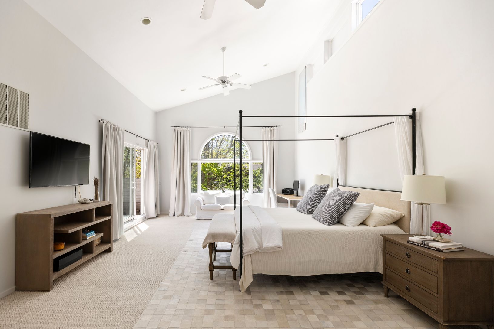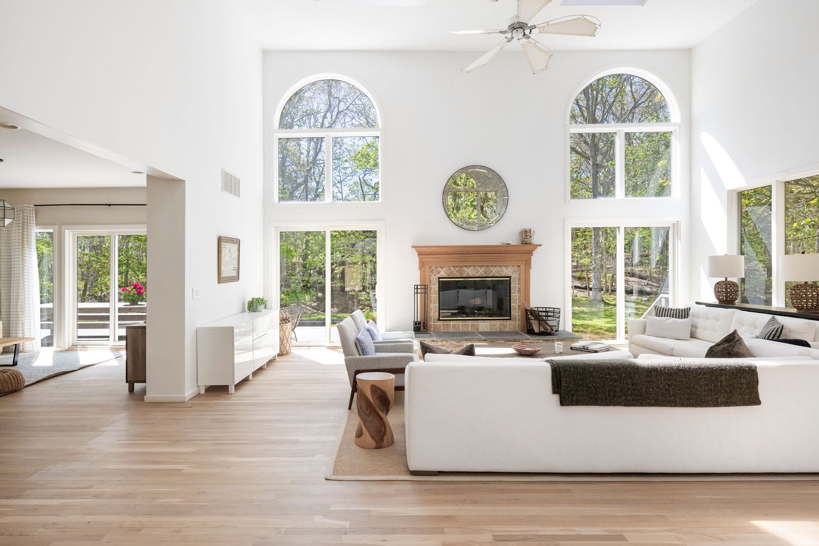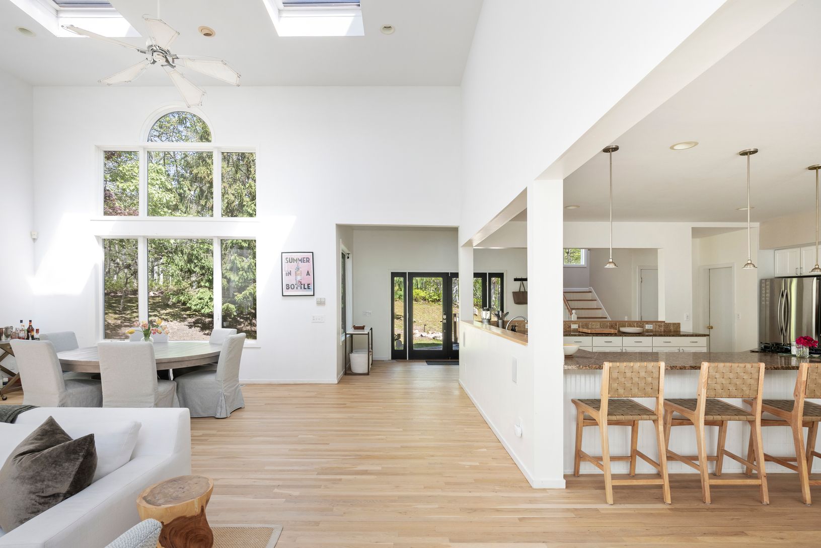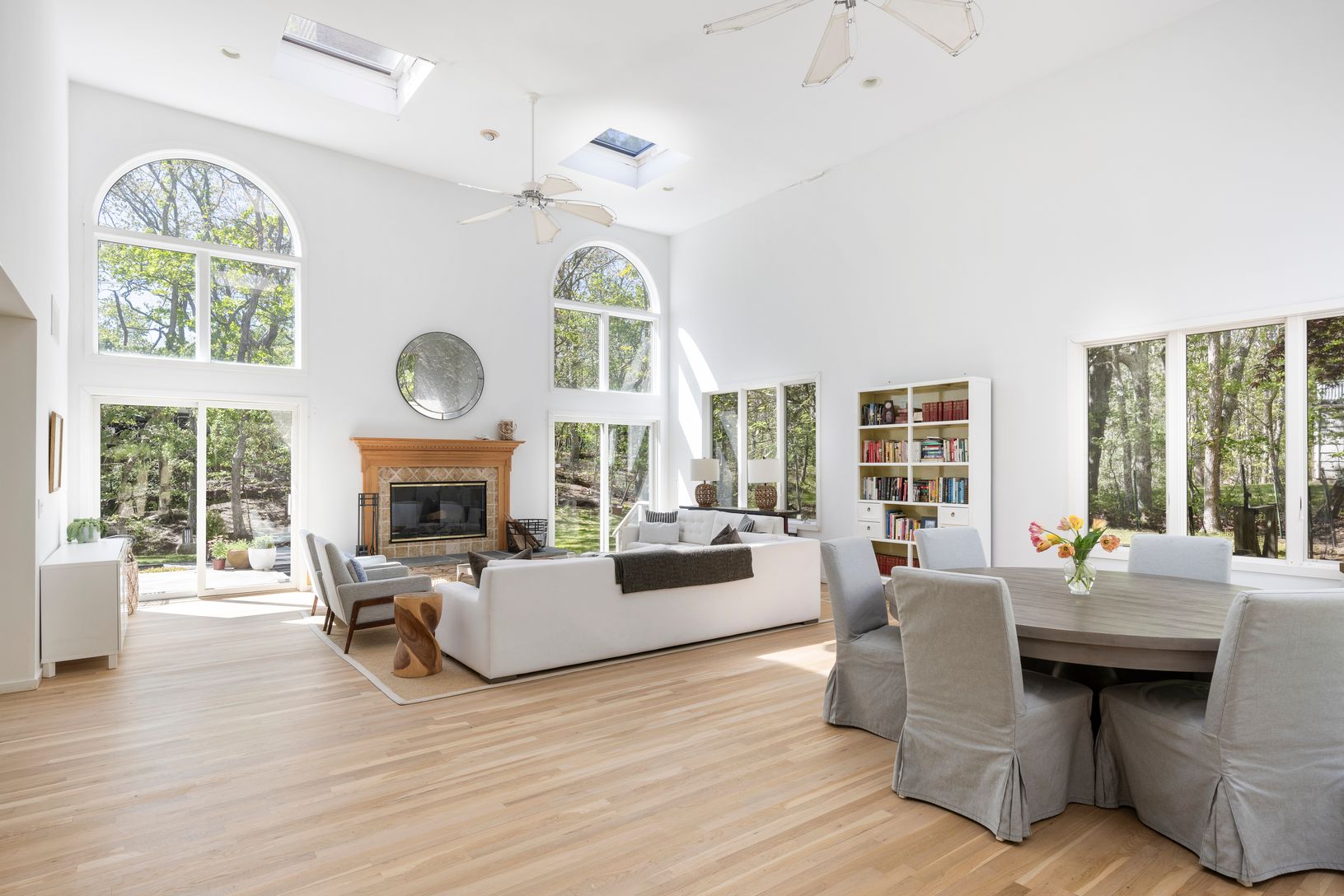 At the heart of the home, the soaring great room is framed by windows on three sides and skylights