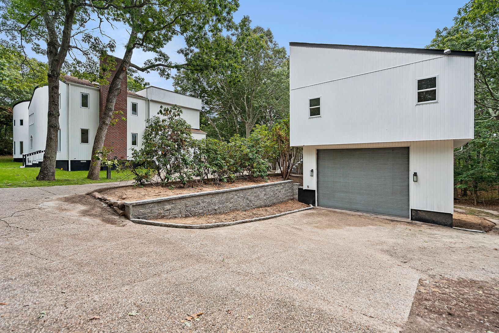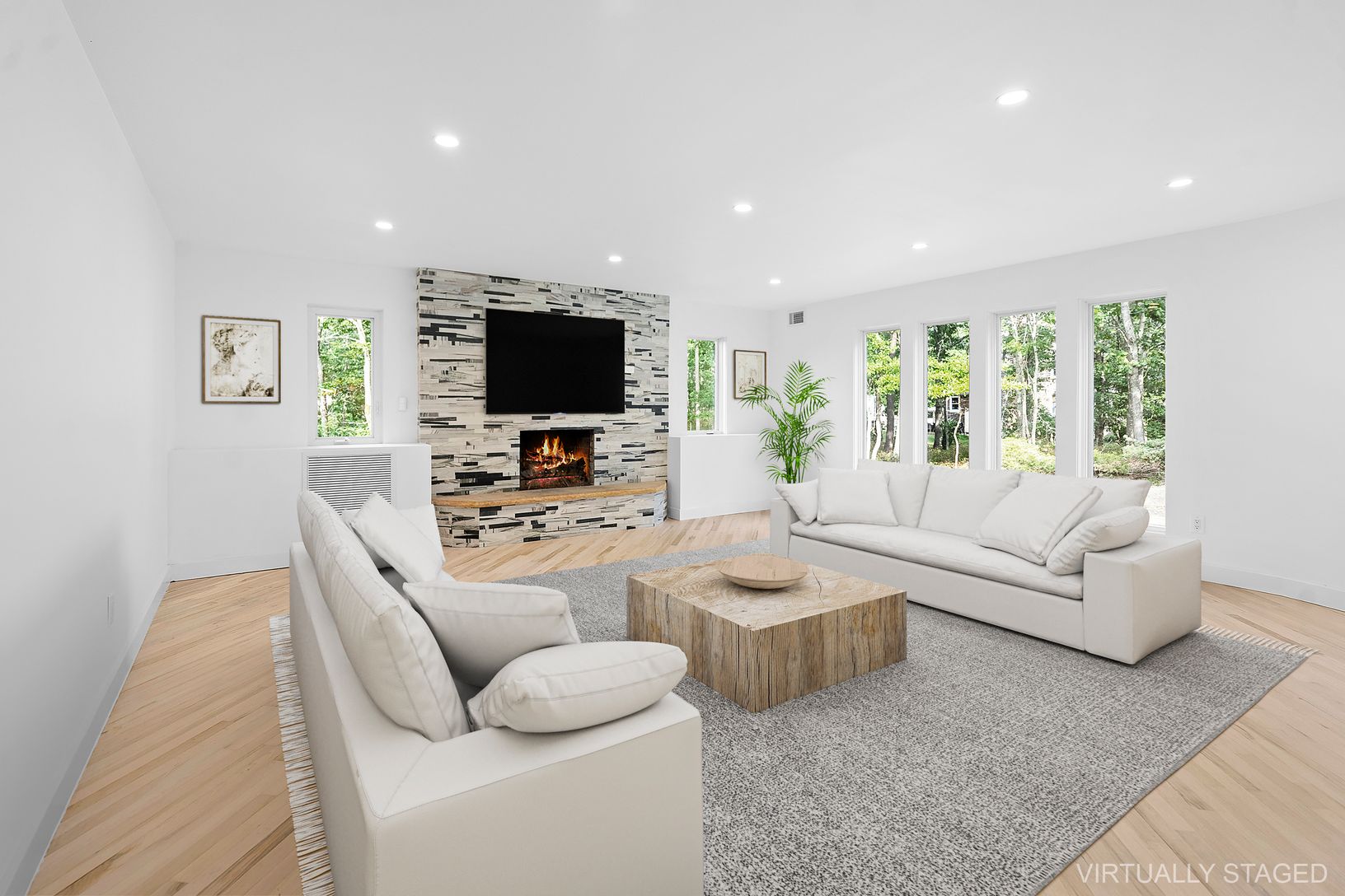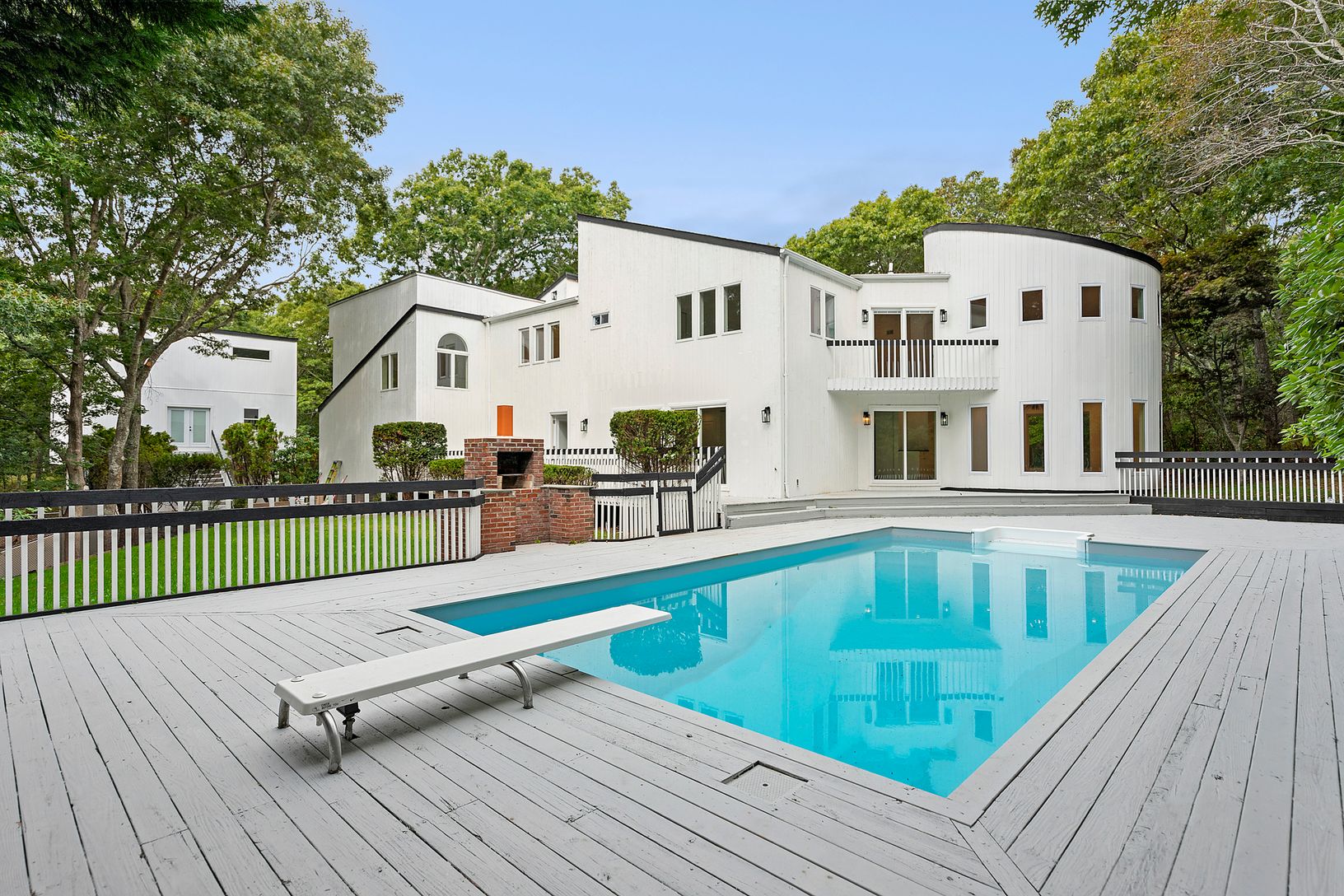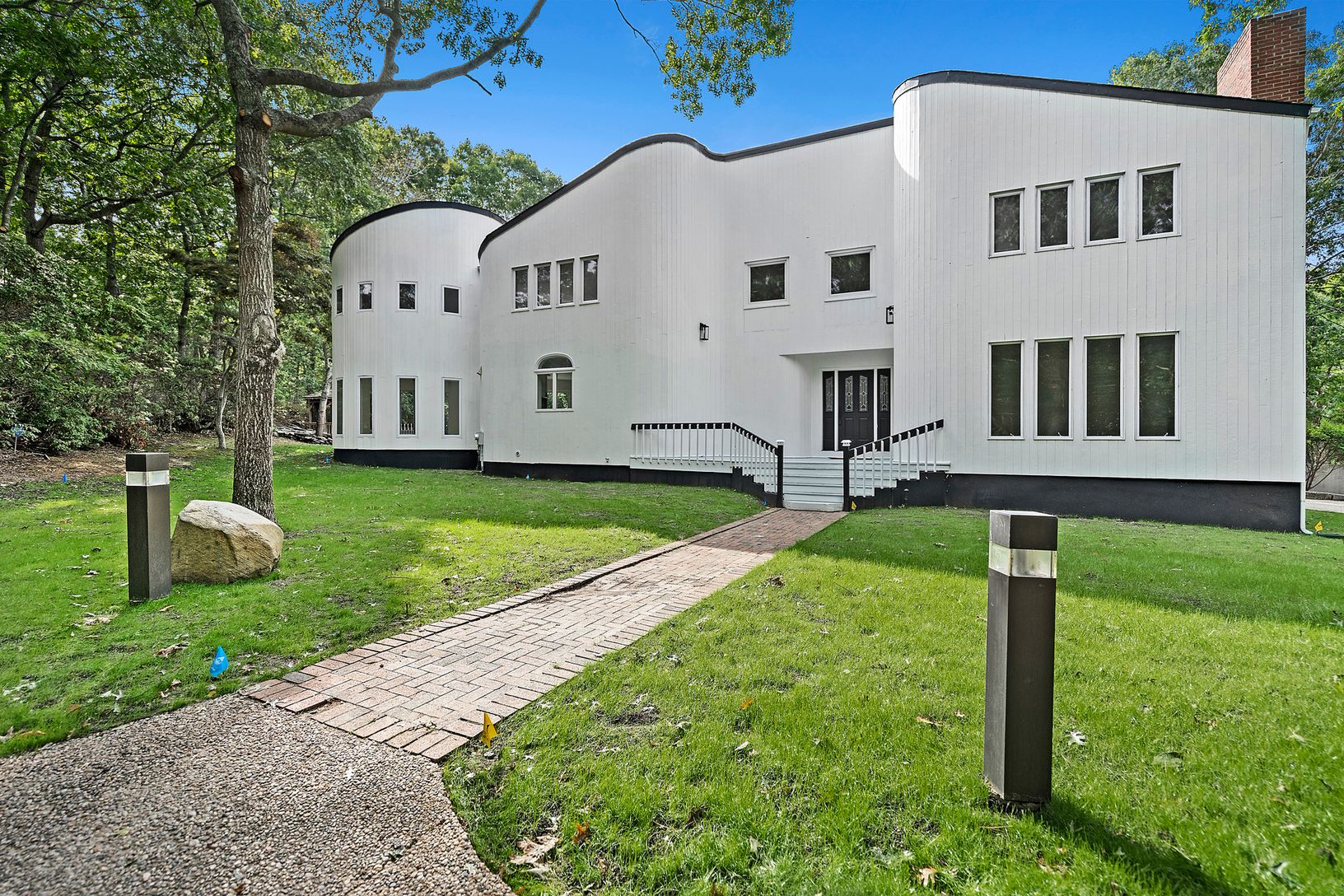 Set on a cul de sac street In the serene Ravenswood area of Hampton Bays, this fully renovated contemporary sits on a 1-acre 2 dwelling compound and backs to a preserve for ultimate peace.