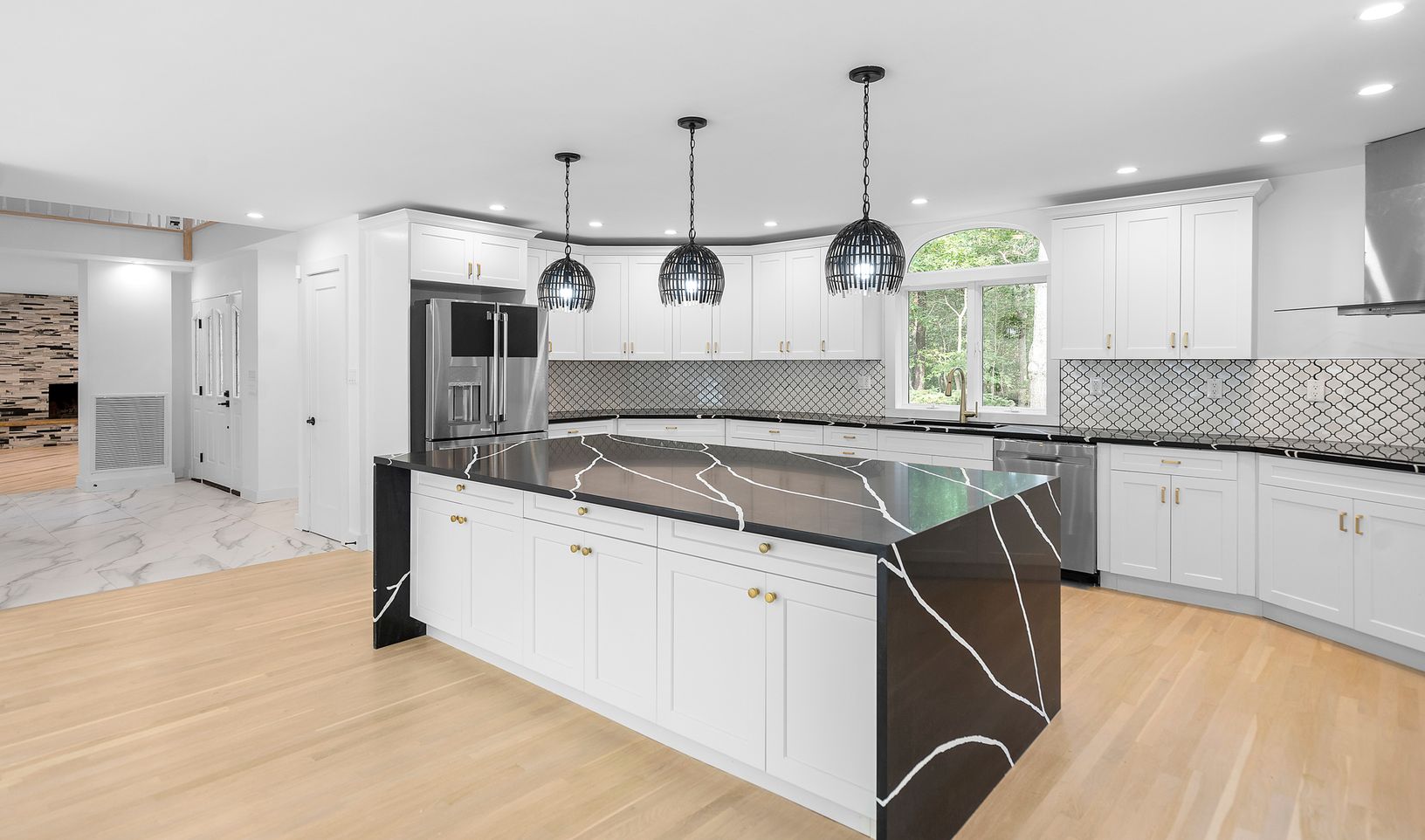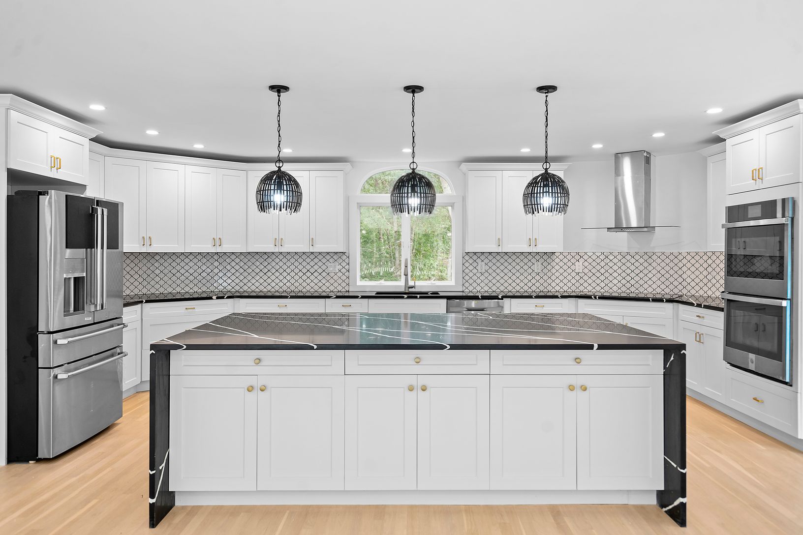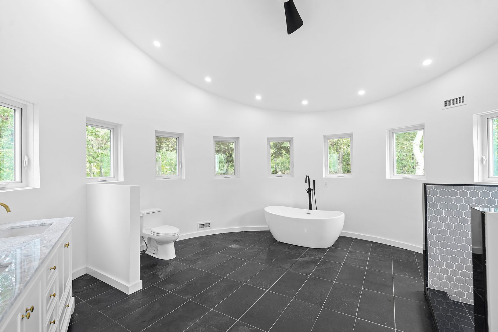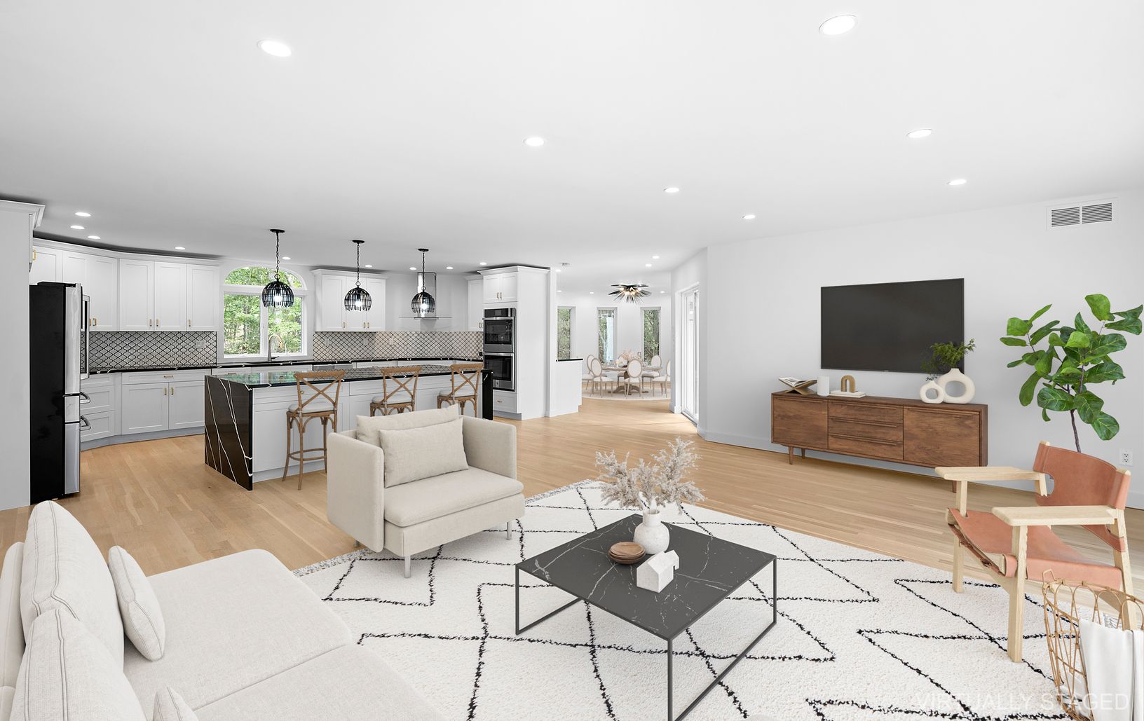 Set on a cul de sac street In the serene Ravenswood area of Hampton Bays, this fully renovated contemporary sits on a 1-acre 2 dwelling compound and backs to a preserve for ultimate peace.