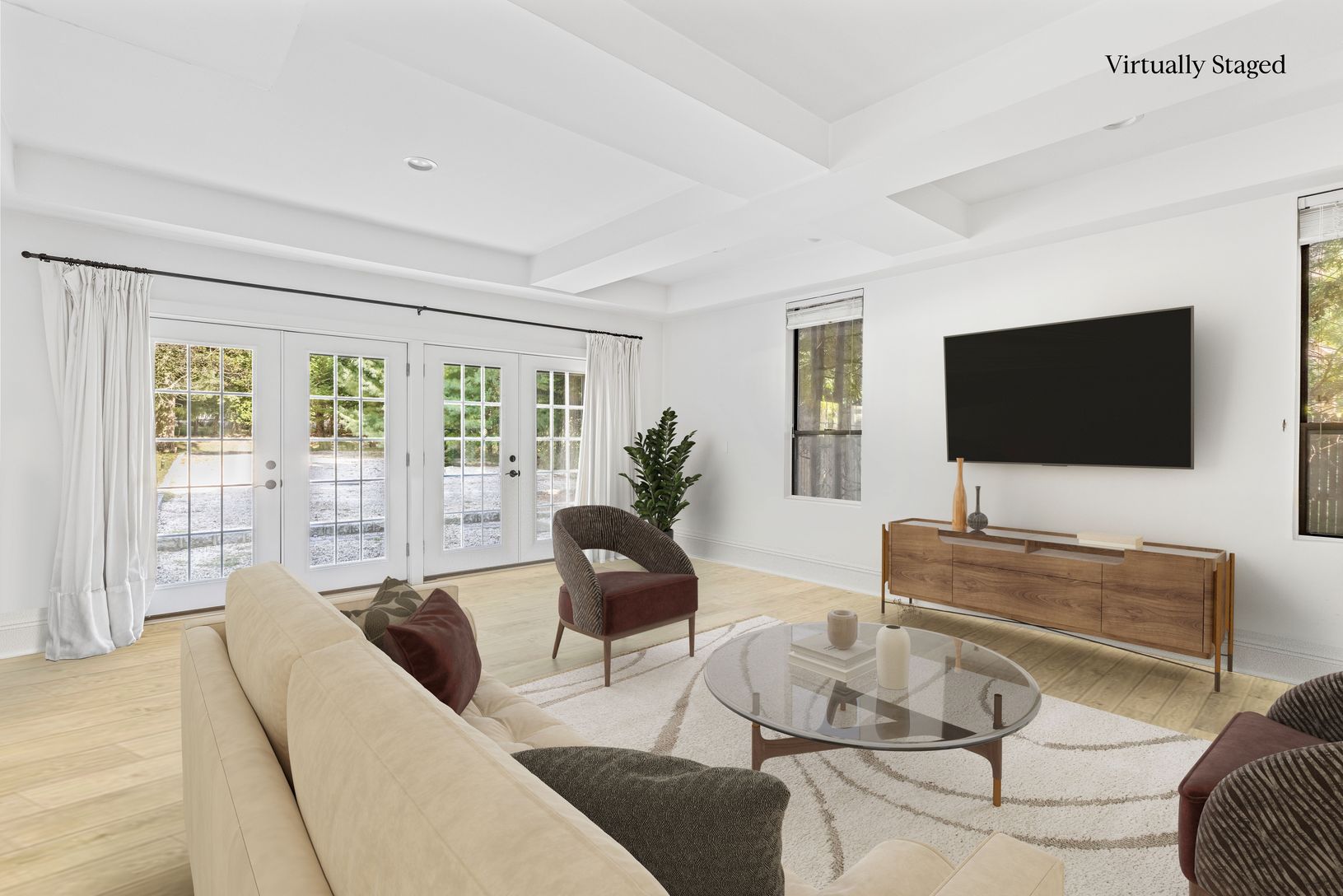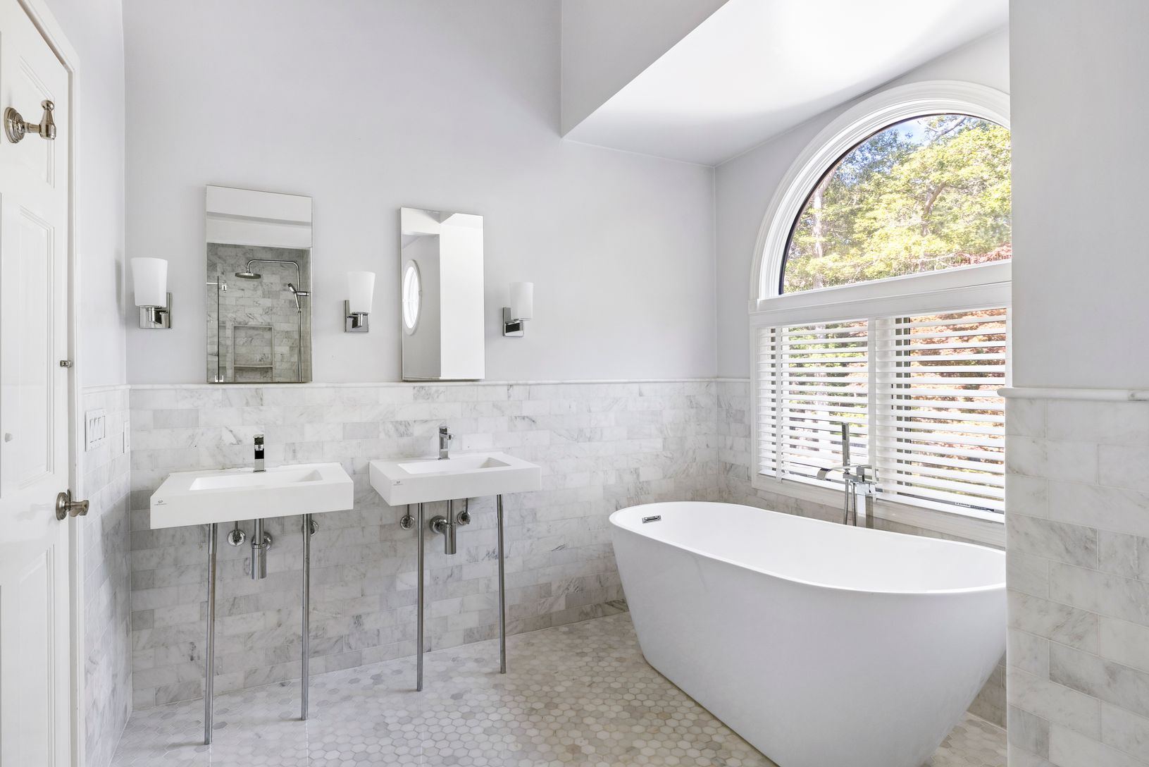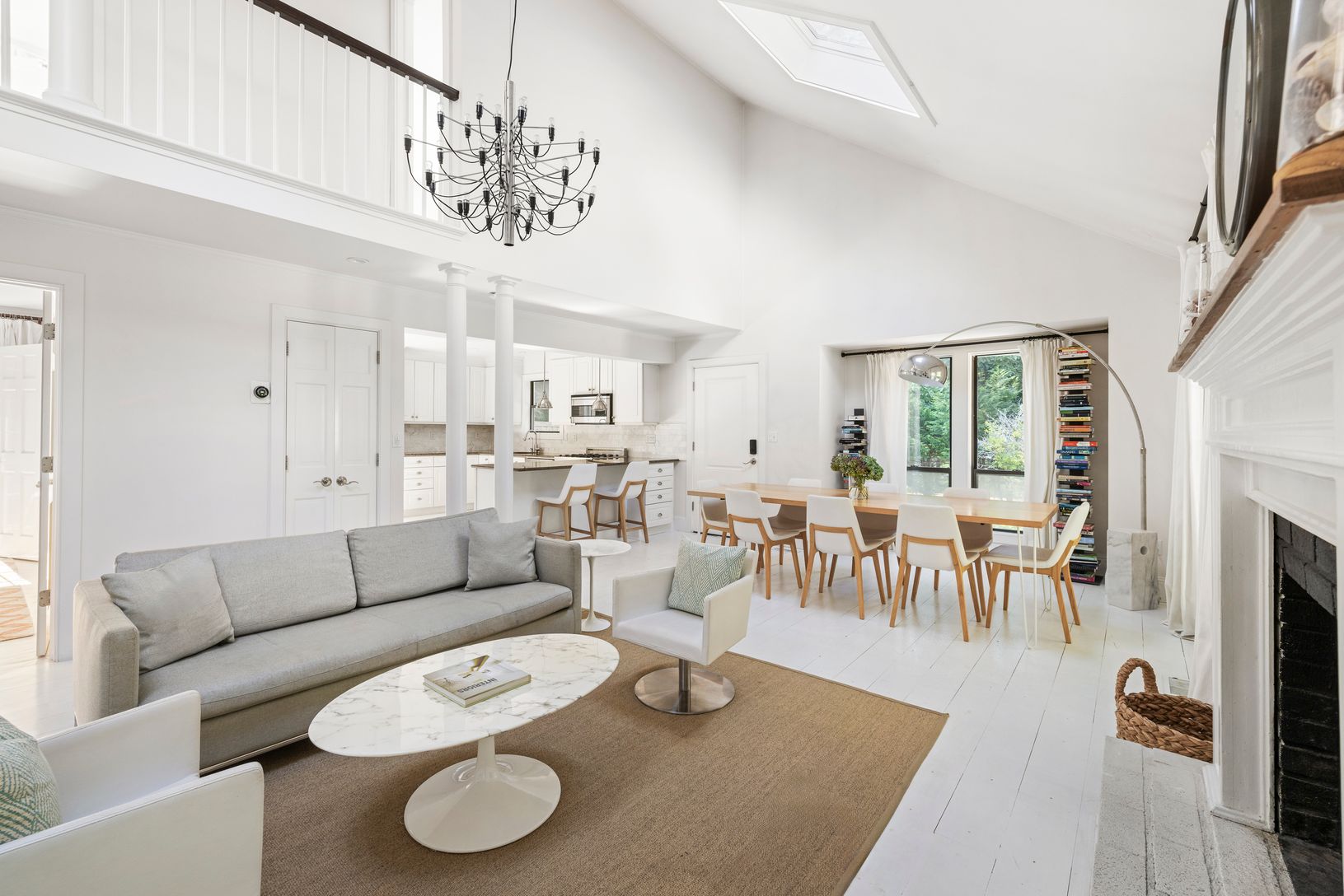 Tucked away on a lightly traveled road just moments from the villages of East Hampton and Amagansett lies this stunning contemporary home. With a perfect blend of modern design and classic comfort, this charming residence boasts 4 spacious bedrooms and 4 updated marble bathrooms. Step inside to discover high ceilings that create an open and airy atmosphere, complemented by whitewashed hardwood floors throughout. The kitchen features an open la