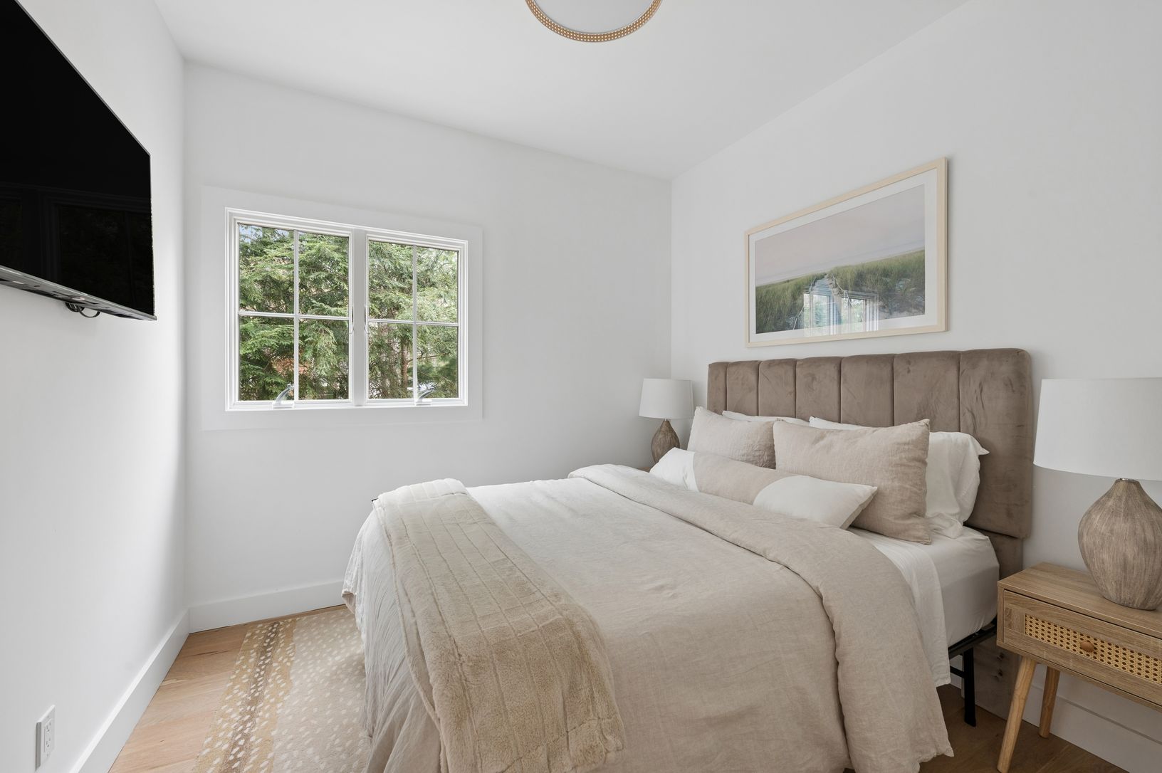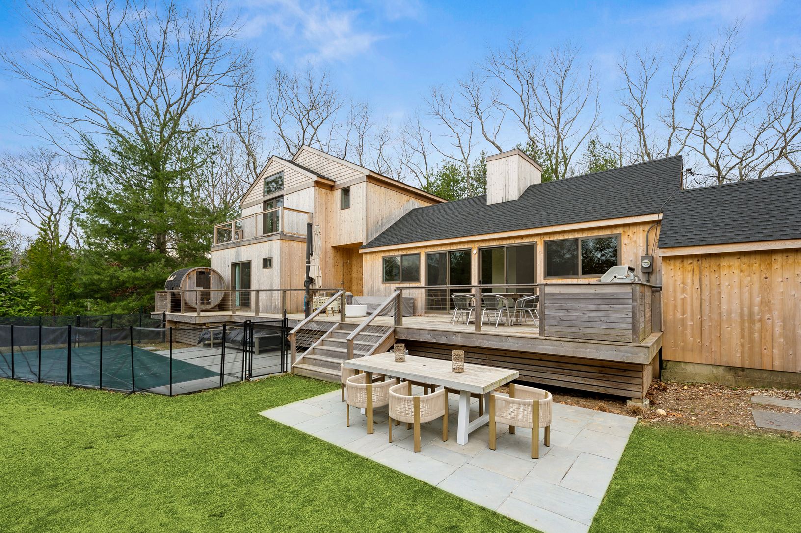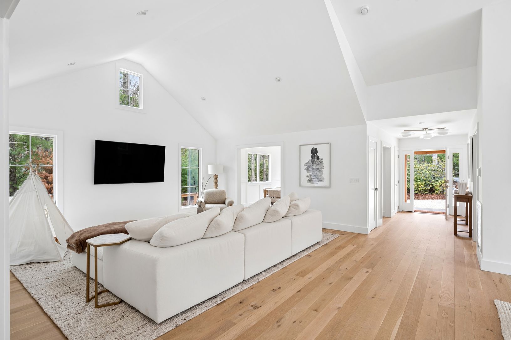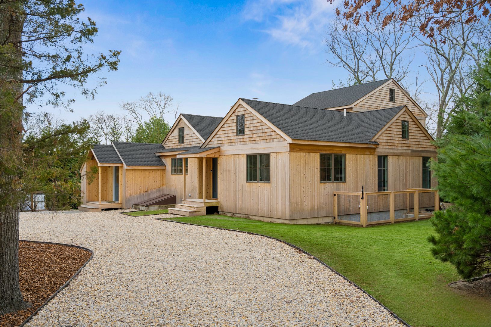 Situated just moments from the shores of Three Mile Harbor in an idyllic neighborhood, this exceptional home underwent a comprehensive renovation and expansion in 2025 and lives like new. Offering 3,800+/- square feet across three beautifully appointed levels, the residence features five bedrooms and four-and-a-half baths. A light-filled main level welcomes with vaulted ceilings and an effortless flow between living spaces, creating an open, a