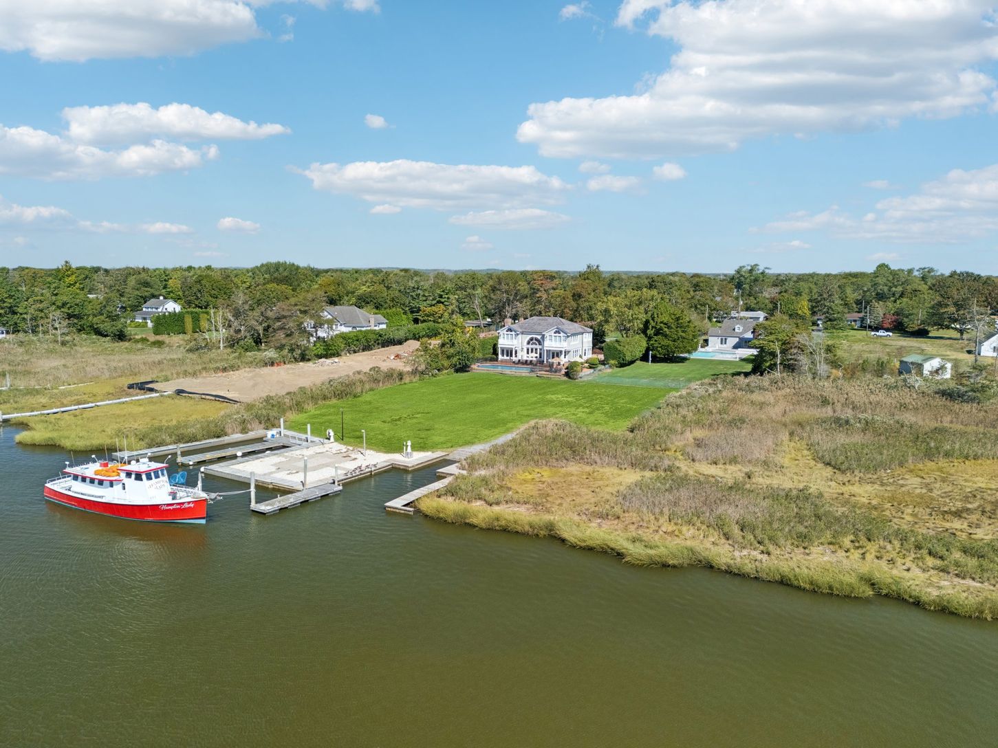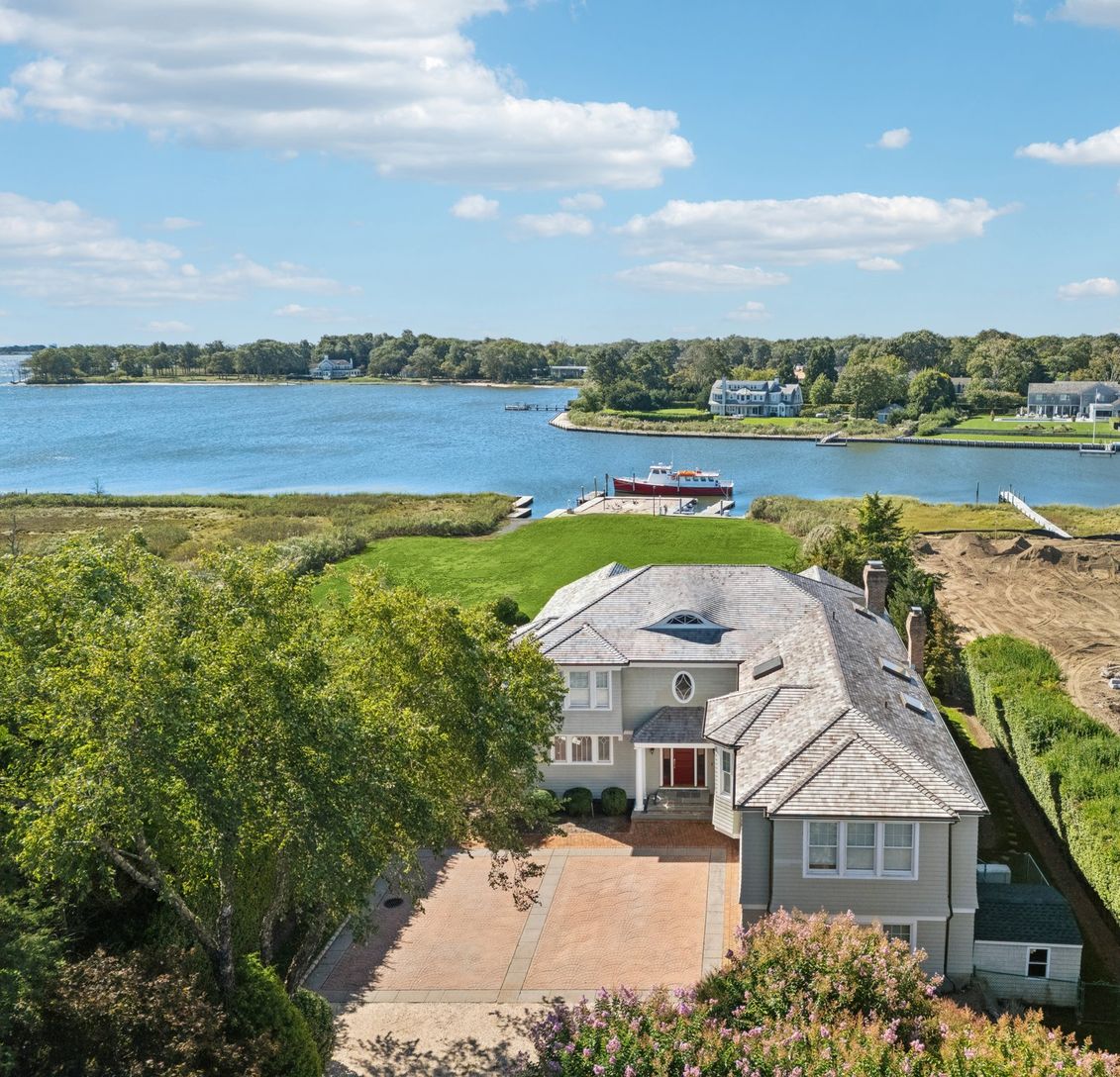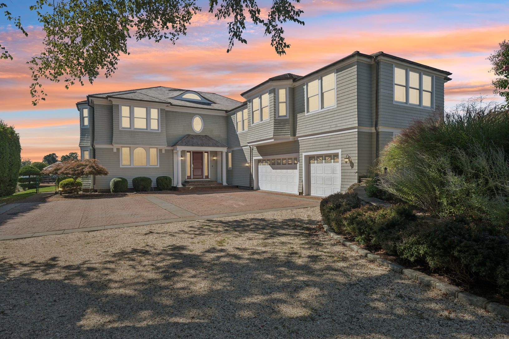 Set along East Quogue's highly sought-after Sunset Avenue, this 1.4-acre waterfront estate offers a rare combination of privacy, scale, and direct access to open water. Tucked deep off the road and framed by manicured hedges, a long private drive leads to the residence, creating a grand sense of arrival. With 100 feet of water frontage on Phillips Creek and views extending toward Shinnecock Bay, the property includes a deep-water dock designed