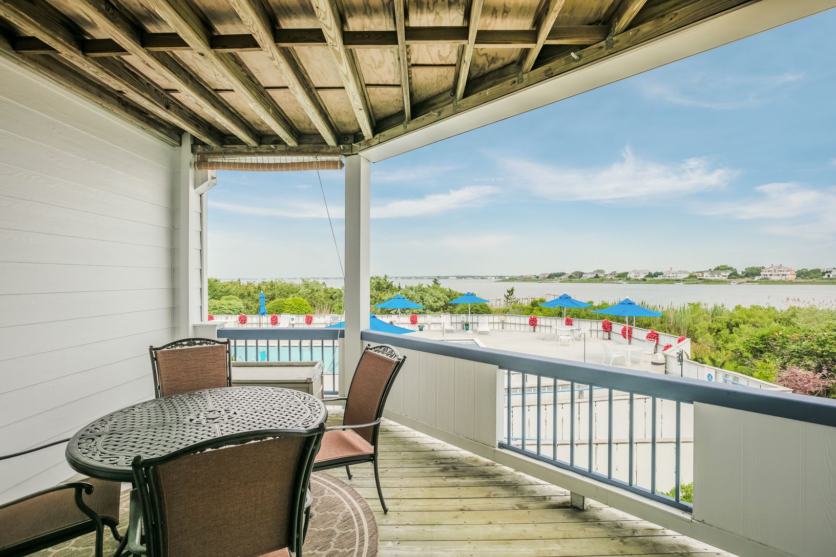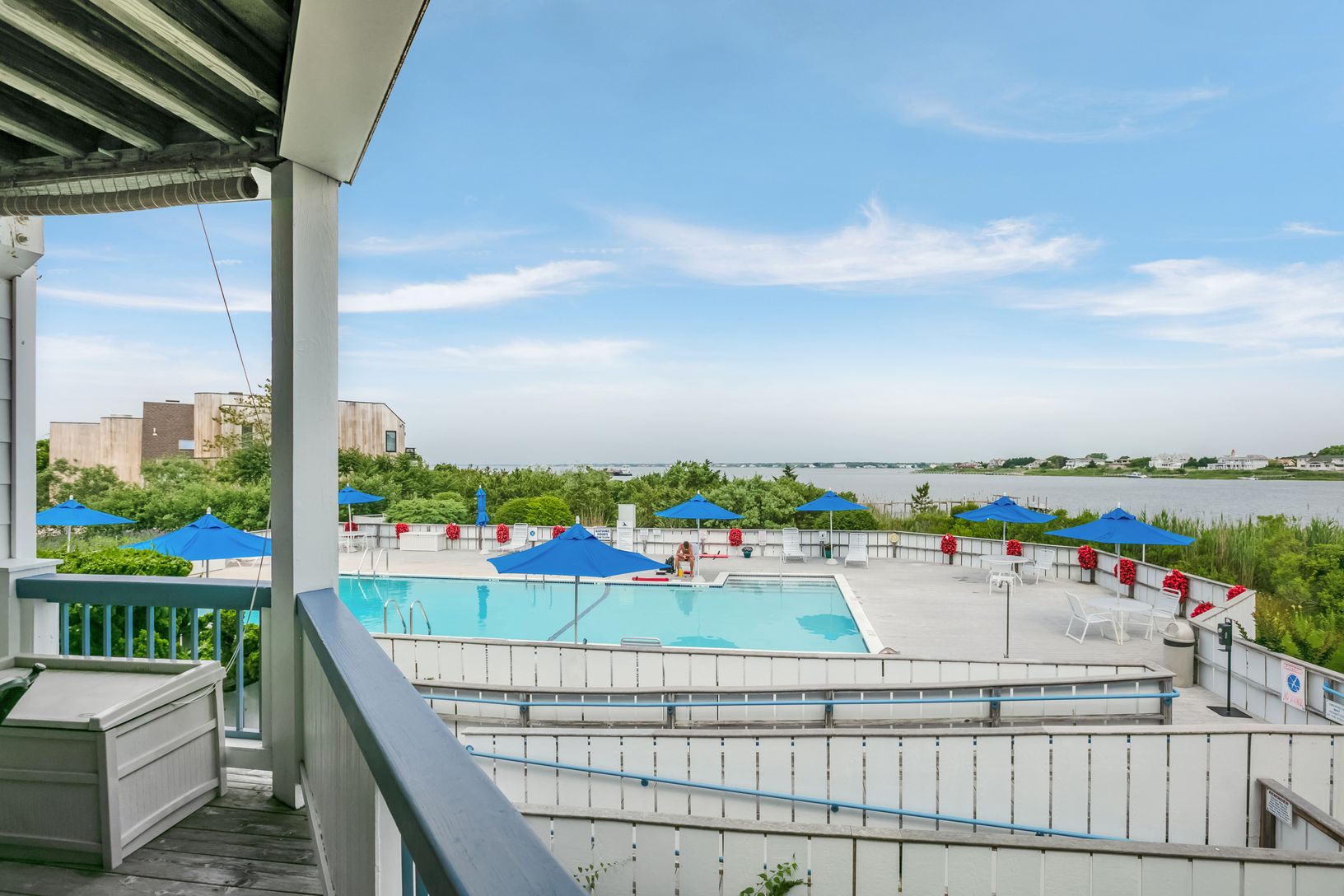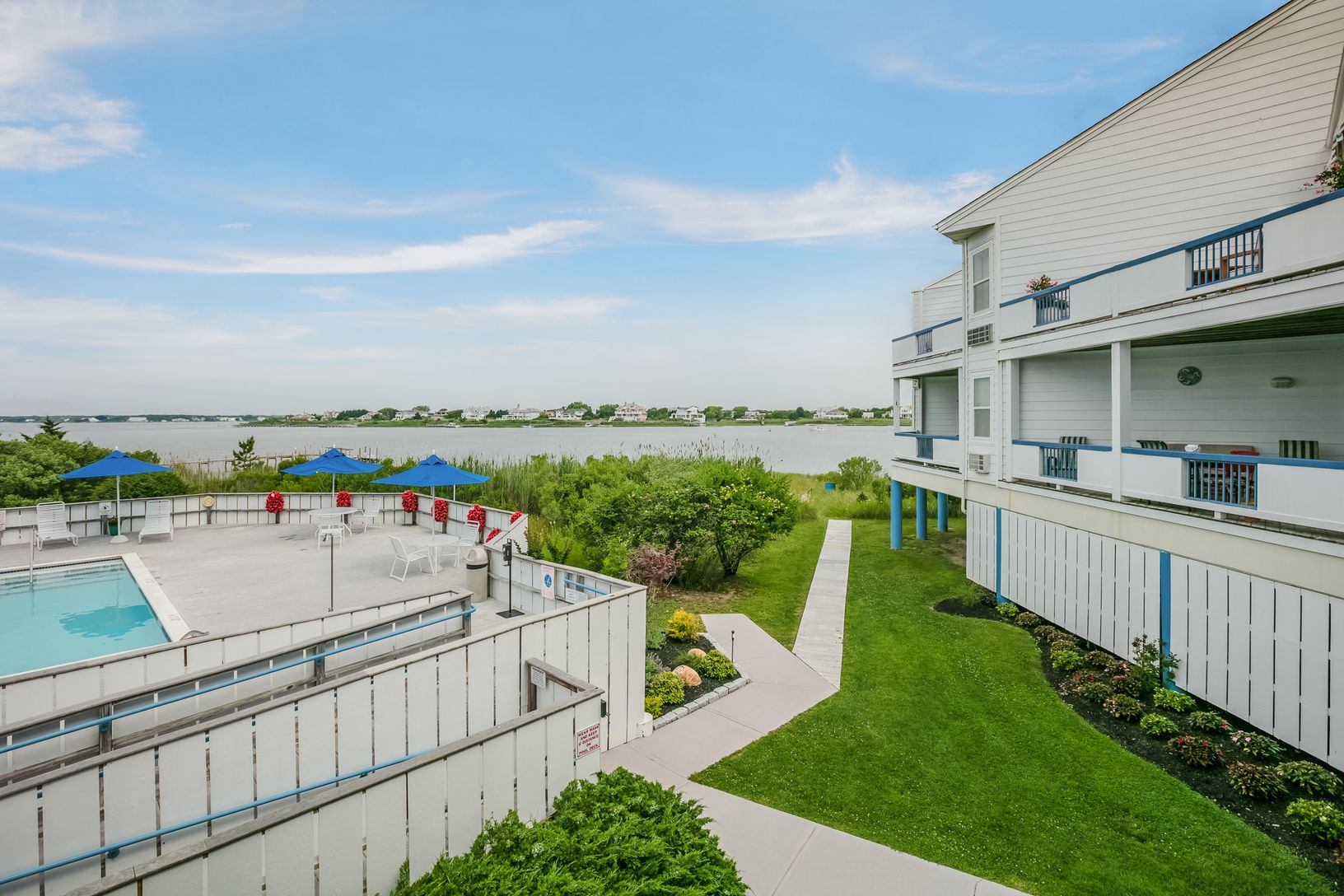 Bay views forever from this first floor unit either seasonally or year round! Beautifully appointed, two bedroom, two full bath unit offers open kitchen, living and dining area opening out to a private deck overlooking the bay side pool and stunning Moriches Bay! Amenities include three Har Tru tennis courts, two Gunite, heated pools with lifeguards, storage, parking, elevator, in-unit and on-site additional laundry facility and of course acce