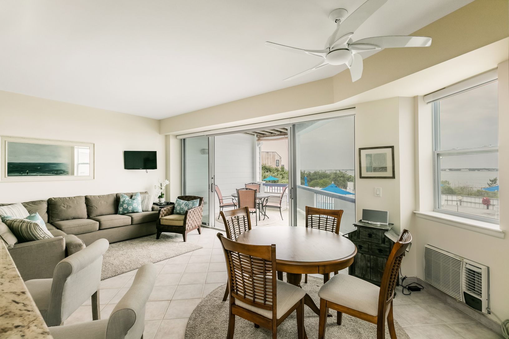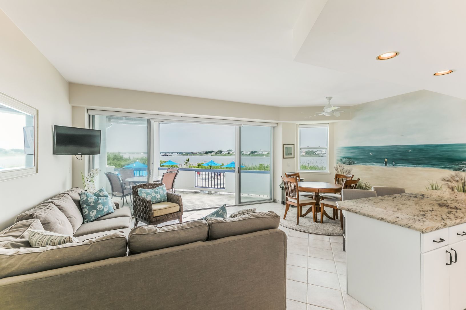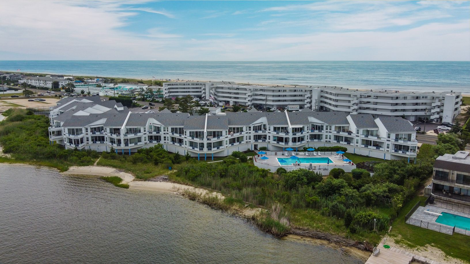 Bay views forever from this first floor unit either seasonally or year round! Beautifully appointed, two bedroom, two full bath unit offers open kitchen, living and dining area opening out to a private deck overlooking the bay side pool and stunning Moriches Bay! Amenities include three Har Tru tennis courts, two Gunite, heated pools with lifeguards, storage, parking, elevator, in-unit and on-site additional laundry facility and of course acce