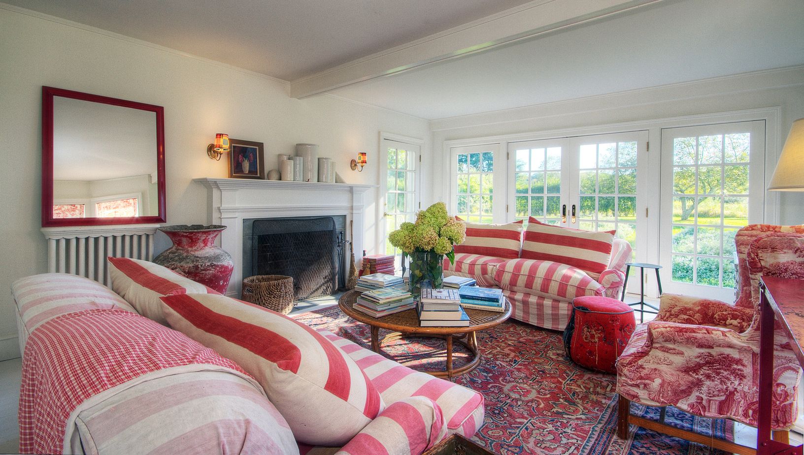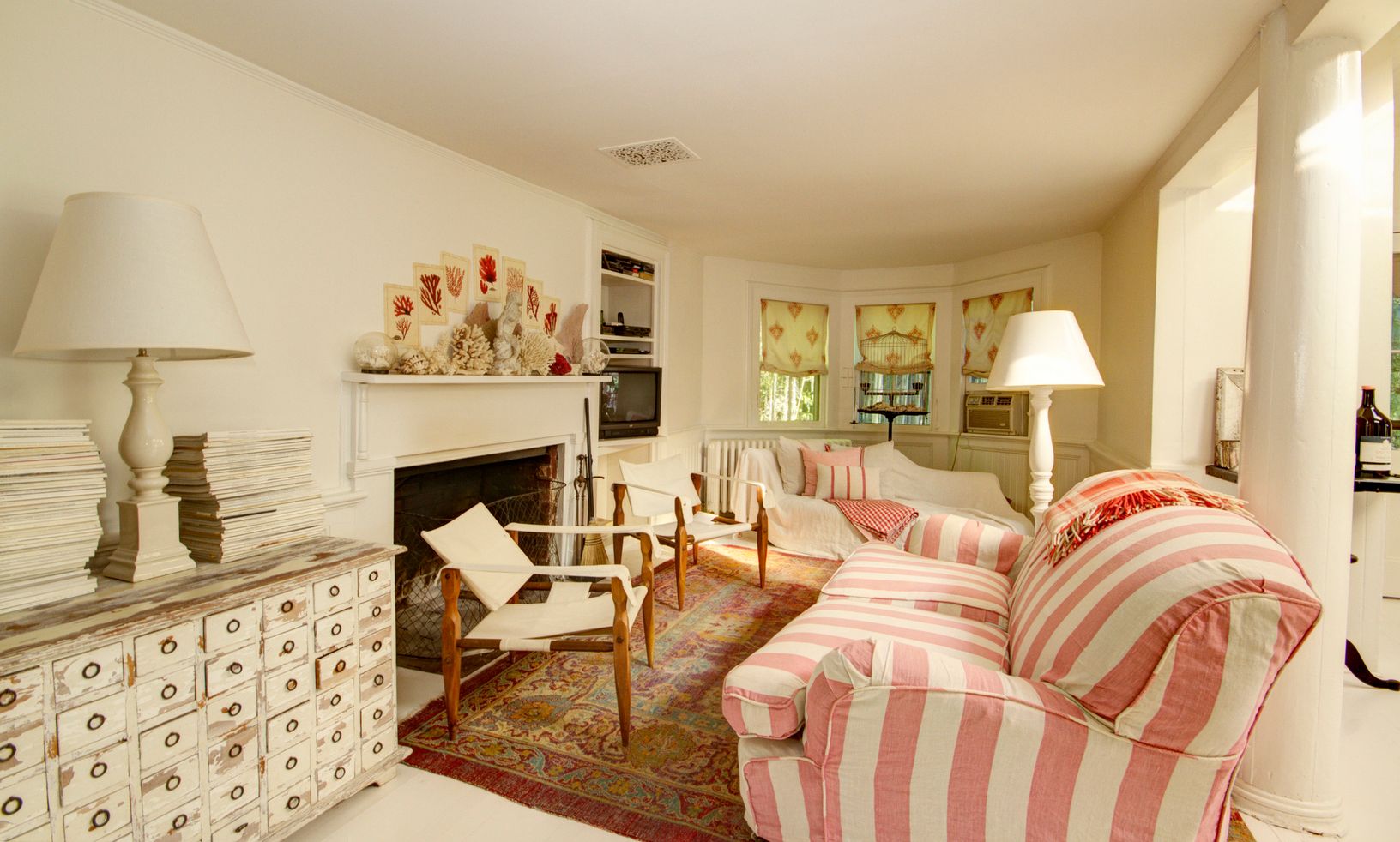 The longtime home of a well-known design executive features a beautiful, sunny living room with wood burning fireplace and French doors opening to