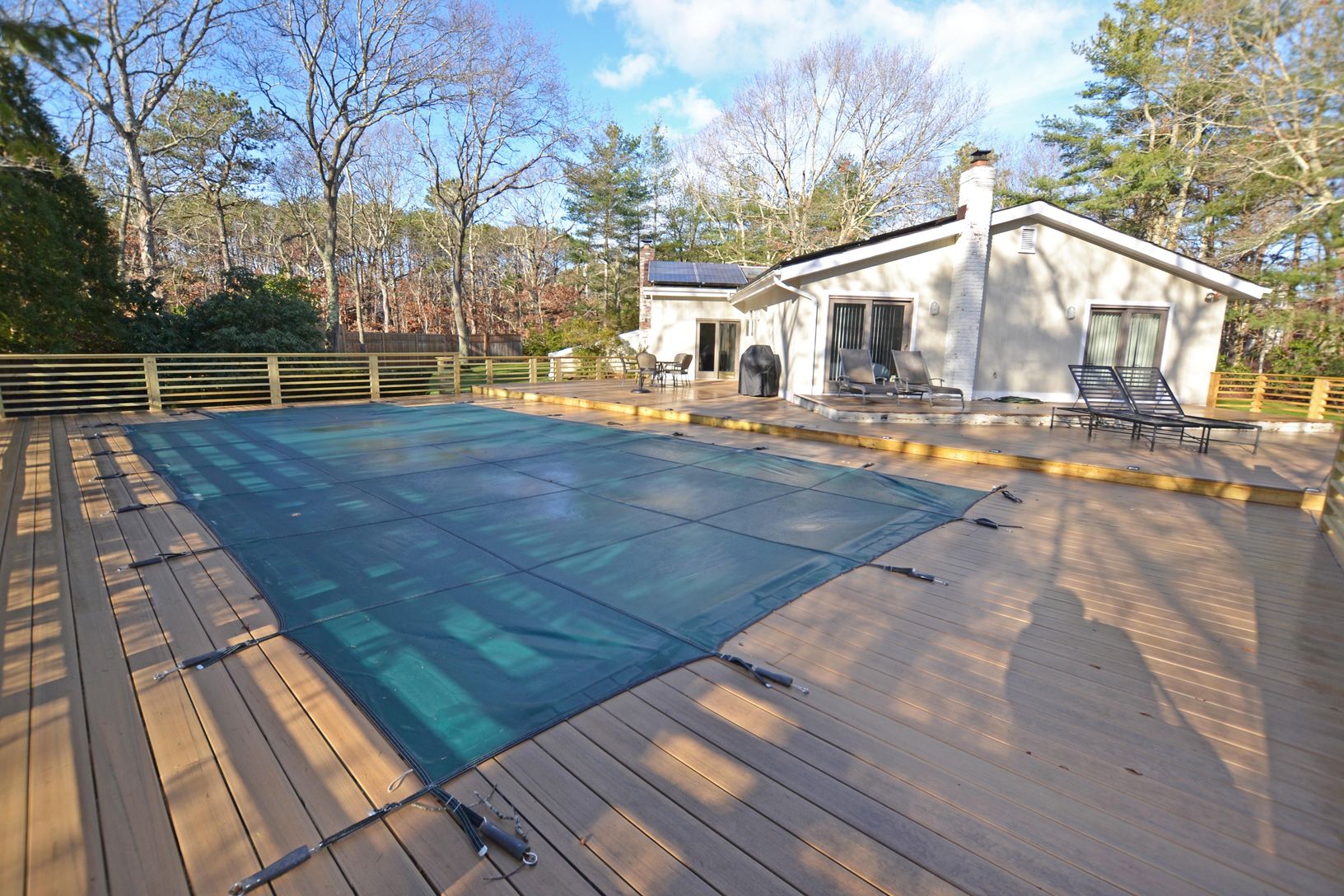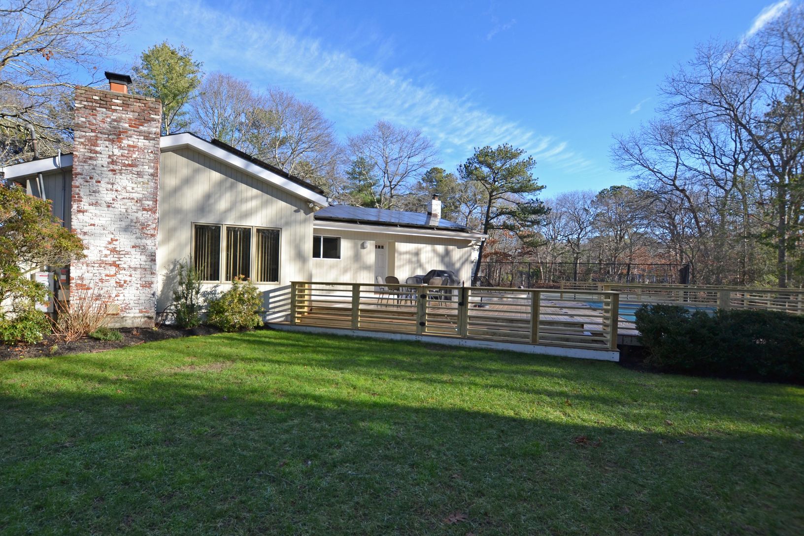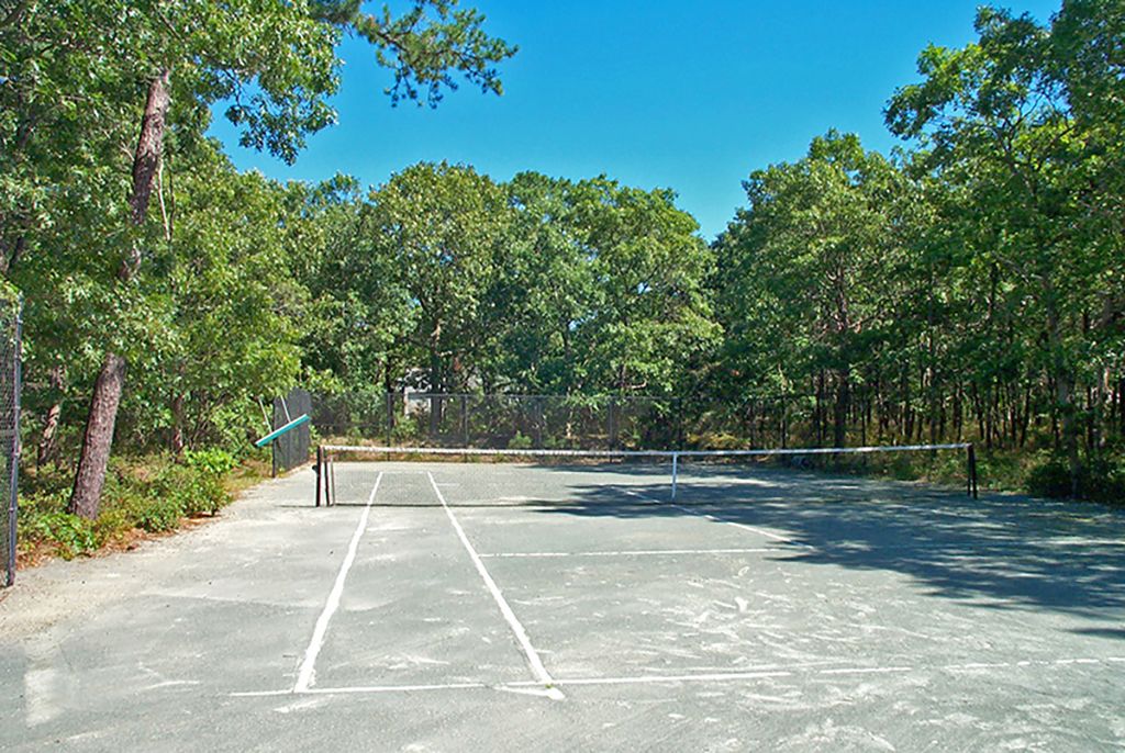 One level contemporary with open kitchen, dining area, and living room looking out onto the Timbertek composite deck. Inground heated pool, Har-tru tennis court, and outdoor shower. Detached two car, two story garage with separate hot water tank, oil tank, and heat, ideal for a home office, artist studio, gym/play area, etc. Four bedrooms (two with sliders looking out to deck and tennis court). Partial basement plus easily accessible crawl spa