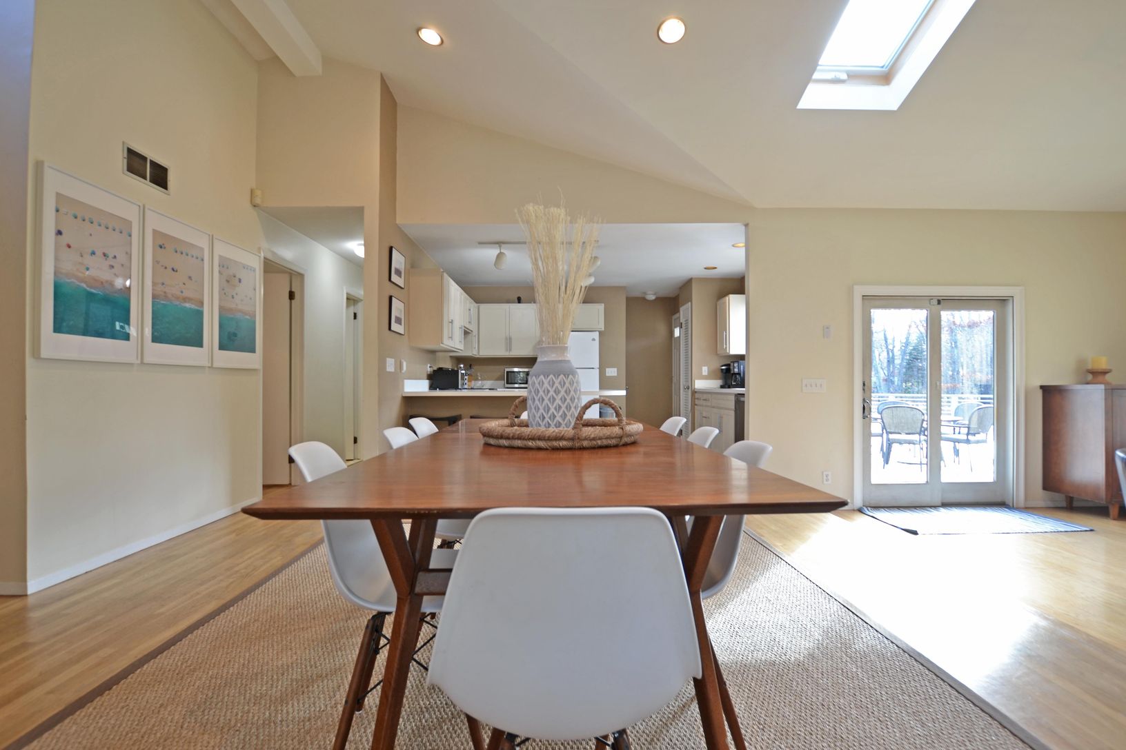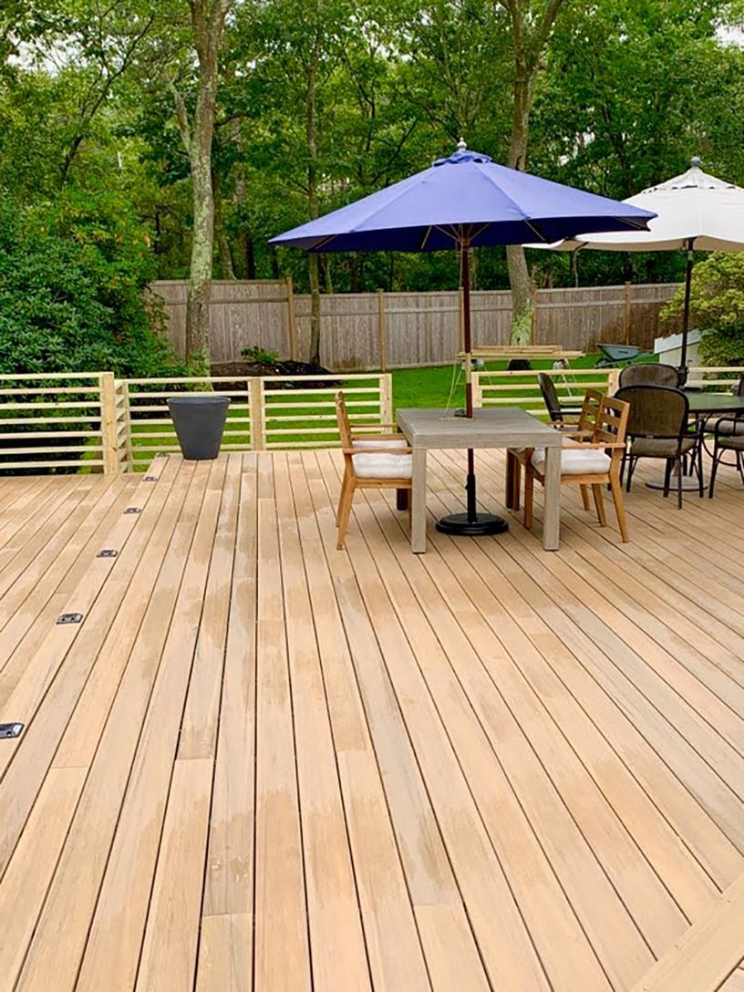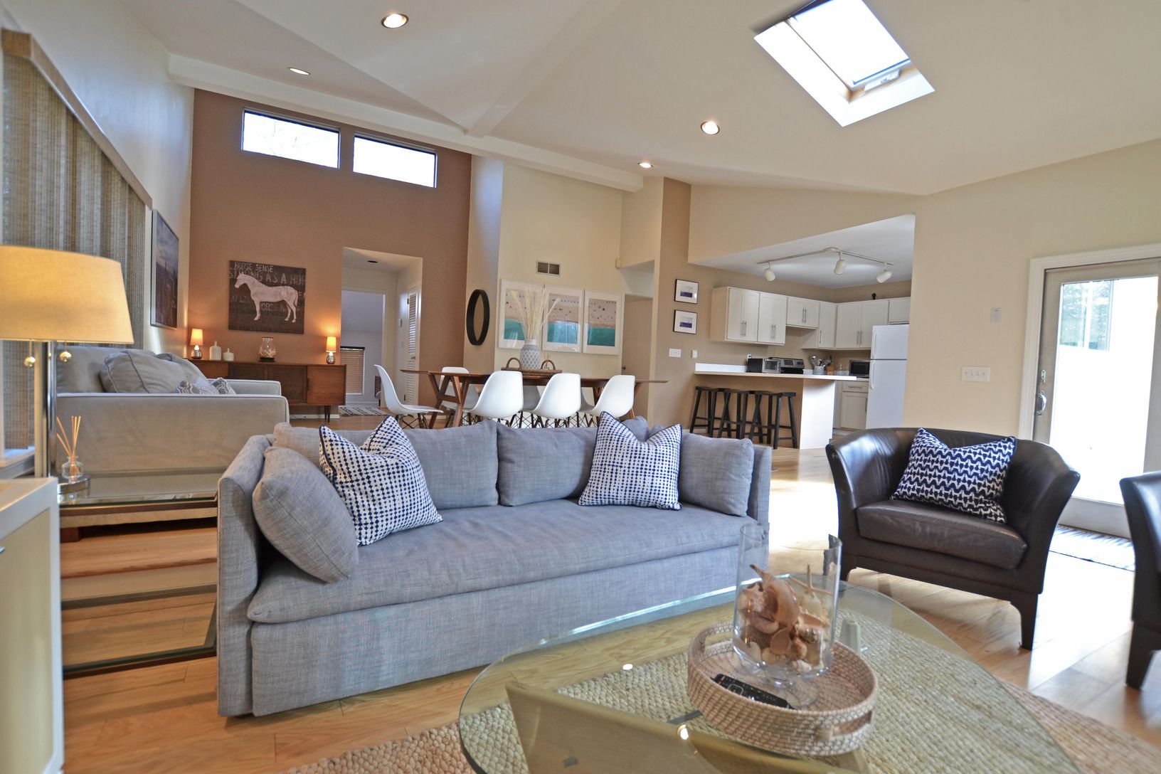 One level contemporary with open kitchen, dining area, and living room looking out onto the Timbertek composite deck. Inground heated pool, Har-tru tennis court, and outdoor shower. Detached two car, two story garage with separate hot water tank, oil tank, and heat, ideal for a home office, artist studio, gym/play area, etc. Four bedrooms (two with sliders looking out to deck and tennis court). Partial basement plus easily accessible crawl spa