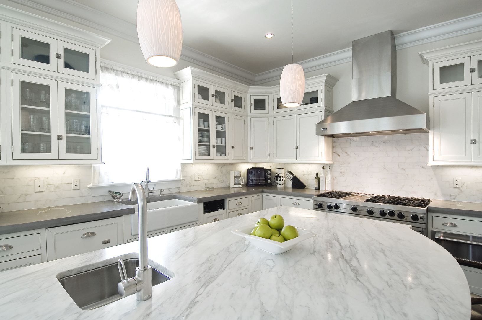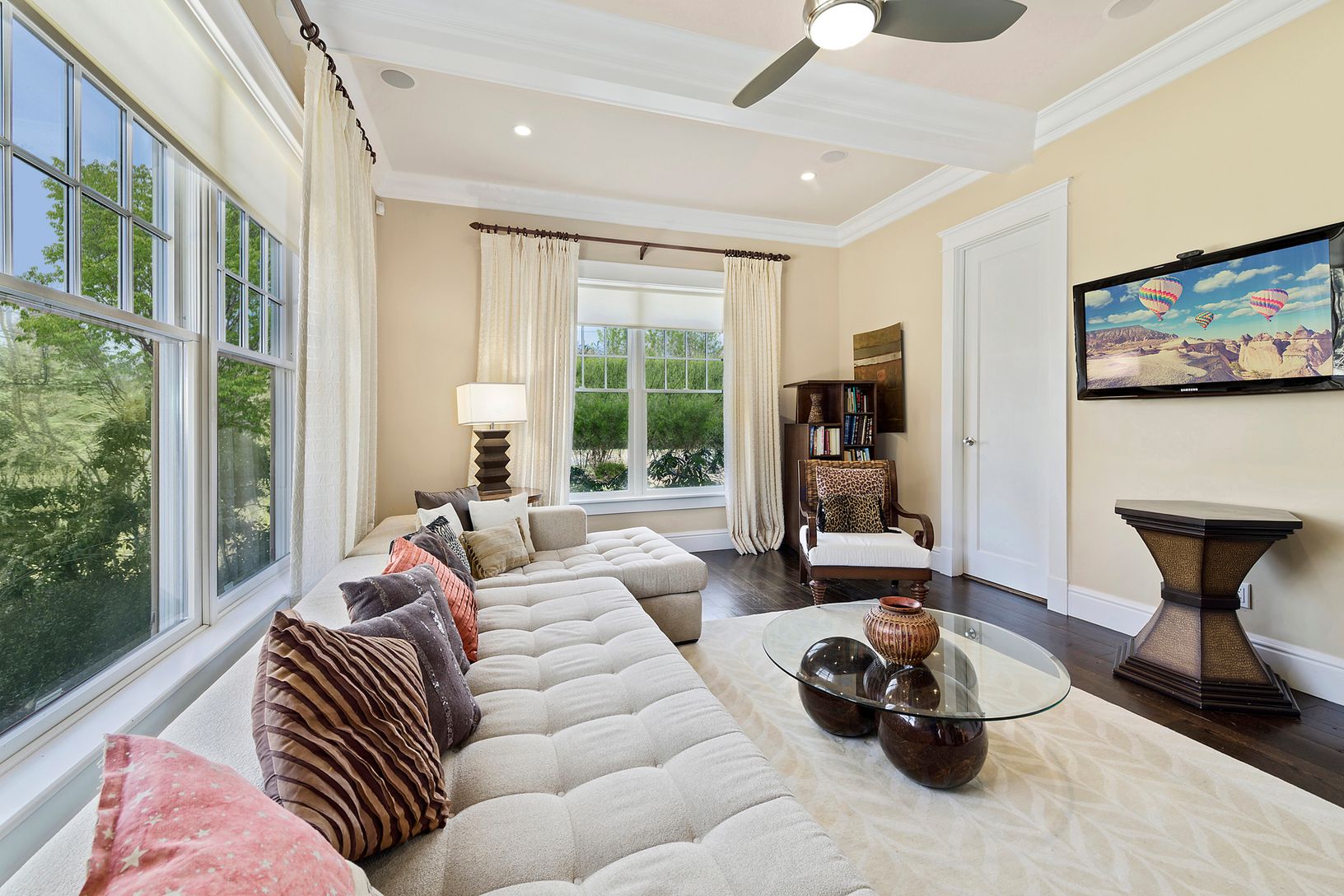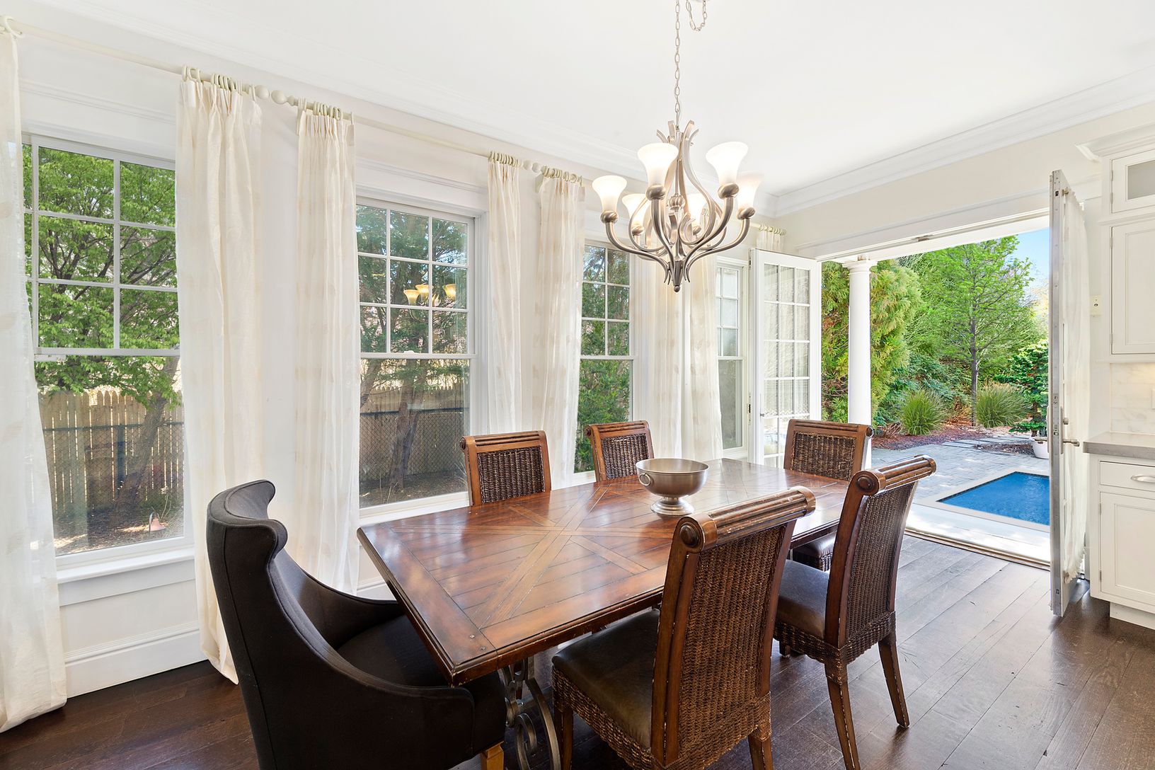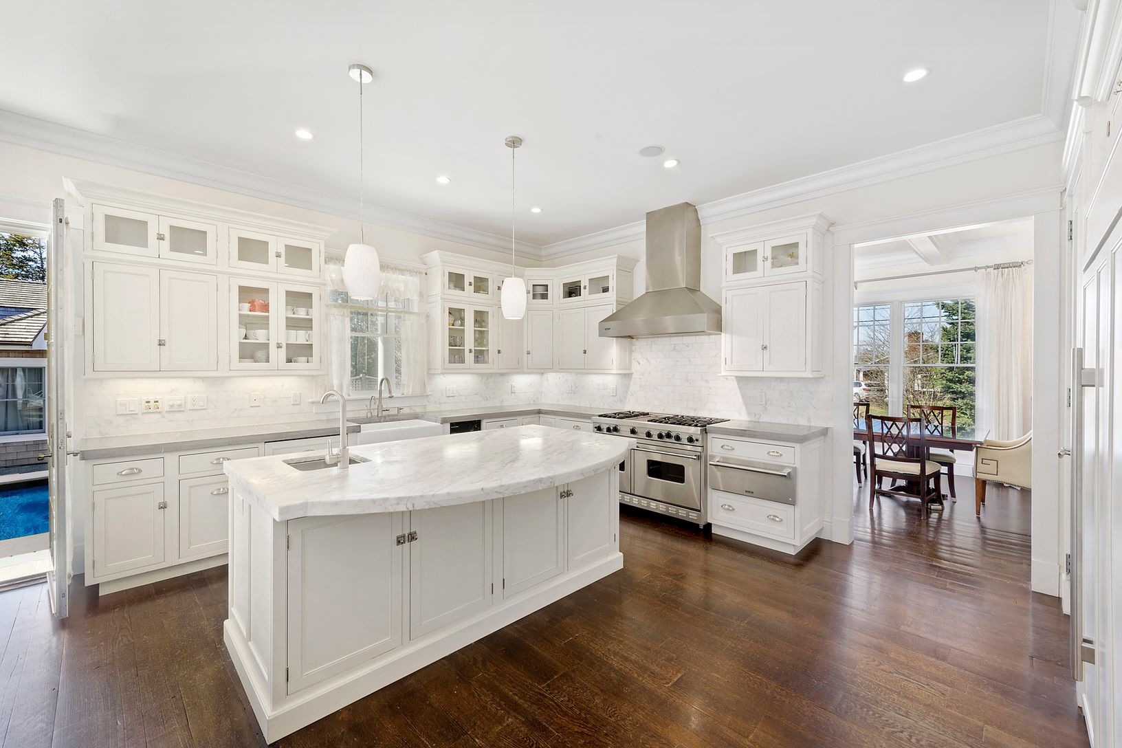 The only way to describe this 4,400-sq.-ft. home is elegance personified. Large living room with stone fireplace and French doors, formal dining room, media room, gourmet eat-in-kitchen with top-of-the-line appliances and marble topped center island. Five bedrooms including first-floor guest bedroom, large second-floor master with fireplace and study, and five and a half baths. In addition there is central air, separate garage, pool house, 12'