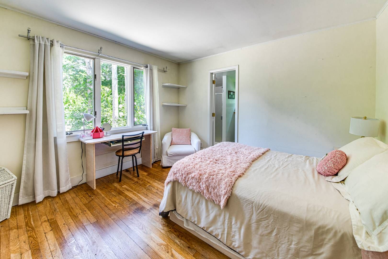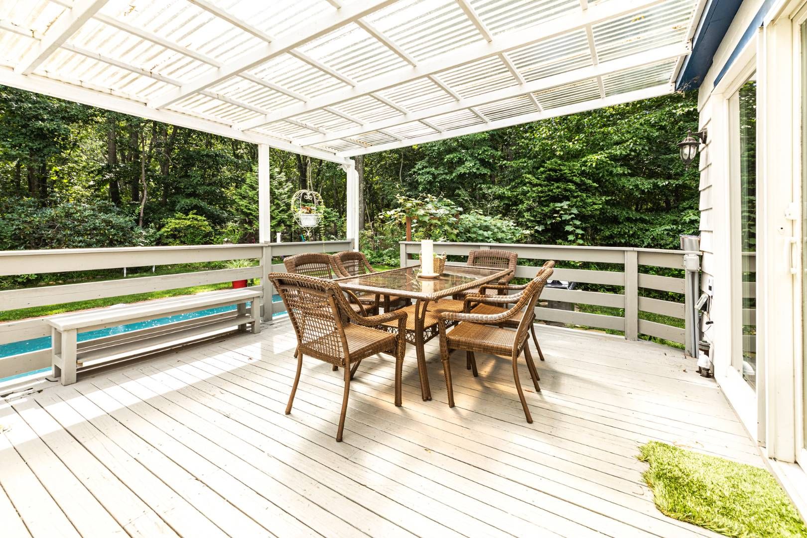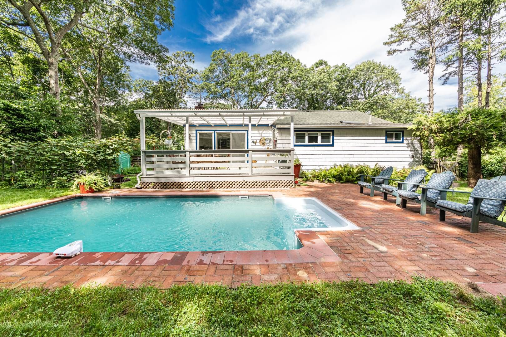 Good things DO come in small packages! This clean and bright ranch style home is deceiving to the eye. There are 5 total bedrooms, 3 of which are ensuite, and 4.5 bathrooms tucked into this tidy package.The main living room features hardwood floors and a wood burning fireplace. The adjacent eat in kitchen opens to a large covered deck that overlooks the back yard and pool area. The main level also features a primary en suite bedroom, and two a