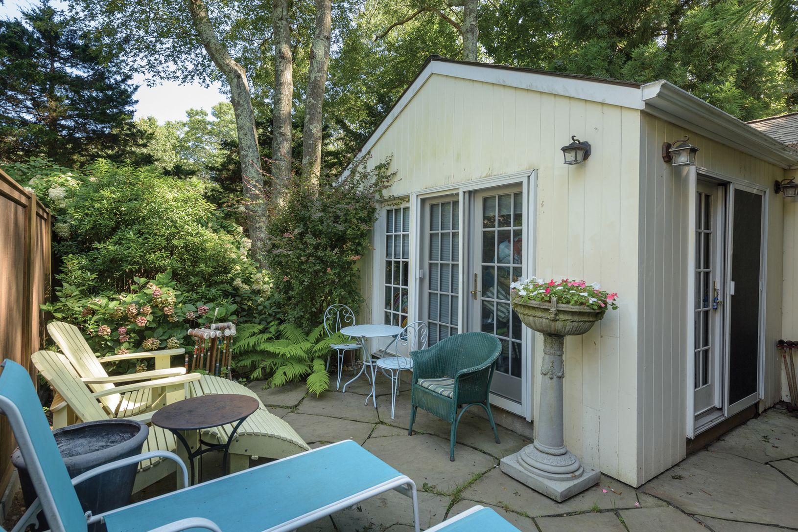 In East Hampton's bucolic Springs, behind an automatic gate and completely fenced and landscaped for privacy, discover a totally quiet oasis, with a main house and two accessory structures. First floor living areas in the home are bright with skylights and white walls and ceilings reflecting light through the rooms. The double height living room with wood-burning fireplace is open to the eat-in kitchen with tiled countertops and backsplash, di
