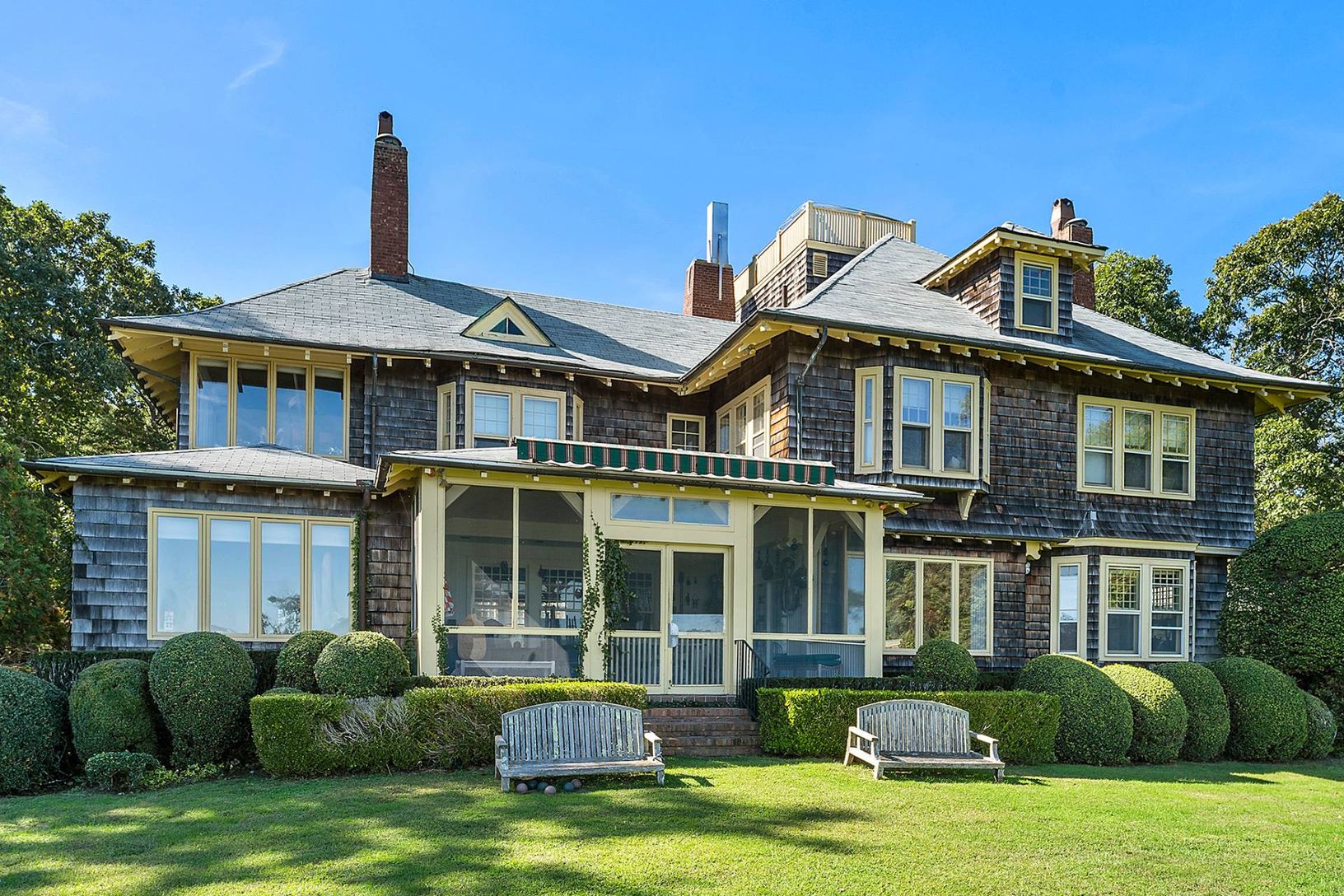 Welcome to "Alden House", an elegant and historic waterfront compound sited on 5.8 sumptuous acres in the hamlet of Quiogue. Secluded, yet very close to village shops and ocean beaches this south-of-the-highway compound features a gracious manor house in the classic arts and crafts style with generously proportioned rooms and gathering spaces including stunning architectural elements throughout. The gorgeous 10-bedroom, 10.5 bathroom main hous