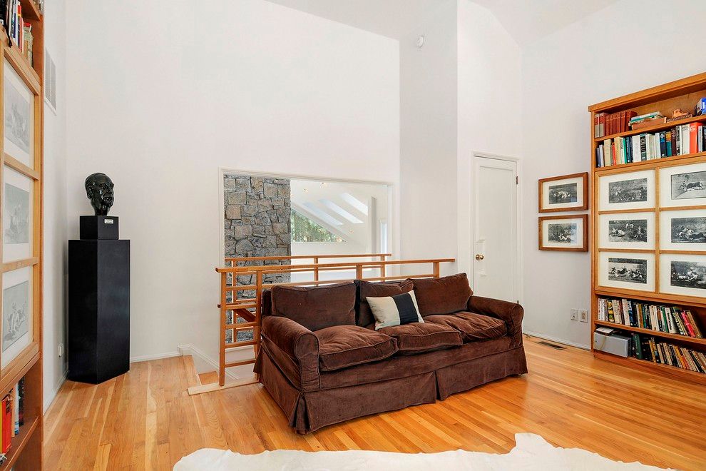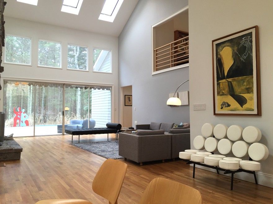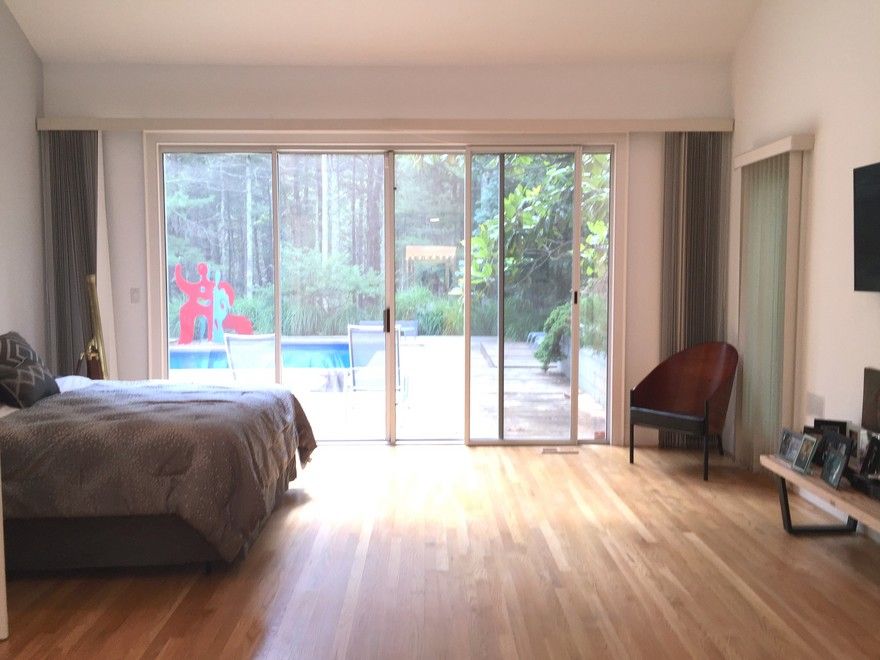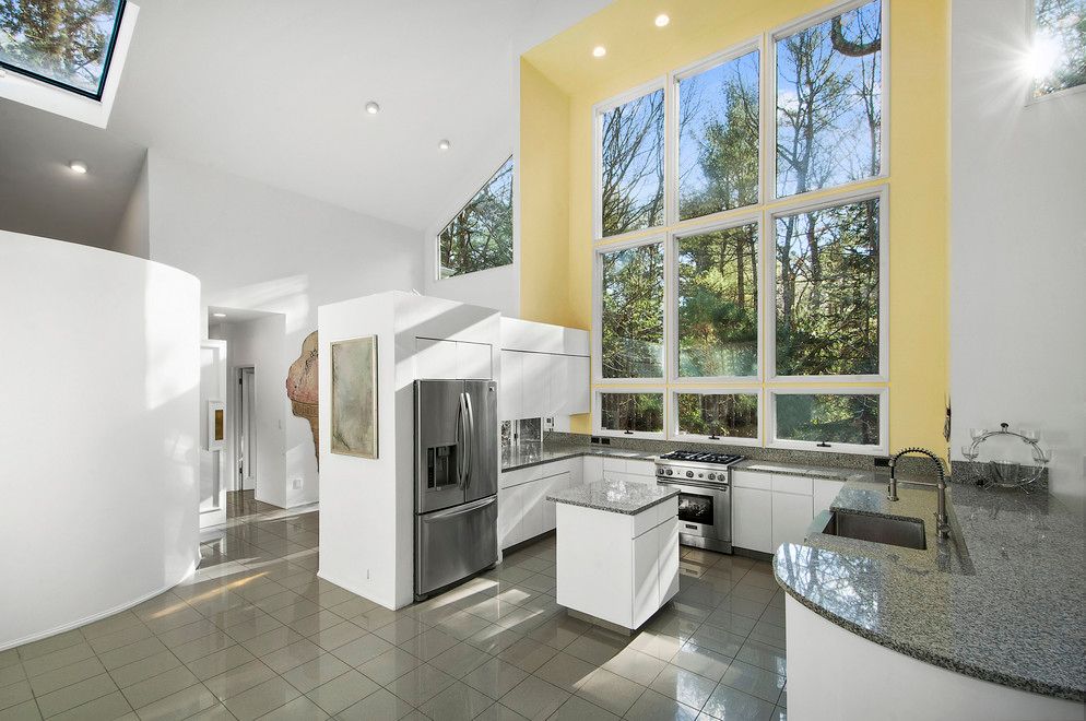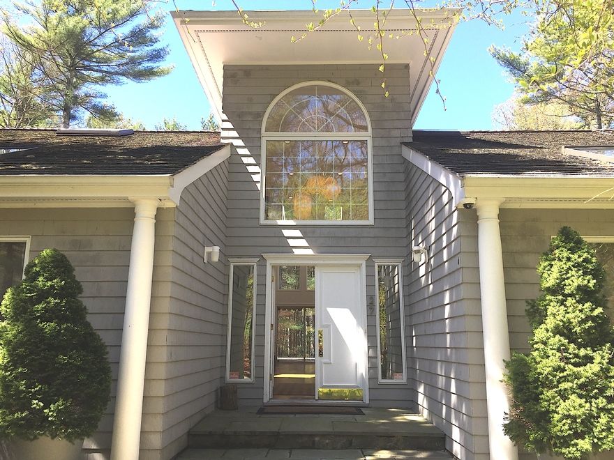 On the quiet cul-de-sac of Bull Run is a light filled 4700 sf modern/contemporary. With its two story walls of windows and 15 sky-lights set on 1.93 acres is this exceptional home with bragging rights having one of the tallest fireplaces in the Hamptons. The formal living room includes a TV nook (one of 5 flat screen TVs); 5 bedrooms (all suites) plus a Den/Loft ~ which can be used as a 6th sleeping area. The first floor master suite bath incl