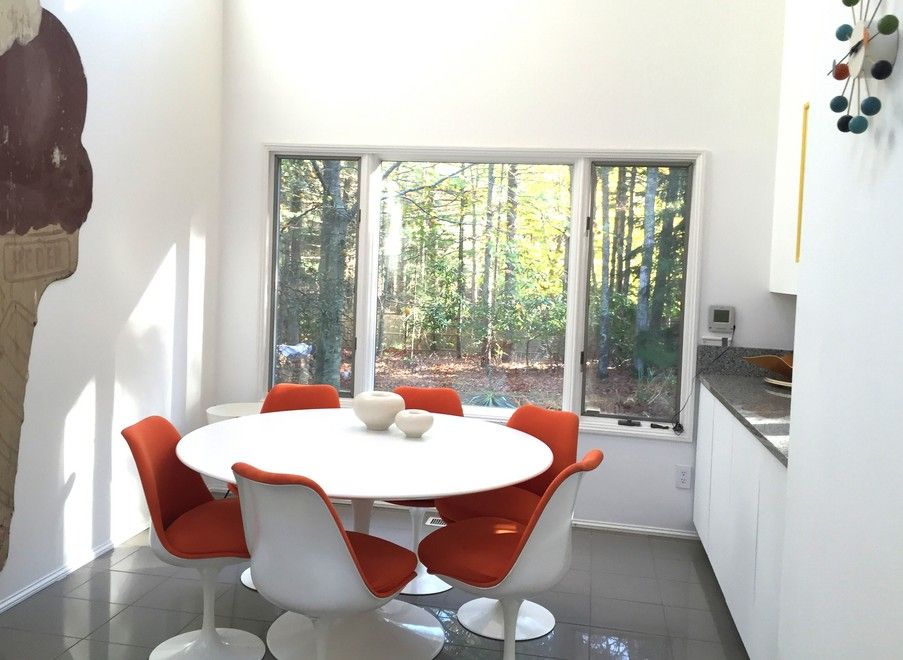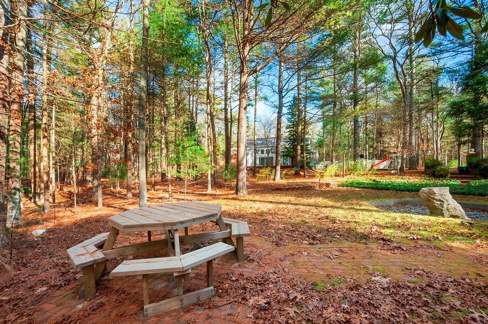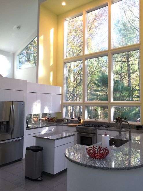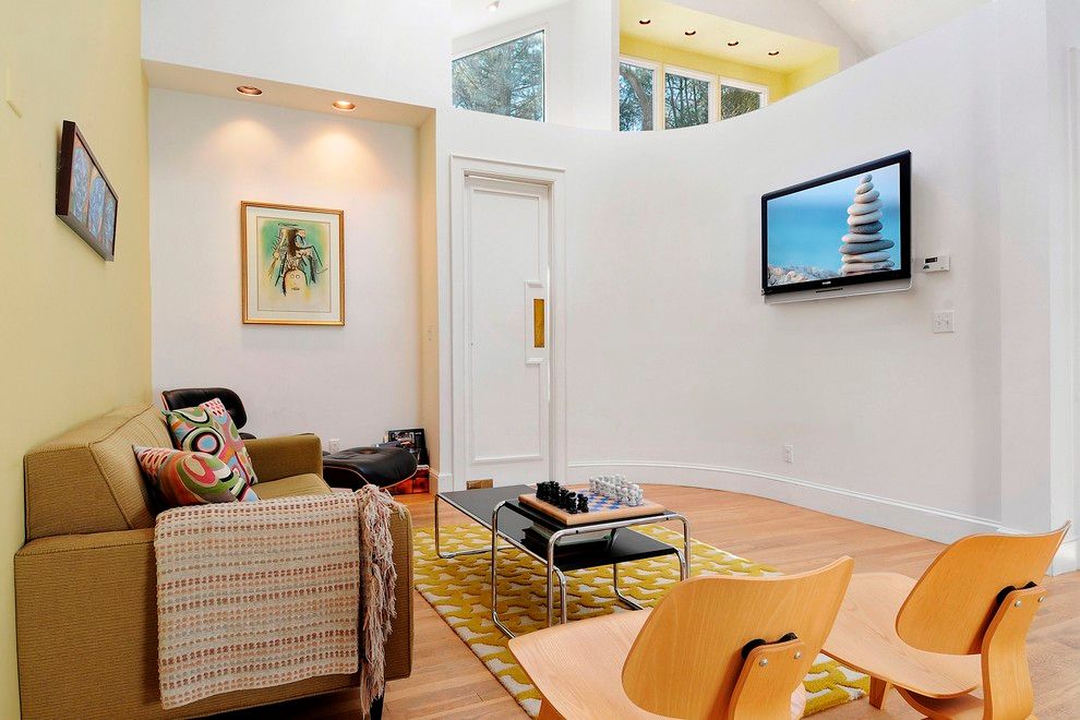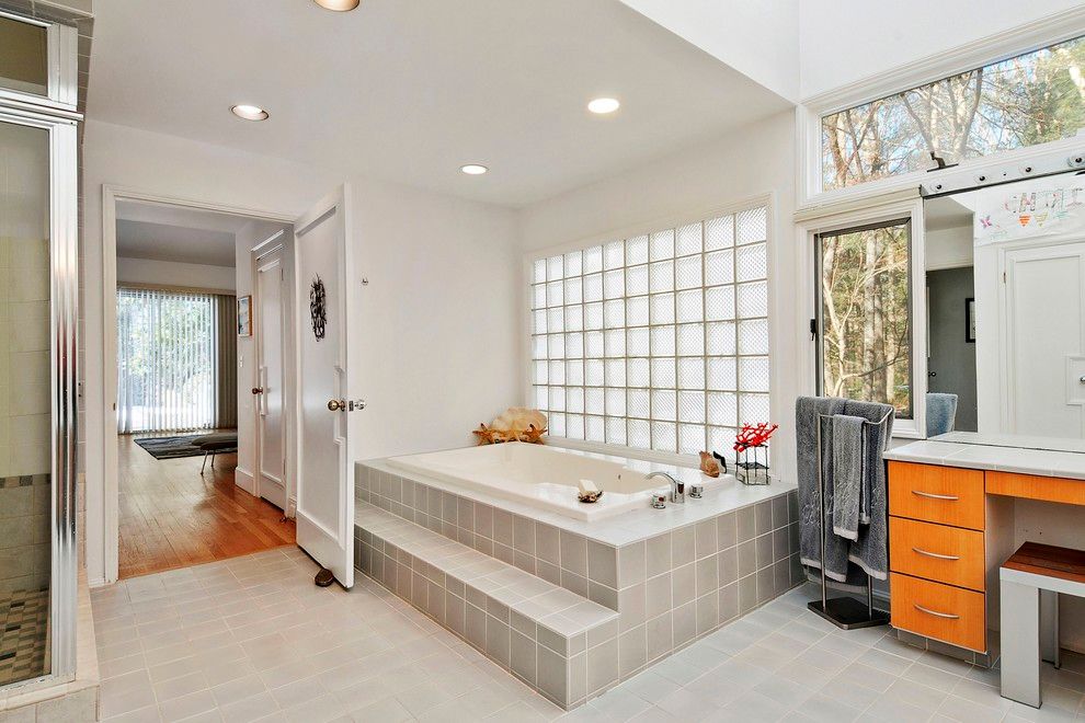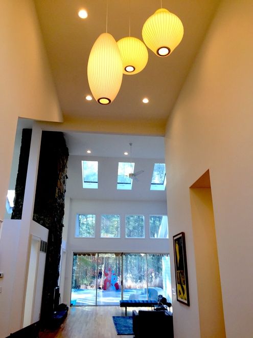 On the quiet cul-de-sac of Bull Run is a light filled 4700 sf modern/contemporary. With its two story walls of windows and 15 sky-lights set on 1.93 acres is this exceptional home with bragging rights having one of the tallest fireplaces in the Hamptons. The formal living room includes a TV nook (one of 5 flat screen TVs); 5 bedrooms (all suites) plus a Den/Loft ~ which can be used as a 6th sleeping area. The first floor master suite bath incl