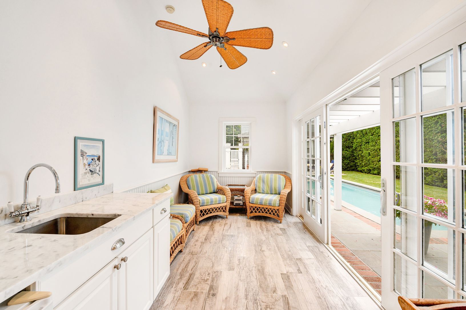 This charming Southampton home sits in the heart of the village just moments from all the amenities and attractions of Main Street. It has undergone several renovations over the years and its appeal is further enhanced by manicured gardens on all sides of the property. Enter this immaculate home through an attractive sun porch. The first floor of this airy and light-filled residence features a spacious living room with a gas fireplace, a win