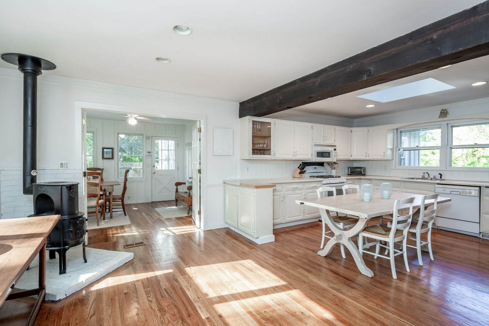 This East Hampton, light filled, spacious, impeccably maintained 4 bedroom, 3.5 bath home is the perfect getaway. Located in the renowned Springs art community, this recently renovated 3600 sqft home over three levels, is sited on a very private .47 acres at the end of a cul-de-sac, bordering a 23-acre nature preserve. Featuring an open layout, the main level includes a large eat-in country kitchen that flows to a separate dining area and livi
