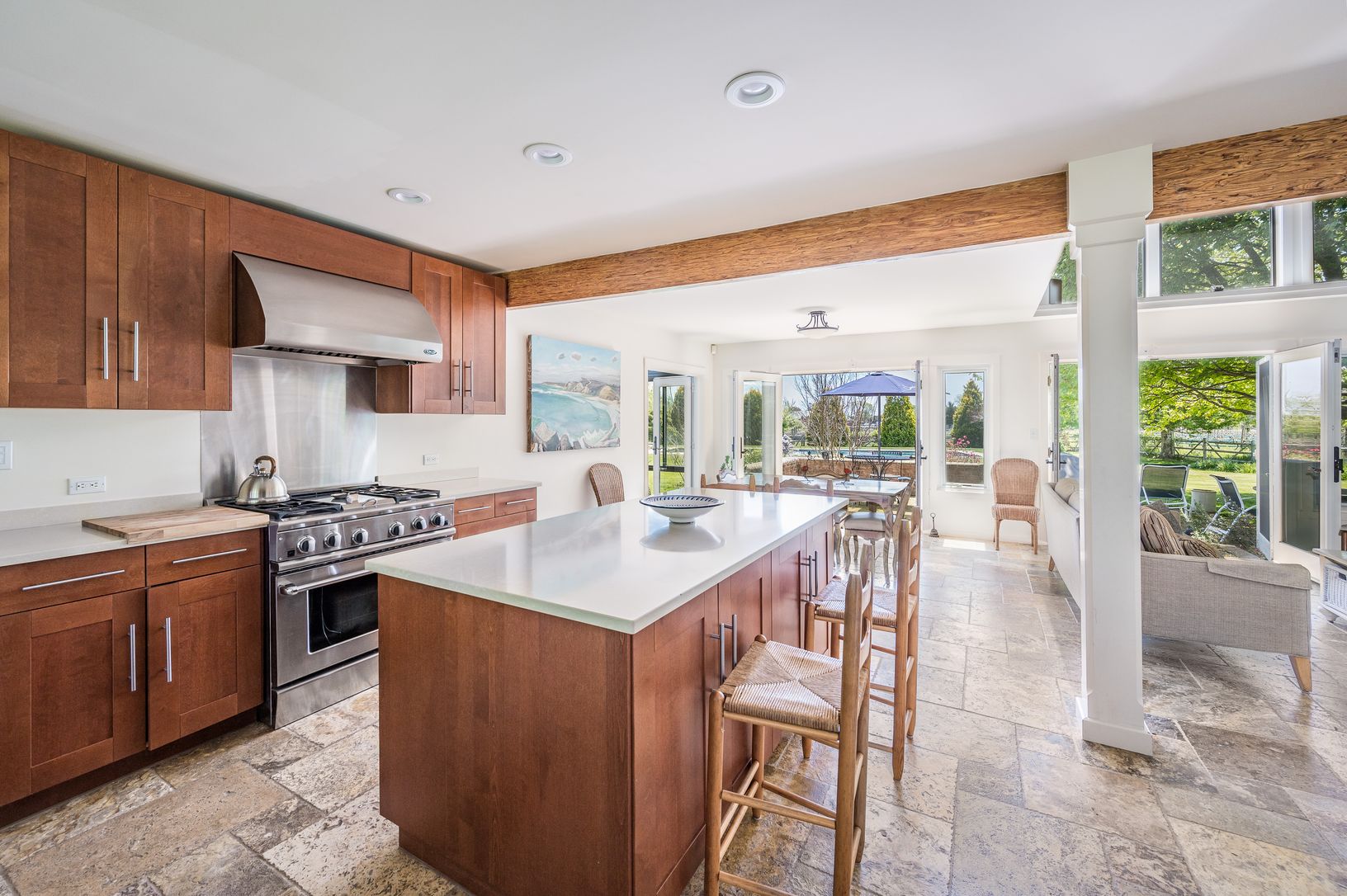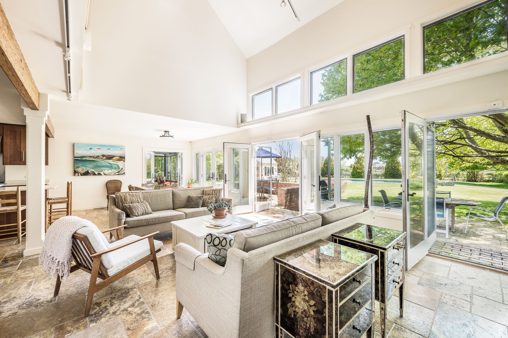 At the end of a Cul-de-Sac down a long privet lined flag lot driveway lies this very secluded Tuscan feeling gem surrounded by the vineyards. Completely renovated in 2010 this 4 bedroom, 3.5 bath special energy efficient Bill Chaleff designed and built saltbox is ready for your summer joy! This house features both an upstairs and a downstairs master bedroom suite, large double height ce