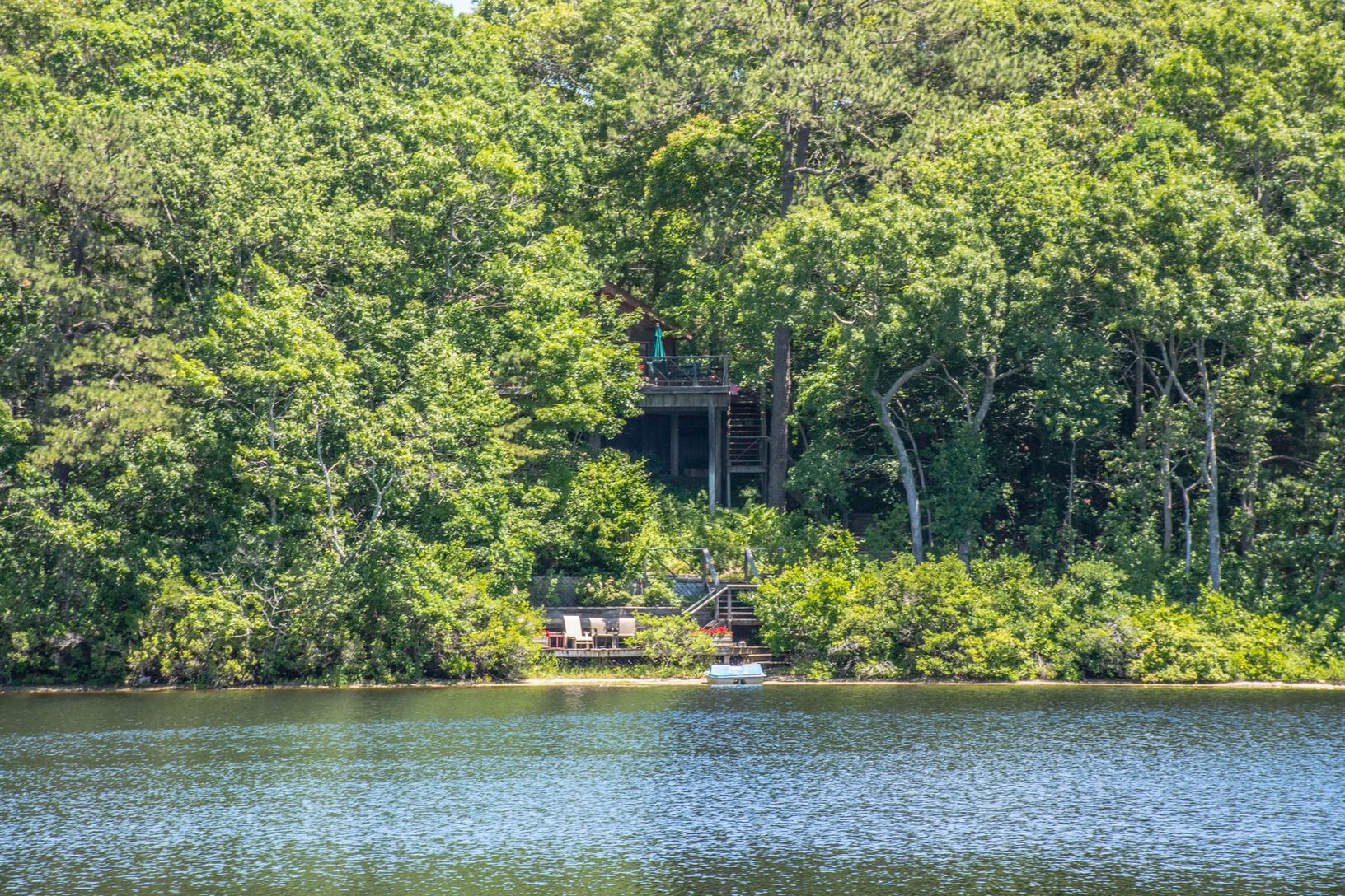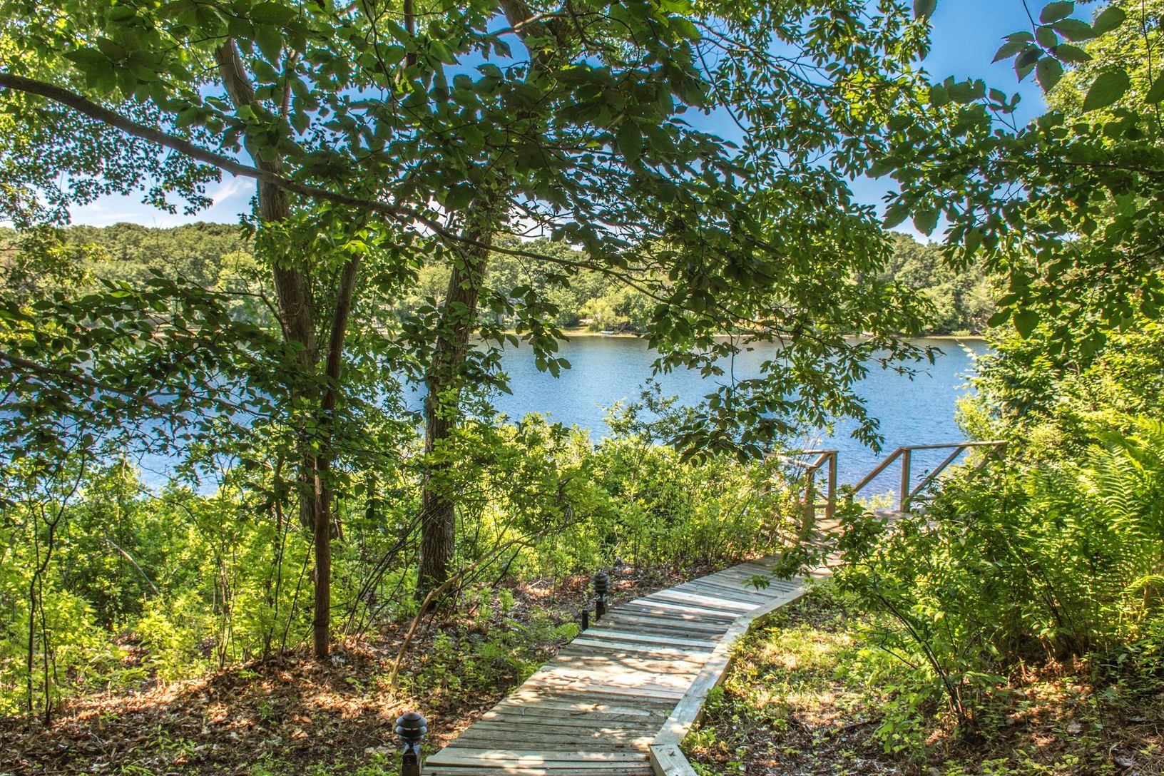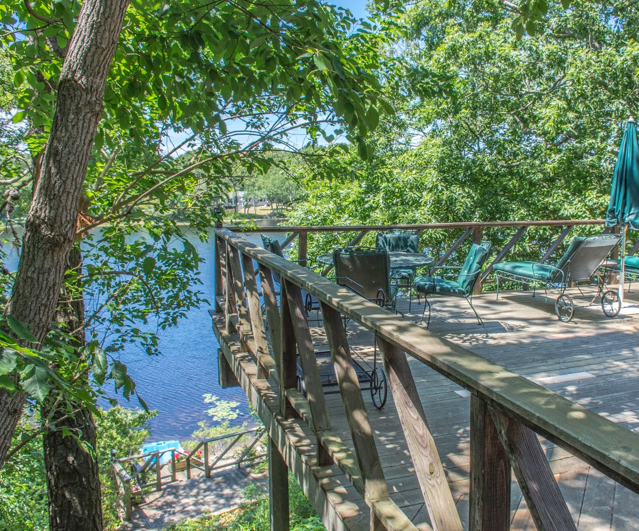Approach with increasing excitement onto higher and higher ground, at the end of a cul-de-sac and come upon this contemporary home against the sparkling water of Little Fresh Pond with dock and outdoor Jacuzzi. Sunbathe or watch sunsets from your aerie or take the flights of stairs to your private Dock and picnic on private deck and beach. Inside, every room has a view and a feeling of expansiveness with its cathedral ceilings and wall to