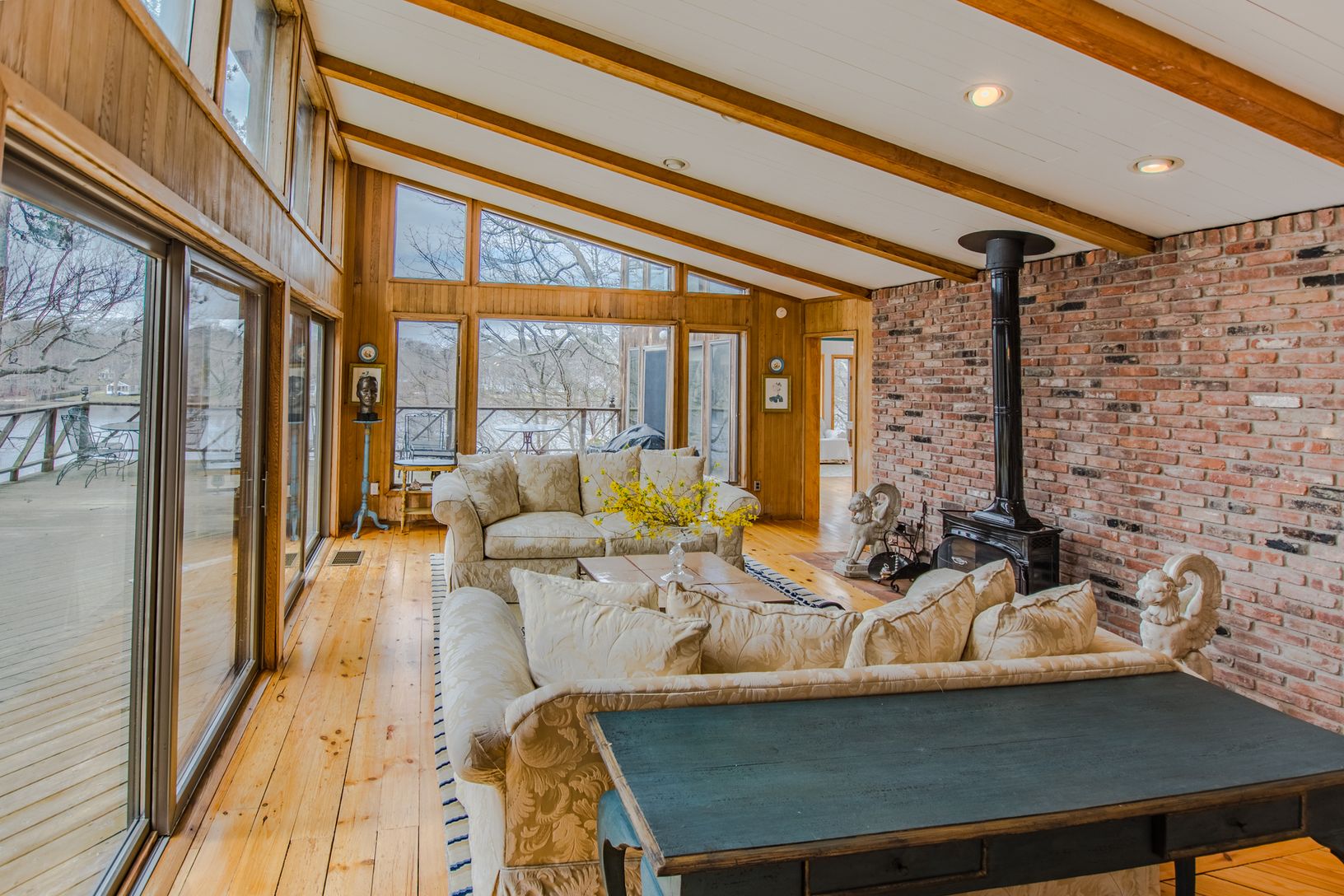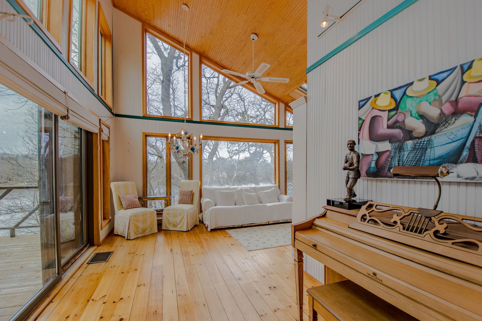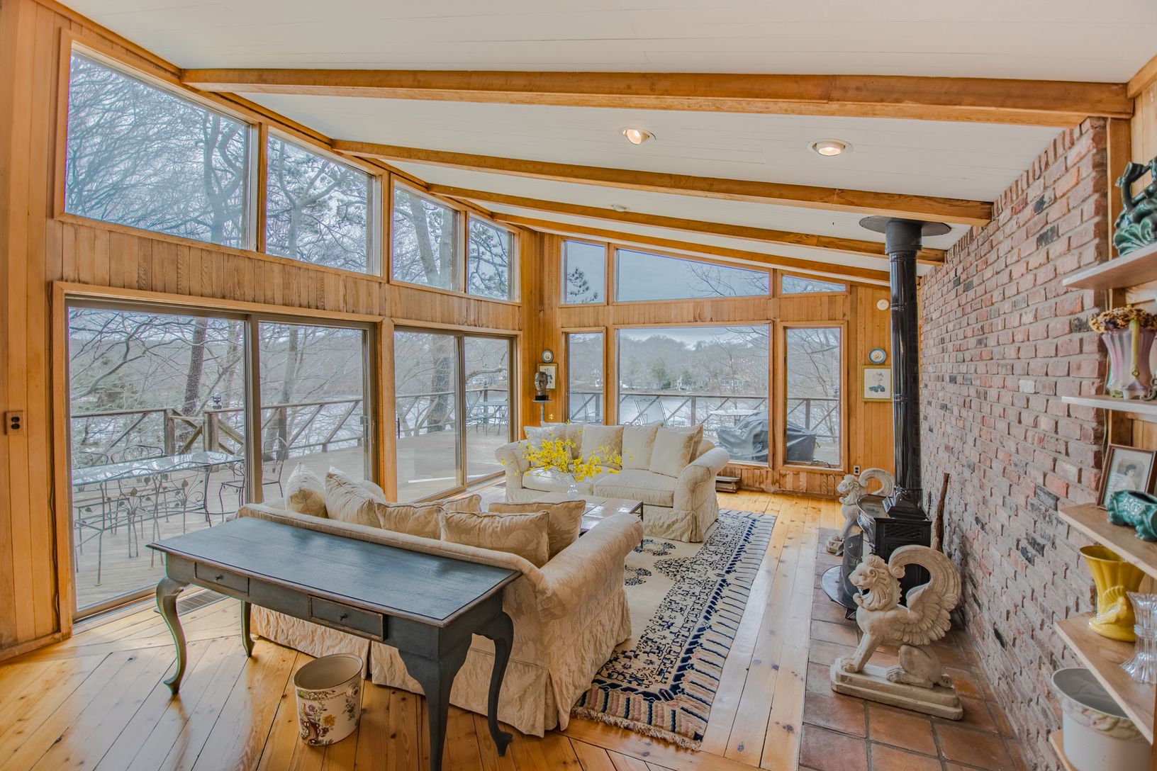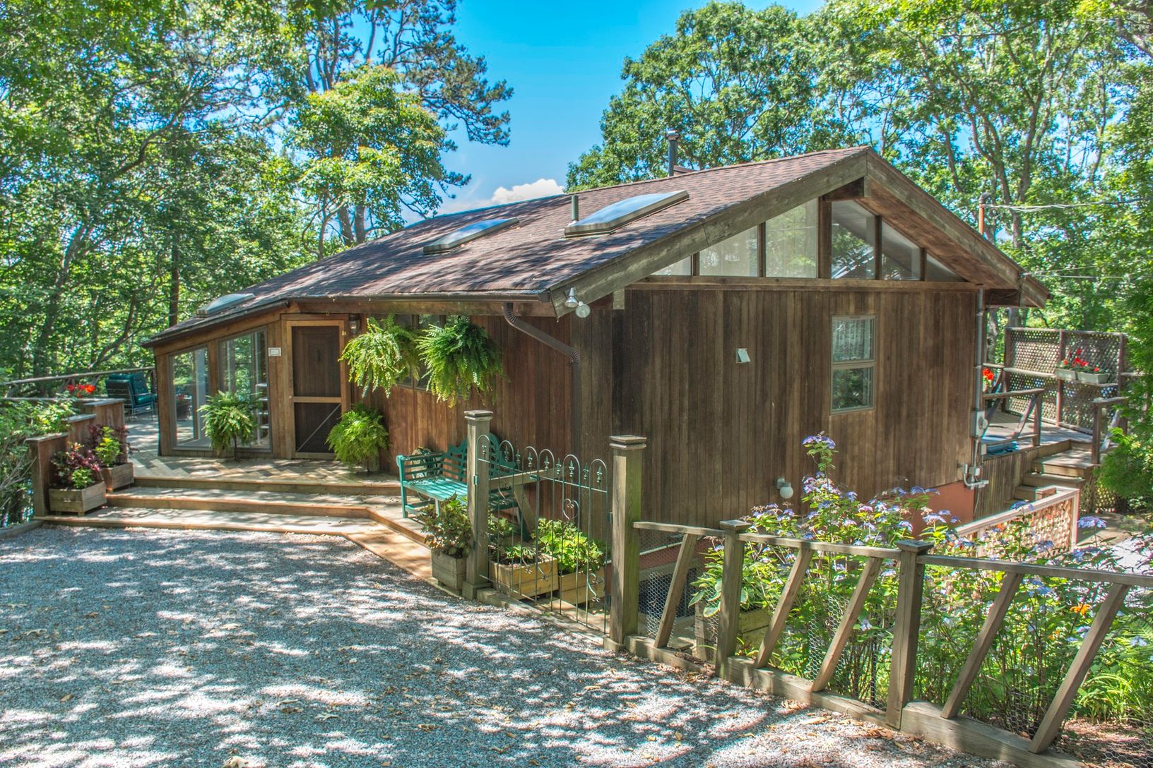 Approach with increasing excitement onto higher and higher ground, at the end of a cul-de-sac and come upon this contemporary home against the sparkling water of Little Fresh Pond with dock and outdoor Jacuzzi. Sunbathe or watch sunsets from your aerie or take the flights of stairs to your private Dock and picnic on private deck and beach. Inside, every room has a view and a feeling of expansiveness with its cathedral ceilings and wall to