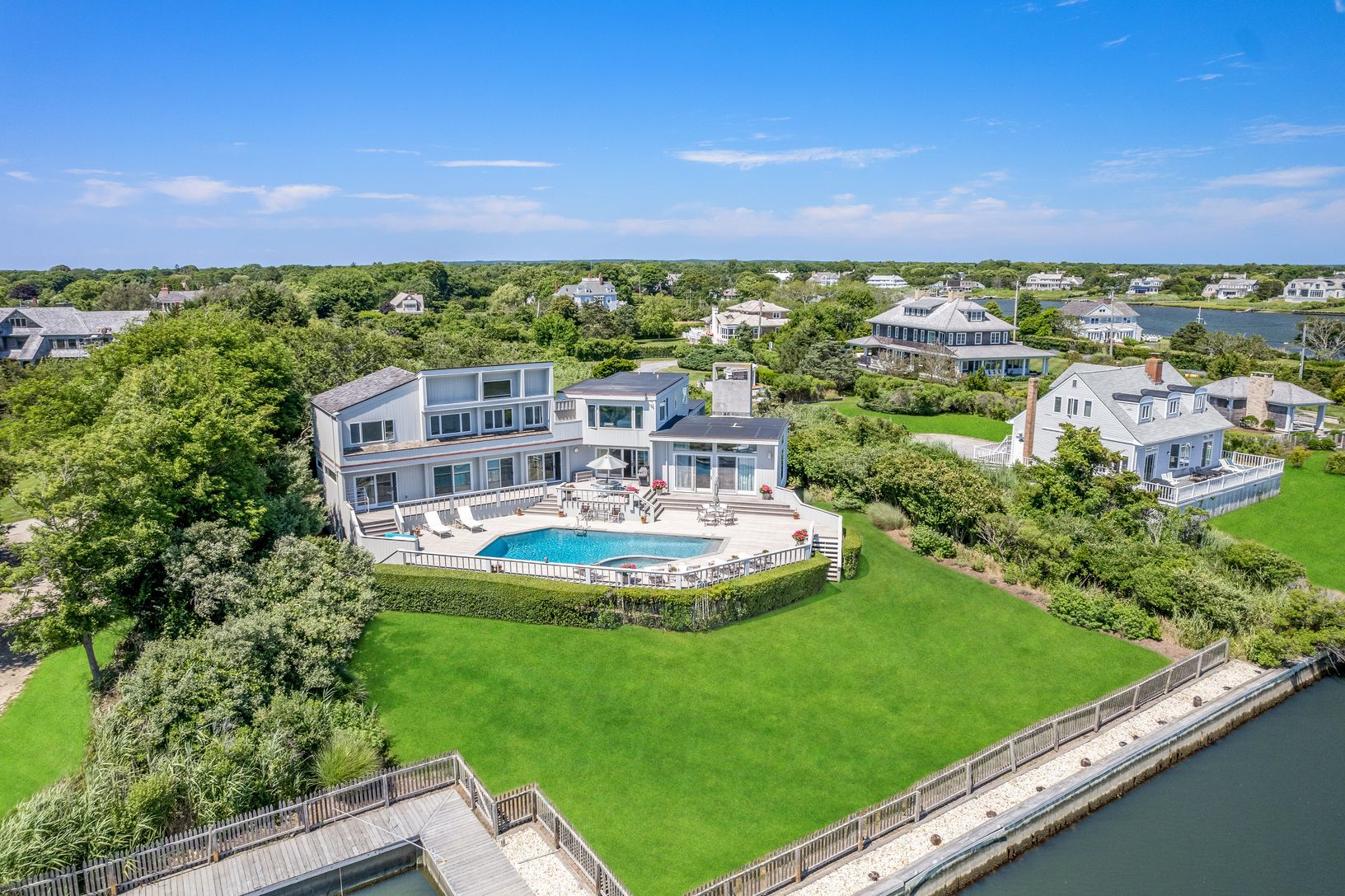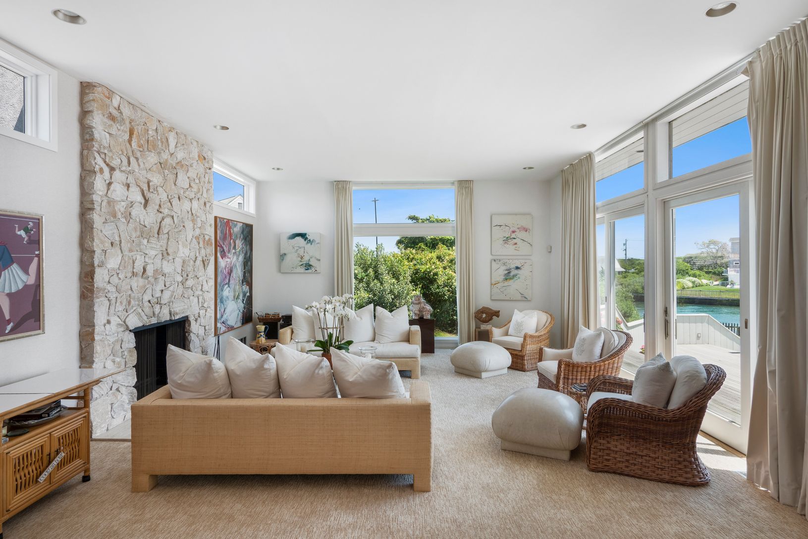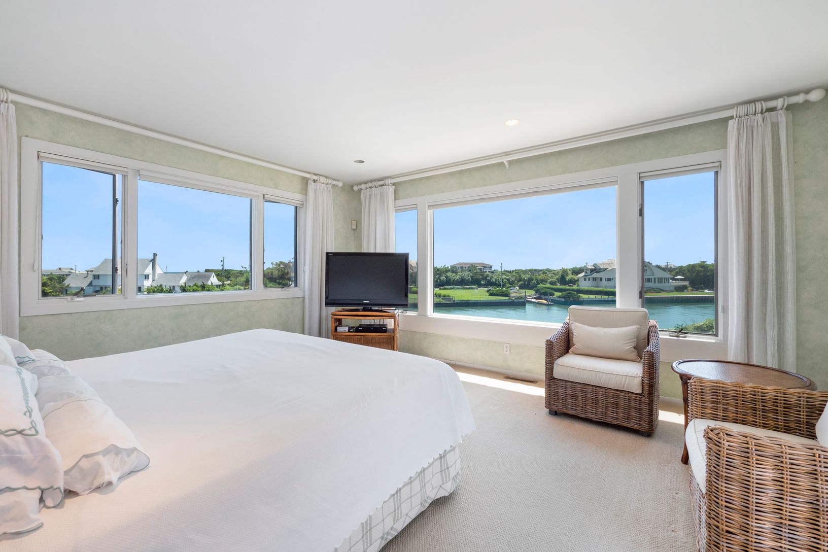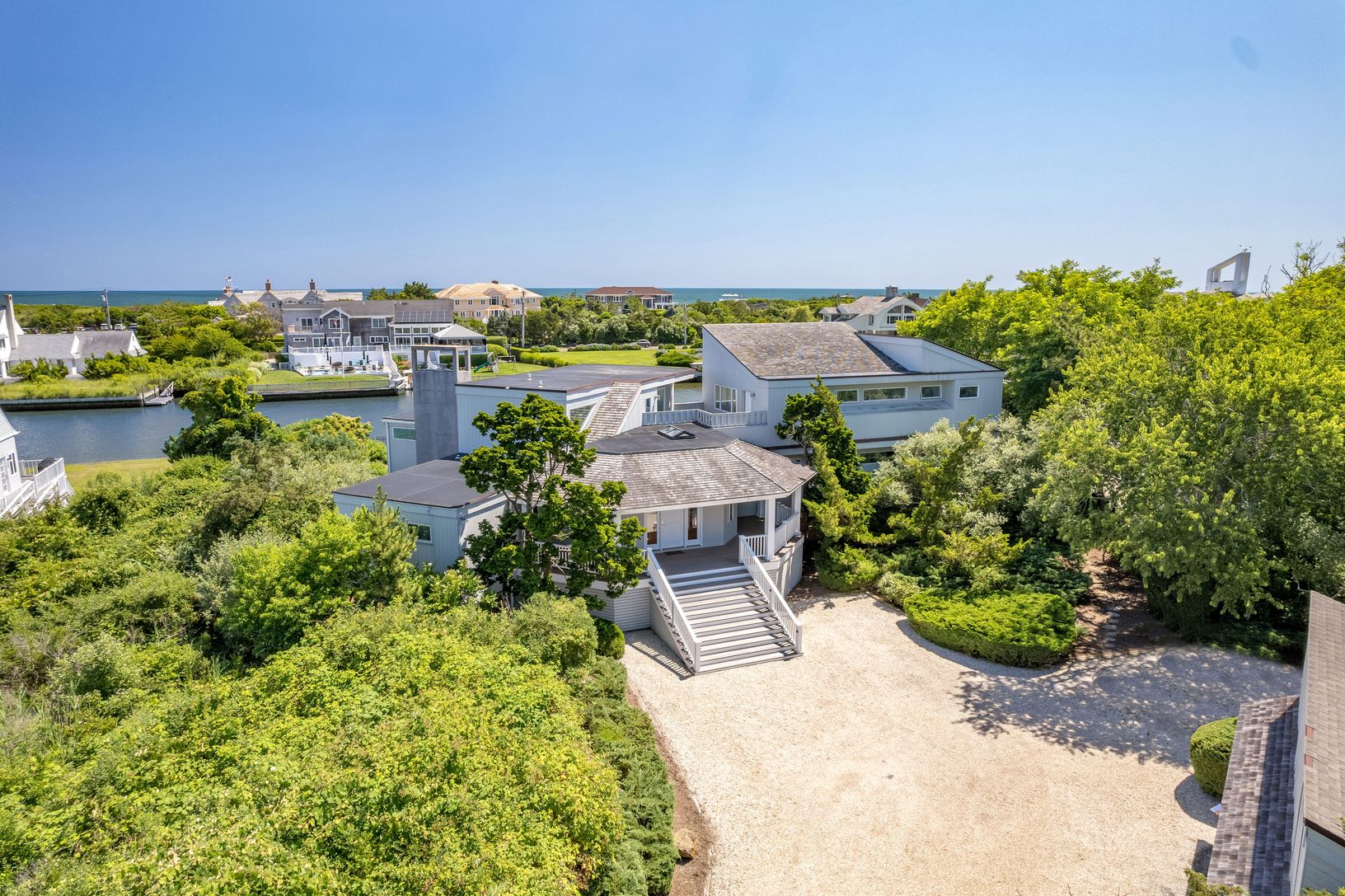 Secluded at the end of a quiet cul-de-sac, this 5-BR Contemporary opens on the back side to extraordinary views of the Quogue Canal and glimpses of the ocean beyond. An airy foyer leads to a main living area with floor-to-ceiling windows, sliding glass doors, and sea breezes from every direction. Also on the first floor are three bedrooms with adjoining baths, laundry, an open kitchen, and a sunny family room/den. Upstairs the primary suite ha