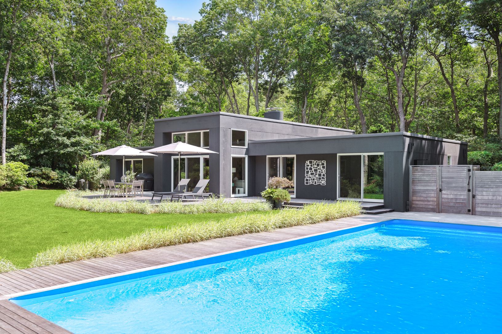 This meticulously renovated Harry Bates modern has 3 bedrooms, 2 baths, and a 20 by 40 heated pool on a shy one acre, full of rhododendrons along a beautiful reserve. Featured in Hamptons Cottages & Gardens magazine in 2022, and in their Hamptons 20th Century Modern Home Tour, this one level home and its grounds offer an incredible opportunity to own a one-of-a-kind showplace in East Hampton. The property was also recently featured in a Ho