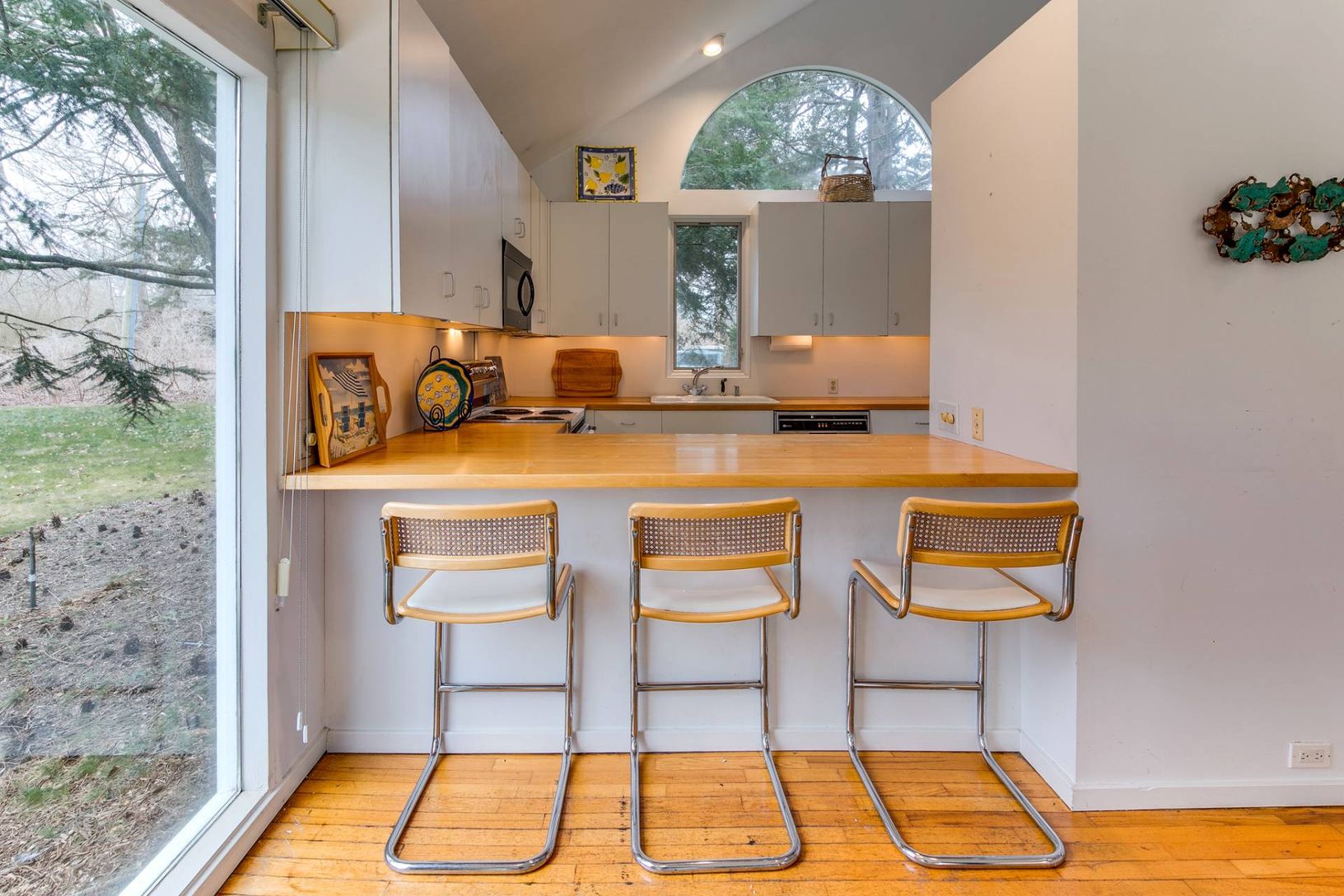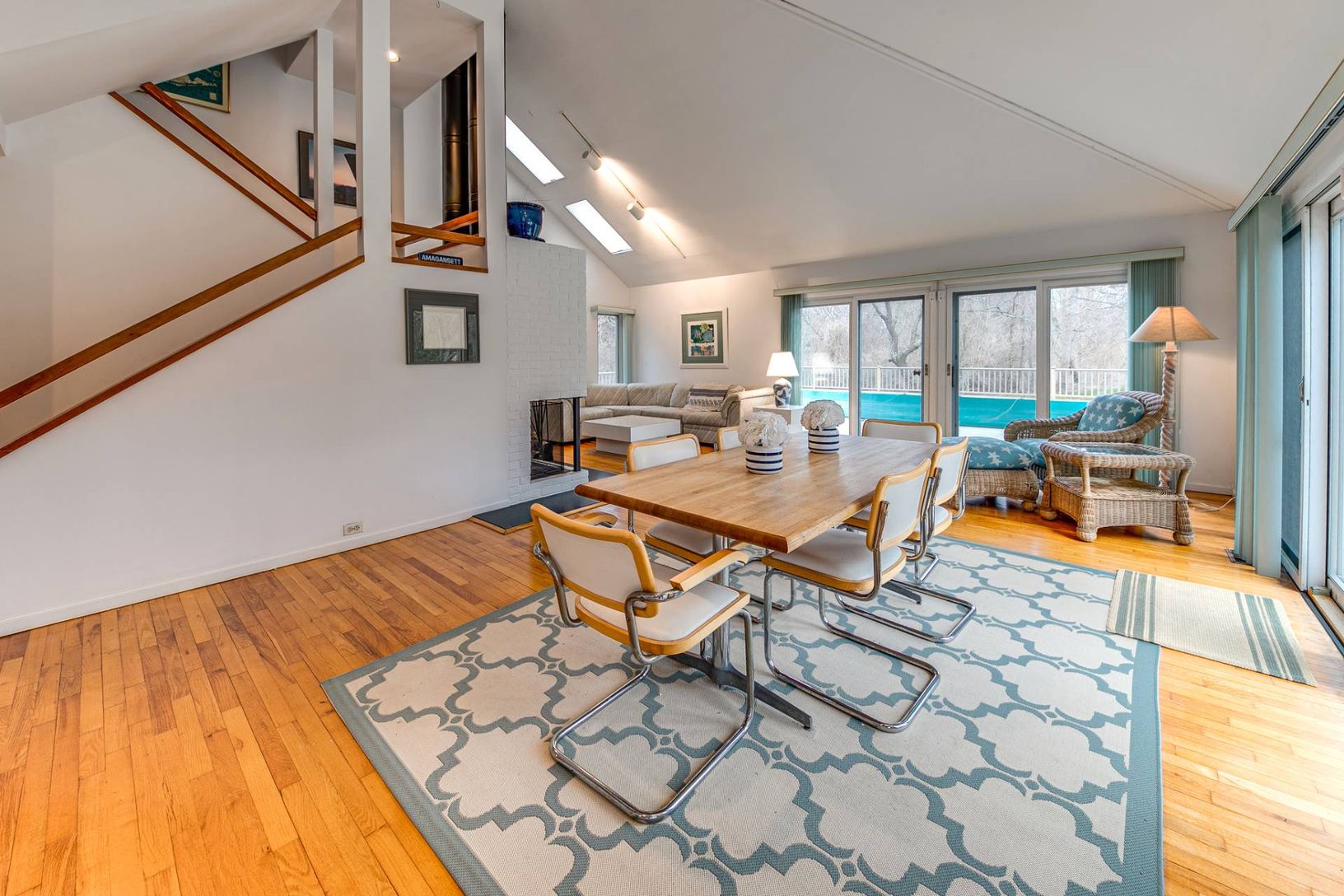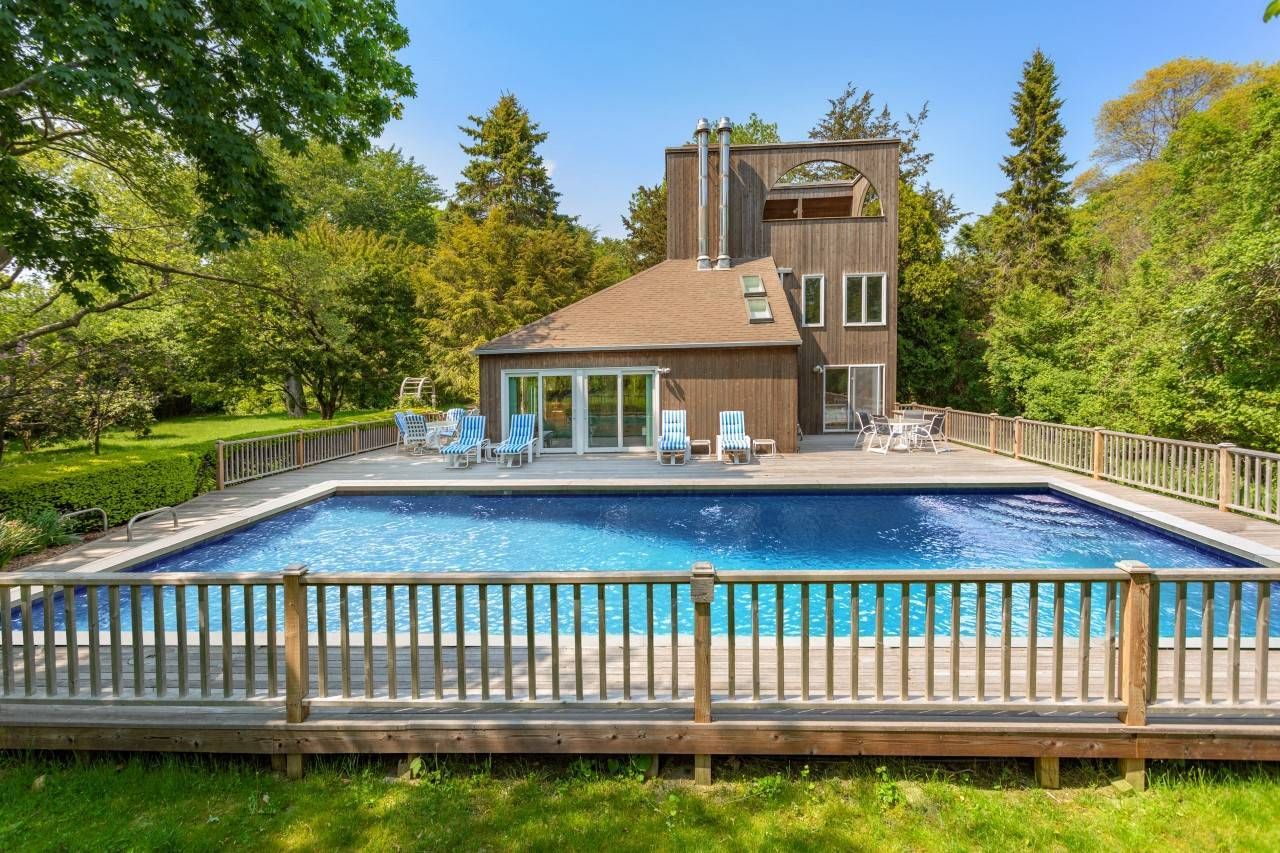 Situated in the Amagansett Lanes, less than 1 mile from Atlantic Beach, this gated 4 bedroom, 2 full bath contemporary with a pool is set on 2 acres where spacious lawns and mature trees provide privacy. Close proximity (0.7 mi) to the village via quiet streets with sidewalks lead you to Amber Waves farmers market, Amagansett square and local restaurants. Bright and airy interiors are finished with wood floors, white walls and high ceilings. L