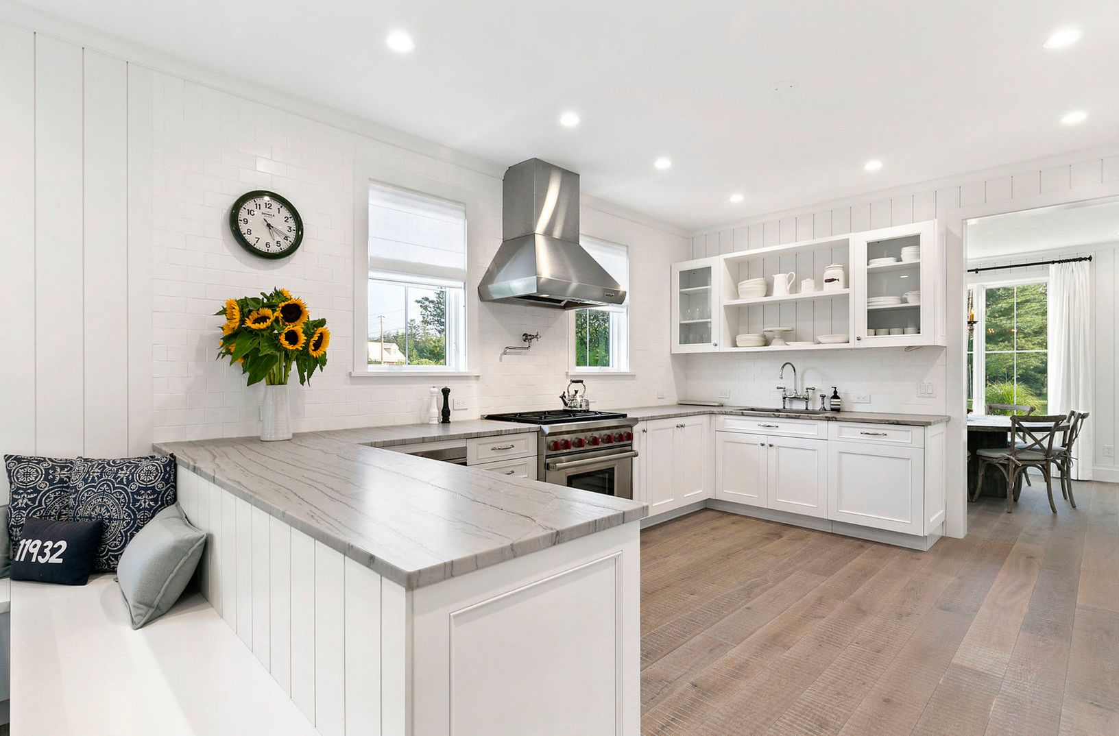 A pristine remodel, expansion and renovated Modern Farmhouse with cedar siding is what you will find at 27 Peninsula Drive. The owner focused on creating an inviting home with great attention to detail that is rarely seen at this price point. The textured 7 inch oak floors, imported from England, create a warm welcome, and the over sized casement windows allow maximum natural light exposure throughout the house. The great room has over sized