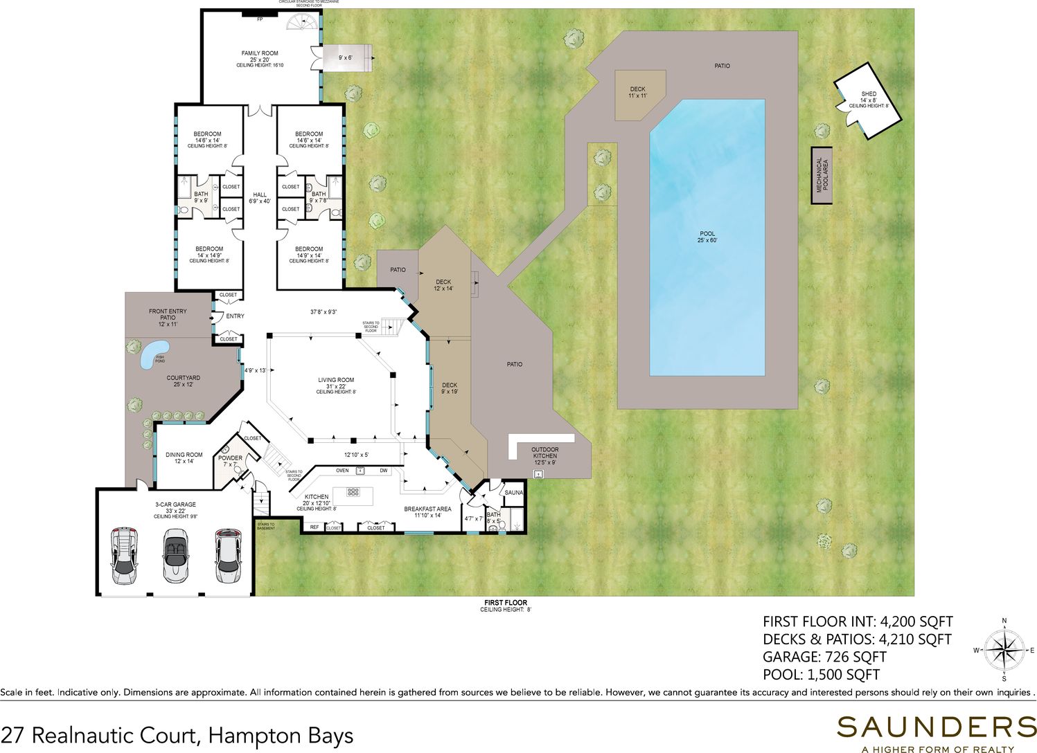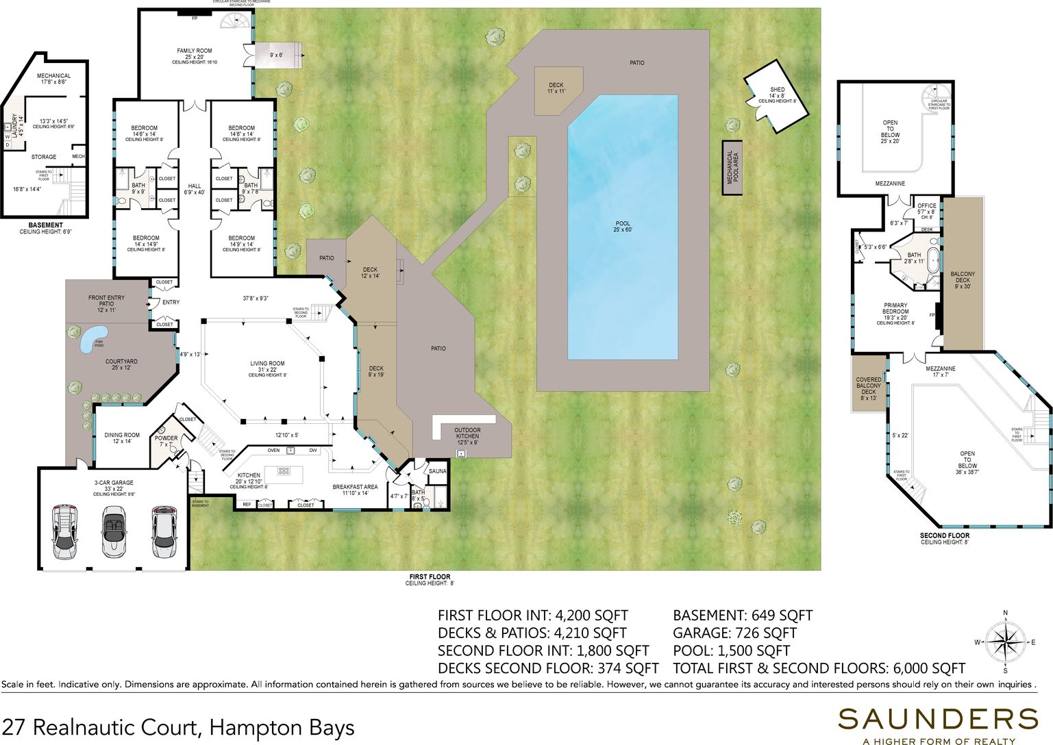 27 Realnautic Court, Hampton Bays - At the end of a cul-du-sac sits this peaceful and spacious 6,000 square-foot contemporary retreat with an extra-large heated Gunite pool. Sited on 1.28 private acres, this sprawling home features five bedrooms, four and one half bathrooms, including an expansive and private second level primary bedroom suite with sitting room and office space. The open and inviting first level offers a 2000 square foot sunke