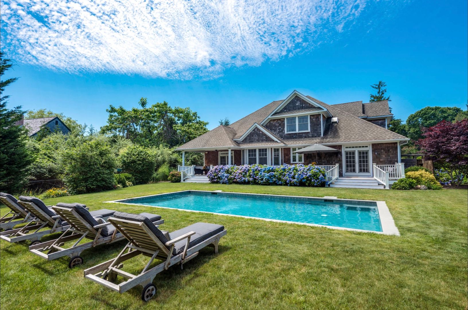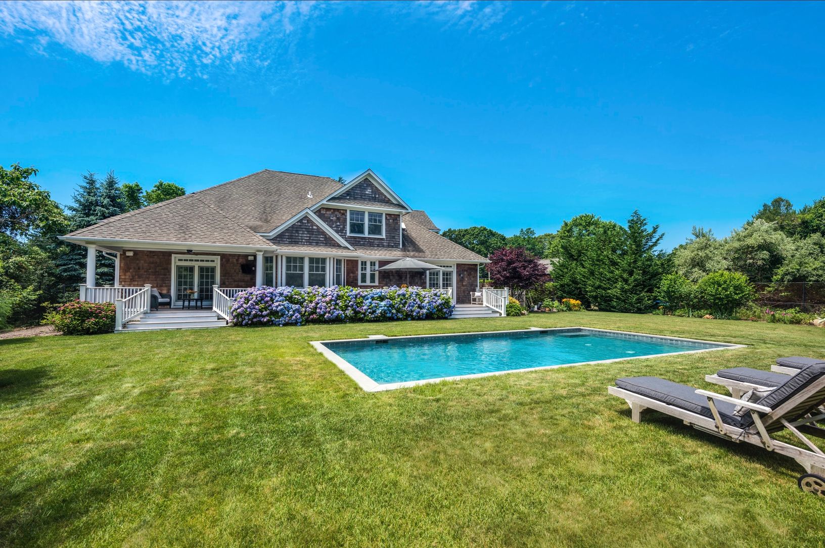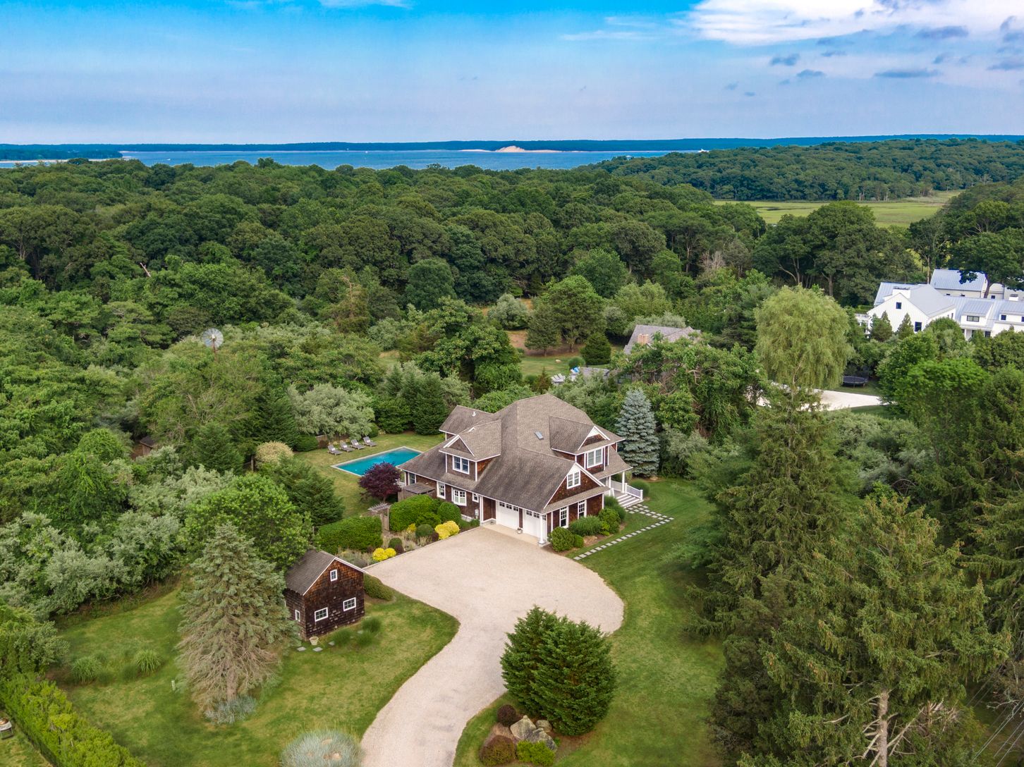 Rare offering in North Haven Village, Sag Harbor. The Windmill House, once part of an expansive farm in North Haven, is sited on over 3 acres with mature landscaping and lush gardens. This picturesque compound features a 4,600 sq. ft. custom-built Traditional home, separate full pool house and a heated gunite pool. The gracious front porch of the main house opens to a bright two-story foyer with high ceilings. The first floor offers a living r