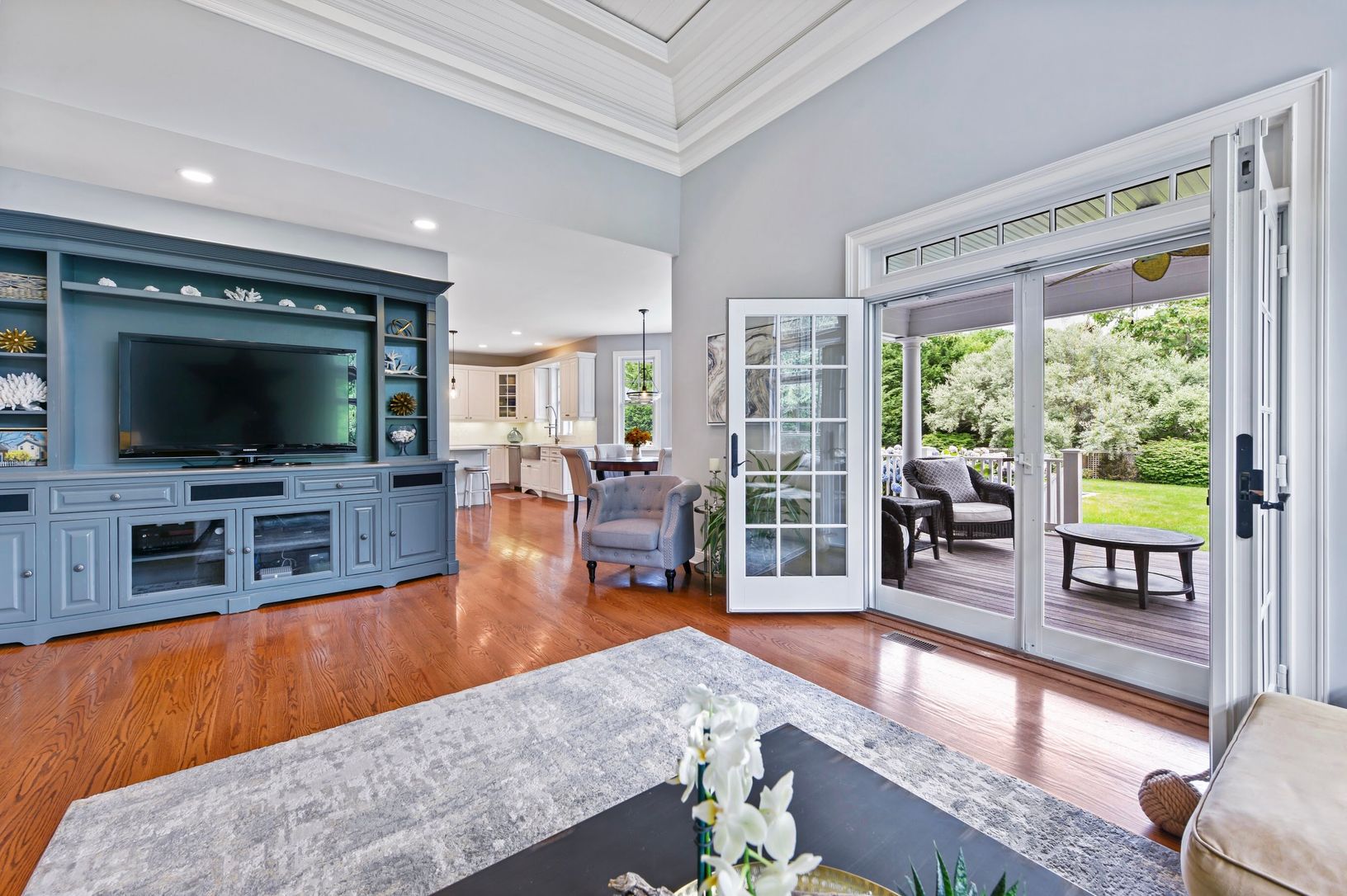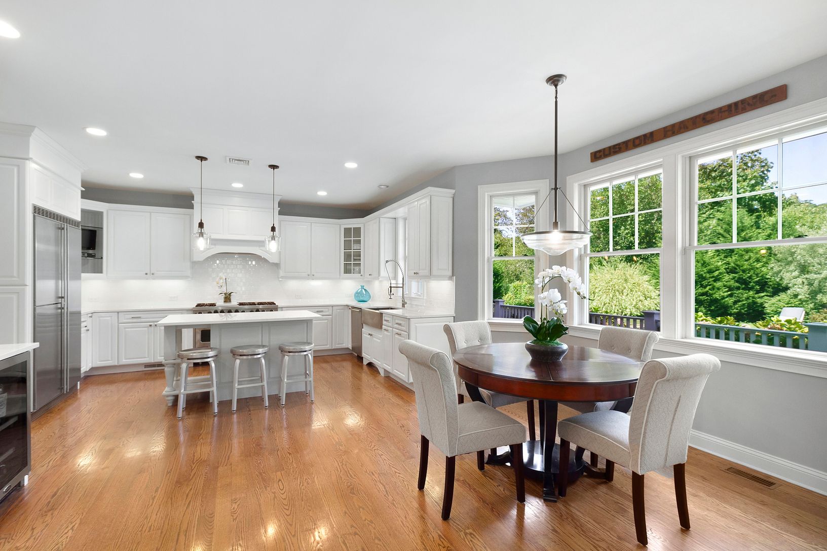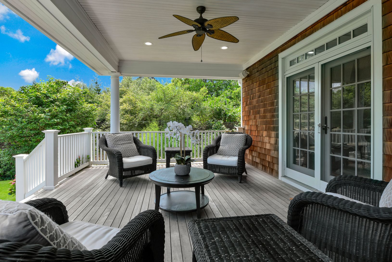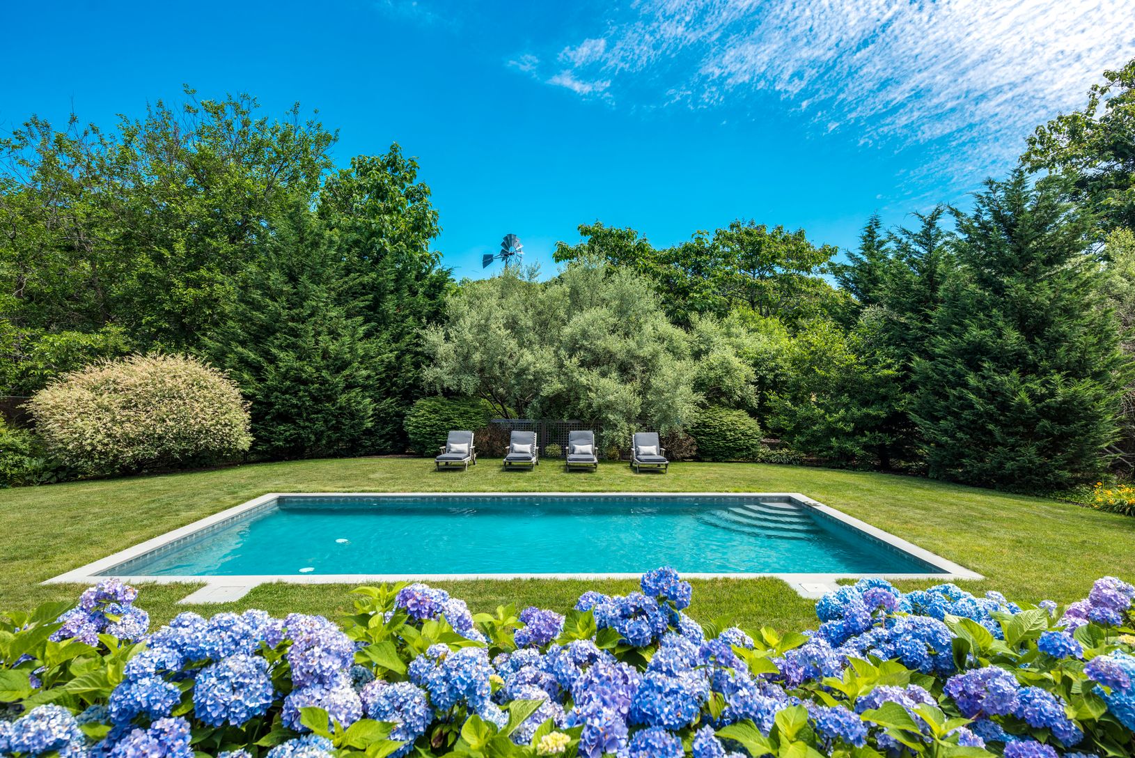 Rare offering in North Haven Village, Sag Harbor. The Windmill House, once part of an expansive farm in North Haven, is sited on over 3 acres with mature landscaping and lush gardens. This picturesque compound features a 4,600 sq. ft. custom-built Traditional home, separate full pool house and a heated gunite pool. The gracious front porch of the main house opens to a bright two-story foyer with high ceilings. The first floor offers a living r