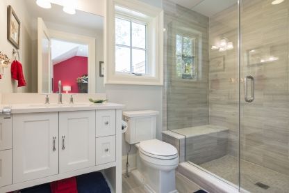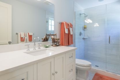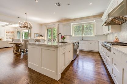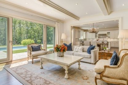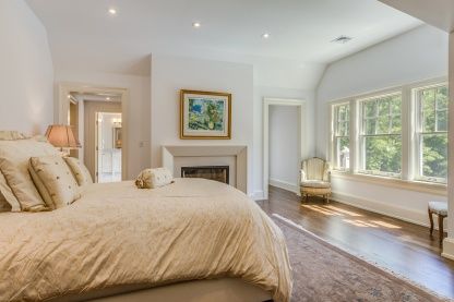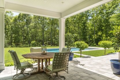 This superb new construction 6,374+/- sq. ft. gabled traditional in a private setting on 1.6 +/- acres is near the East Hampton Golf Club. From a gated entry, an oversized crushed stone driveway with Belgian block leads to ample parking and a 2-car garage. The home has six bedrooms and six and one-half baths, with beautiful wood flooring and custom woodworking throughout. A double height entry opens to light-filled interiors designed for 21st